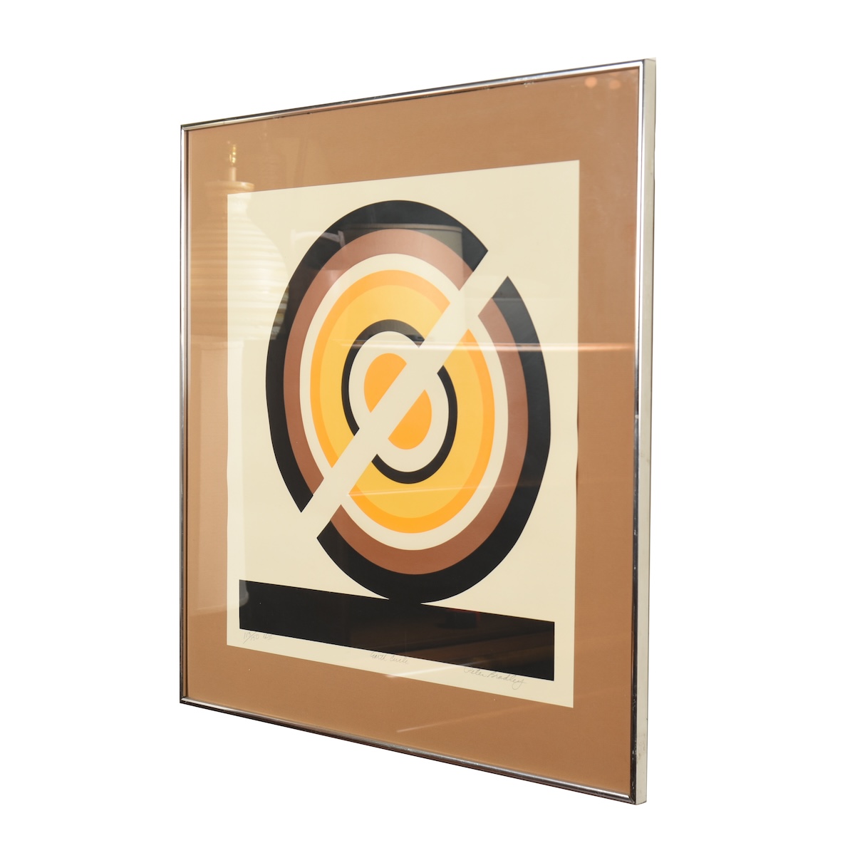 - The “Earth Circle” lithograph 113/150 EDII portraying a geometrical shape with inner rings resembling a geode has been split on the diagonal and floats above a surface