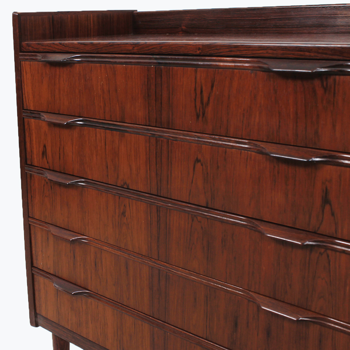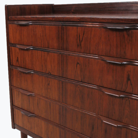 The five drawers each have two handles which are sculptural extensions of the drawer lip. The soft rounded edges & legs are intentionally darker, to play harmoniously with the varying hues in the gorgeous rosewood figuring of the grain. A raised edge around three sides of the top forms a defined surface to contain your valuables.