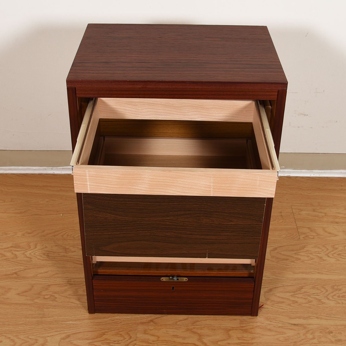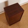 This Danish Modern Rosewood cabinet will come in handy in so many places where you need to manage and organize sundries that need to be stored neatly and securely out of sight. Unlock the vertical tambour door and roll it down to see the three shallow drawers with pull-out frame for hanging file storage above. Great place where you can file away papers, bills, craft items, toys, jewelry — the possibilities are limitless.
