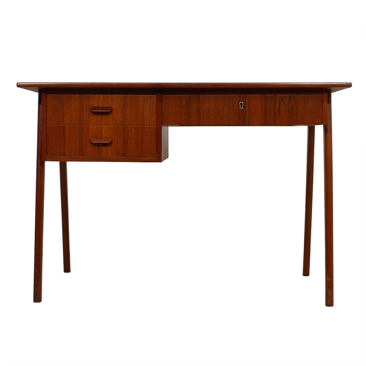 Four splayed legs hold the cabinet of the desk, which has two drawers on the left featuring a sculpted handle, and one locking drawer on the right where you sit. Its elegant simplicity is breathtaking. Perfectly sized for a laptop, this lovely desk will enhance your home office, bedroom or library.