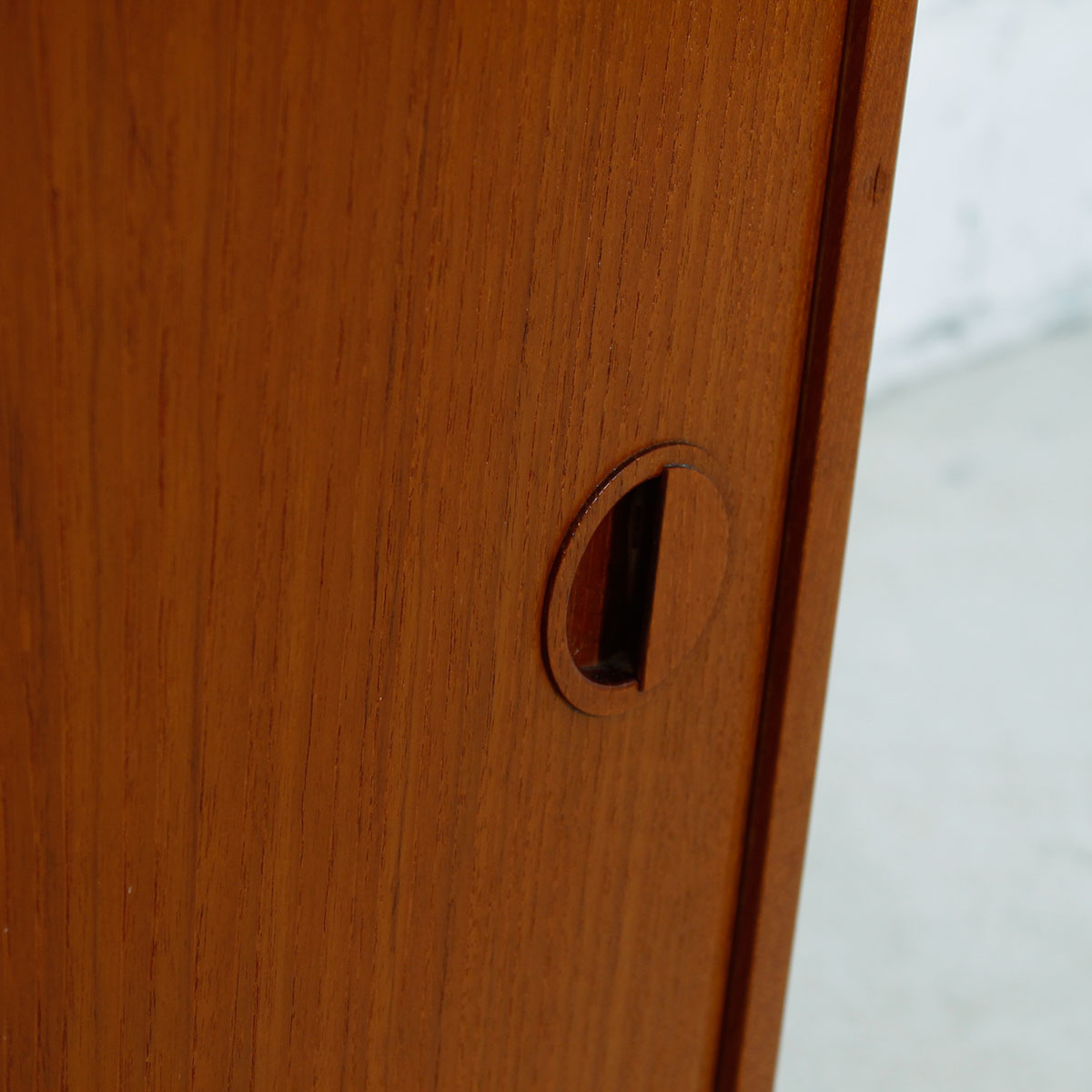 This is a little gem! We are pleased to offer this small teak Danish Modern cabinet, which is both aesthically and functionally beautiful. An excellent choice for media storage or as a bar cabinet, it features four adjustable shelves and two sliding doors. Measurements are approximate.