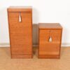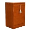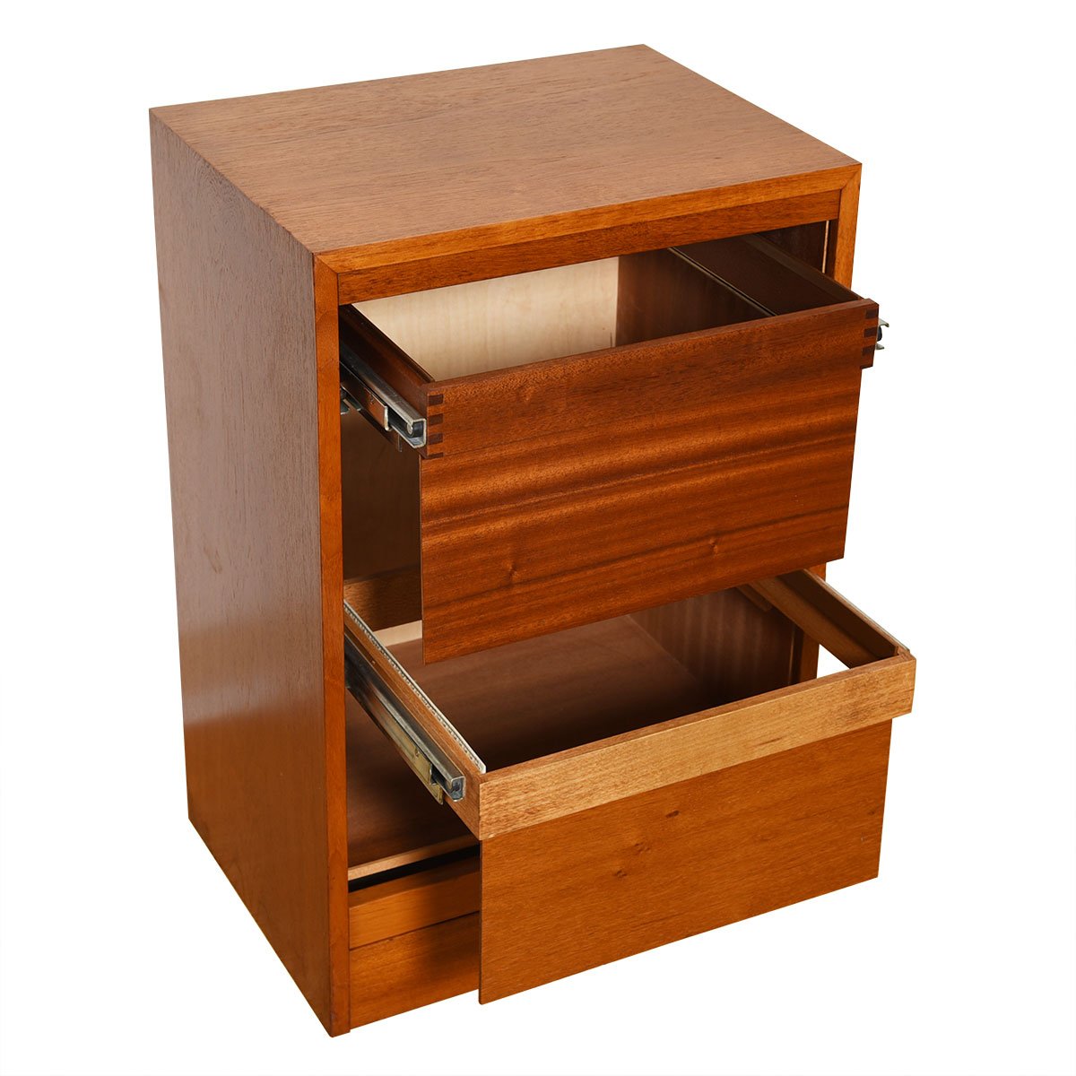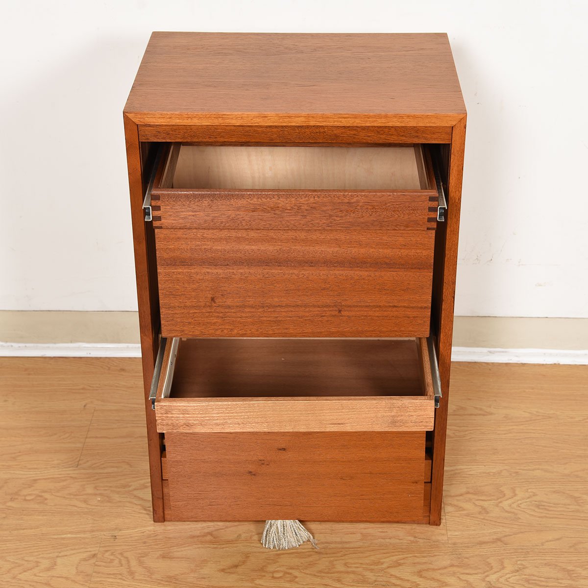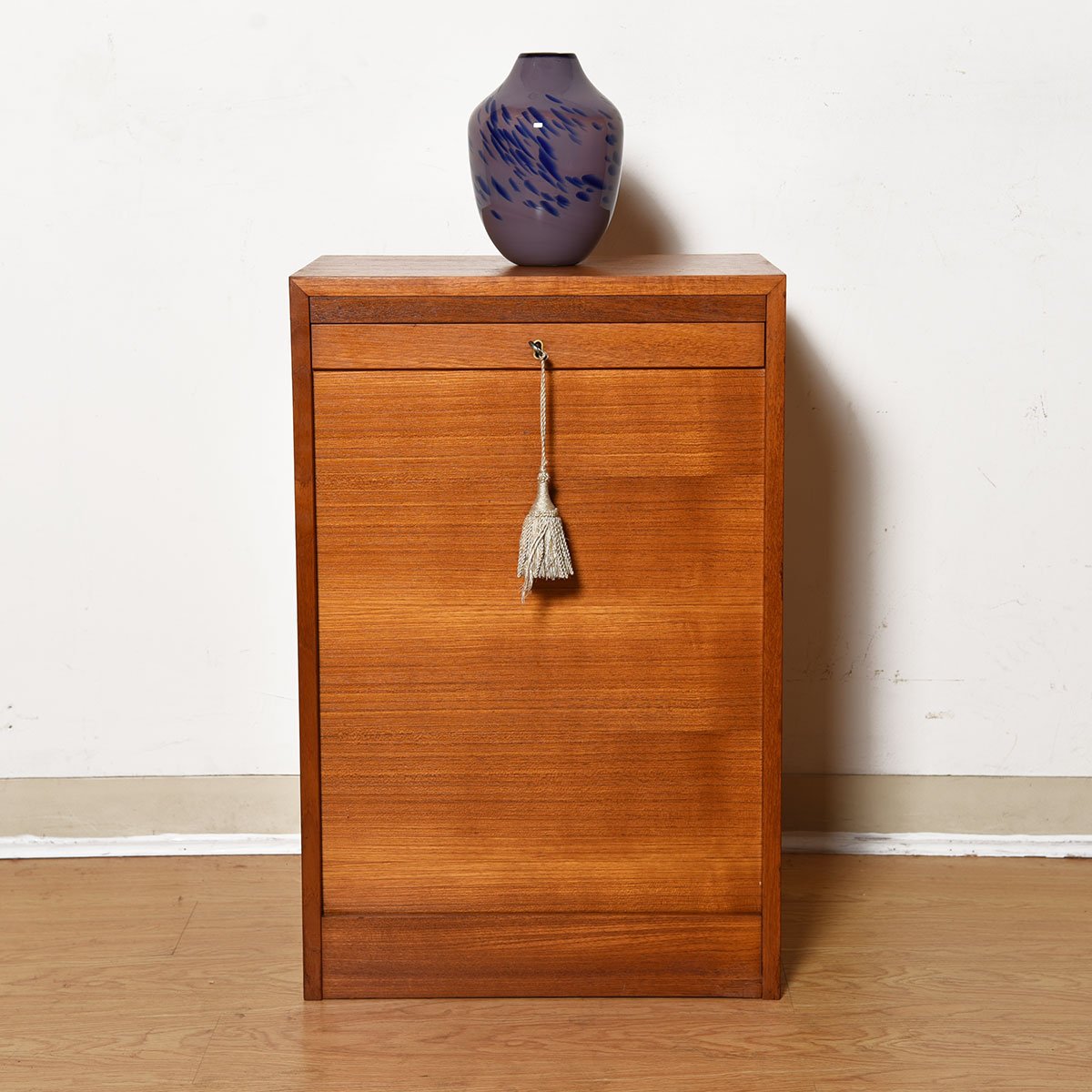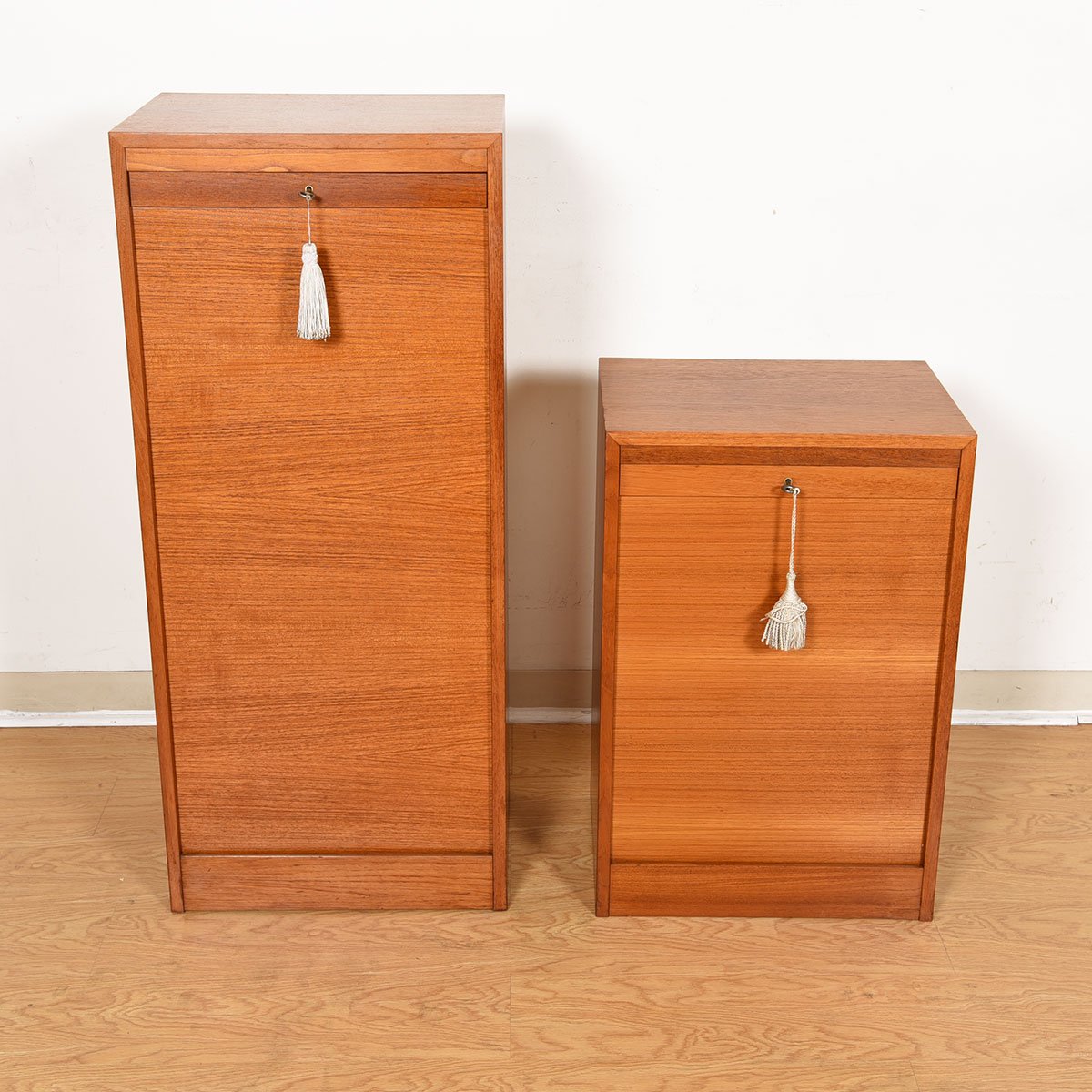Upgrade your office with this Danish Modern filing cabinet. Pull up the tambour door to disguise the two hanging file drawers insdie. The cabinet locks to keep your documents safe. The teak is a beautiful dark honey color. Coordinates beautifully with several of our teak desks to create a stylish work space.