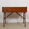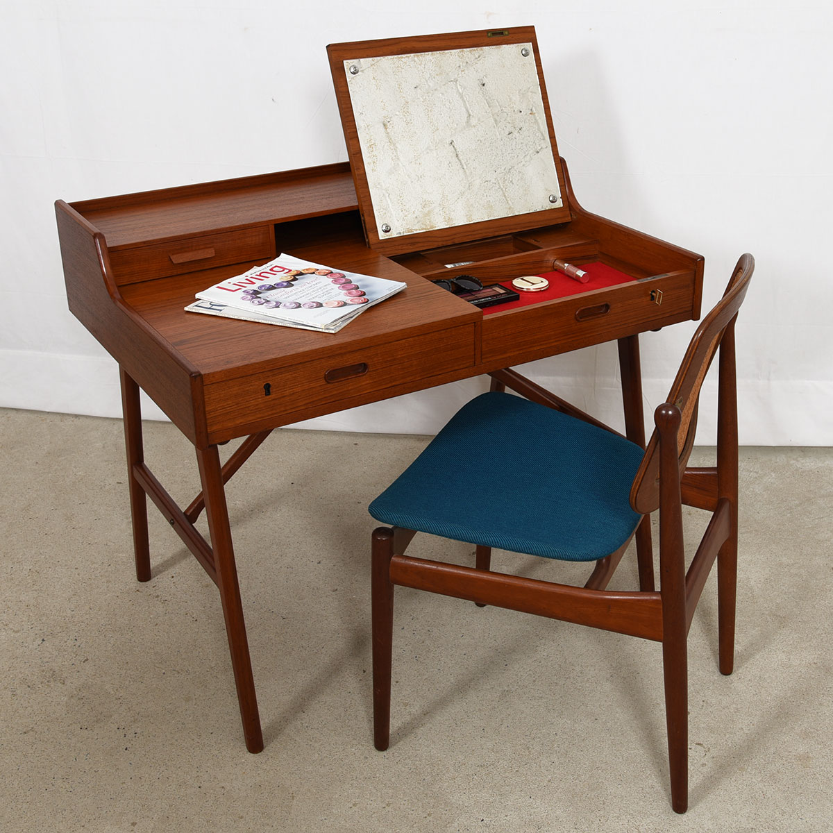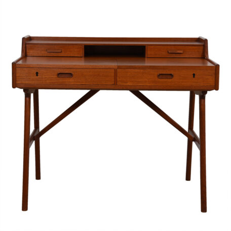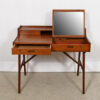 Leave it to the Danes to design ingenious furniture that is multi-functional! This is a teak desk that also serves as a vanity. The writing surface is split in two and the right side lifts up to reveal a mirror on its back.