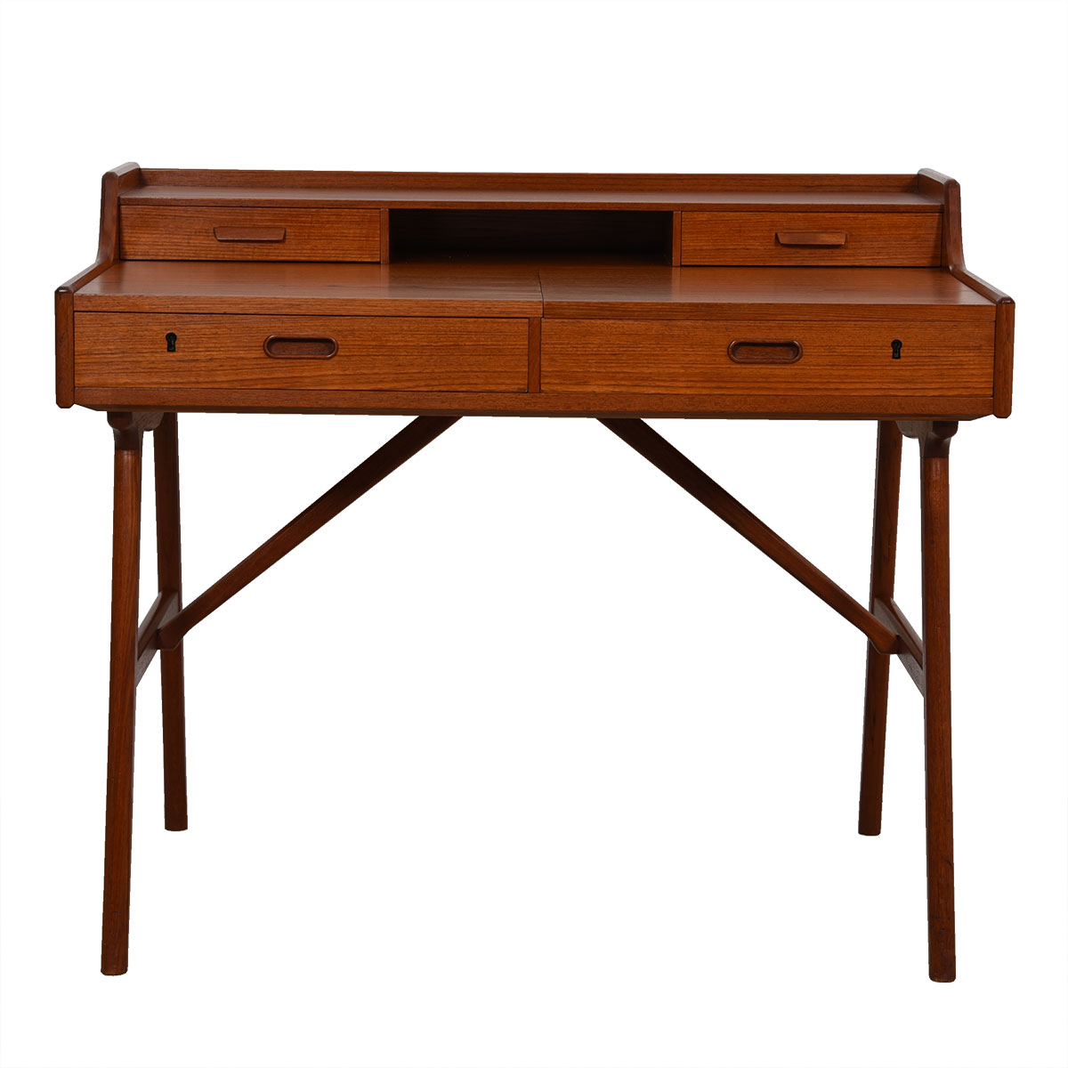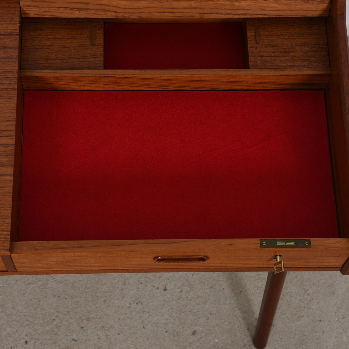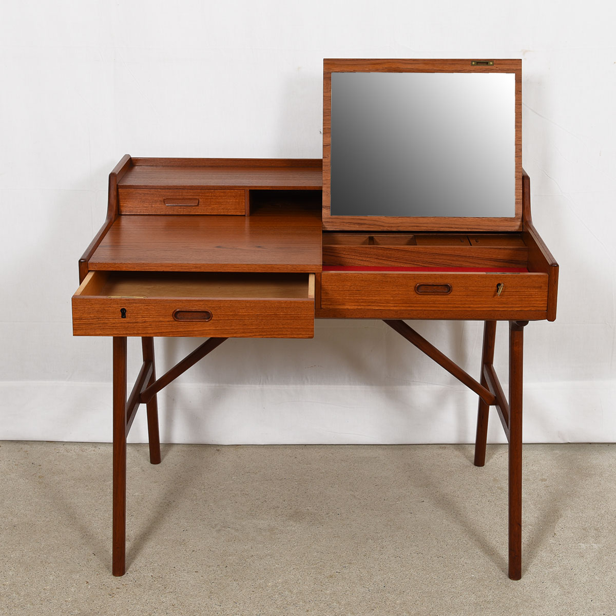 To arrange purchase or for more information about the Petite Danish Teak Split Drawer Arne Wahl Iversen Locking Desk / Vanity please call us at 202.882.1648 or email us at info@modernmobler.com