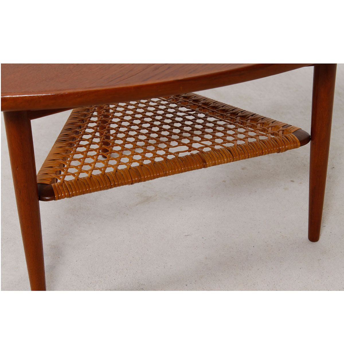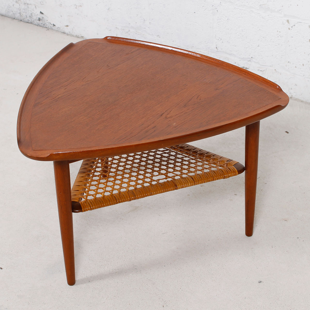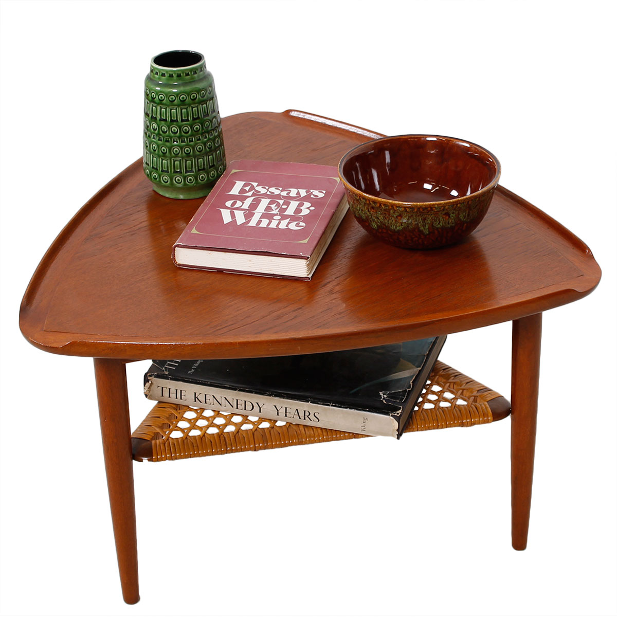 A Highly Desirable ‘Guitar Pick’ Shape, Raised Lip Edges, and Caned Shelf. This Danish Modern Classic Table By Poul Jensen For Selig, Denmark (Red Selig Maker’s Mark on Bottom), Is Sure To Make Your Friends Envious!