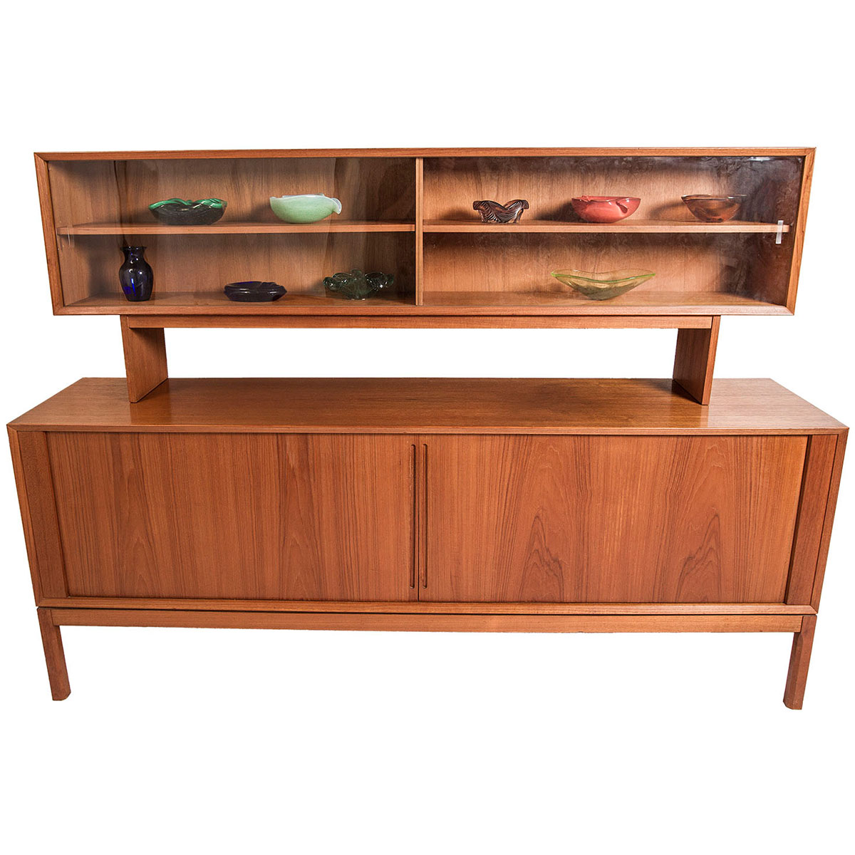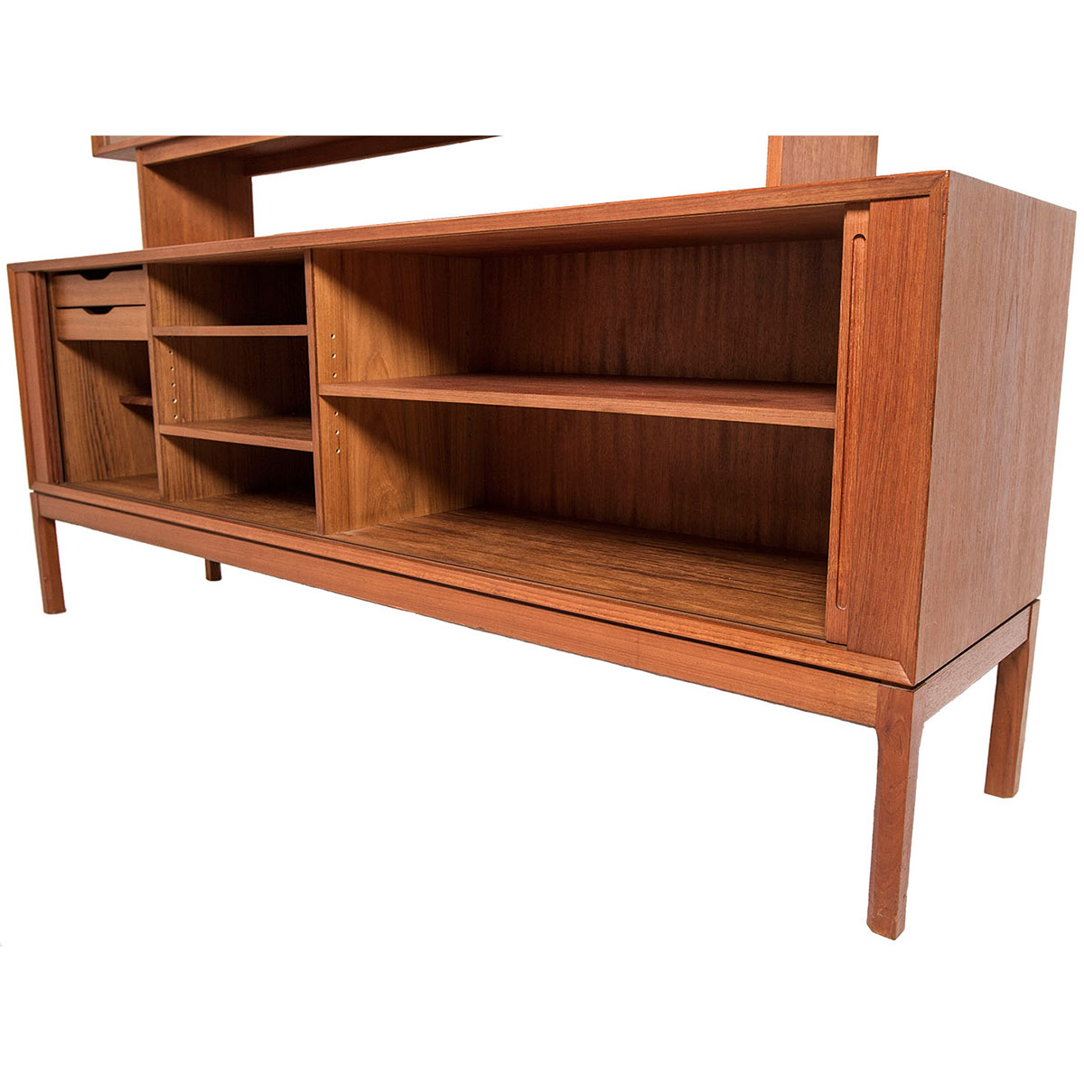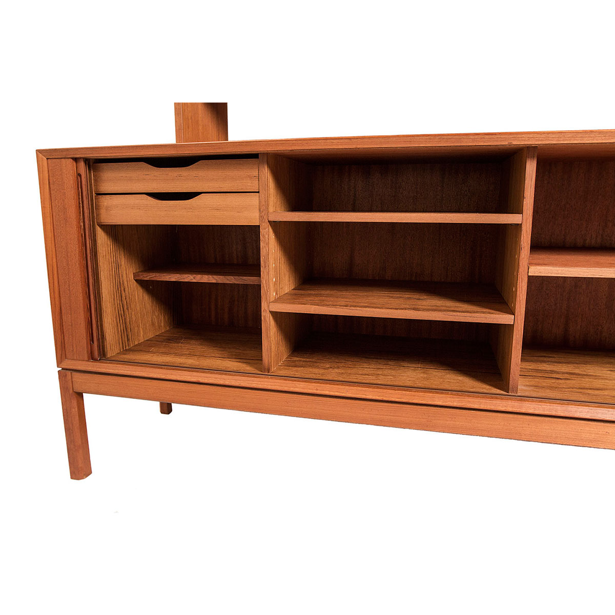 A Seldom Seen Large Storage Piece By Aksel Kjersgaard / Odder, Denmark. This Tambour Door Room Divider Comes Complete w/ A Removable Display Top; and Is Fully Finished On The Back To Double As A Room Divider If Needed. Its 3 Storage Bays Below Have 3 Adjustable Shelves For Various Types Of Storage, 2 Felt Lined Drawers, And A Shallow Fixed Shelf That Is Inset Perfectly To Accommodate Taller Items Such As Bottles Of Your Favorite Spirits! The Top Display Cabinet Has 2 Adjustable Wood Shelves & Sliding Glass Doors. It Can Be Removed To Be Used As A Separate Storage / Display Piece.