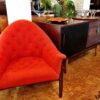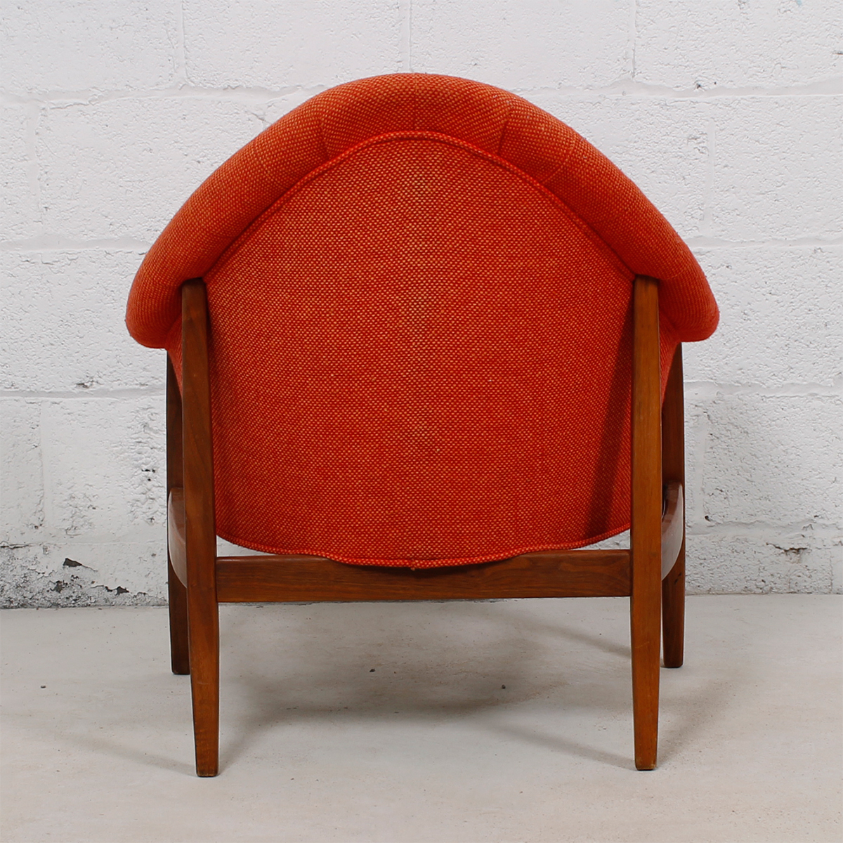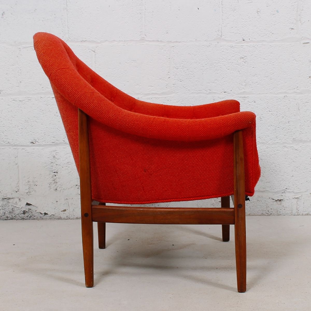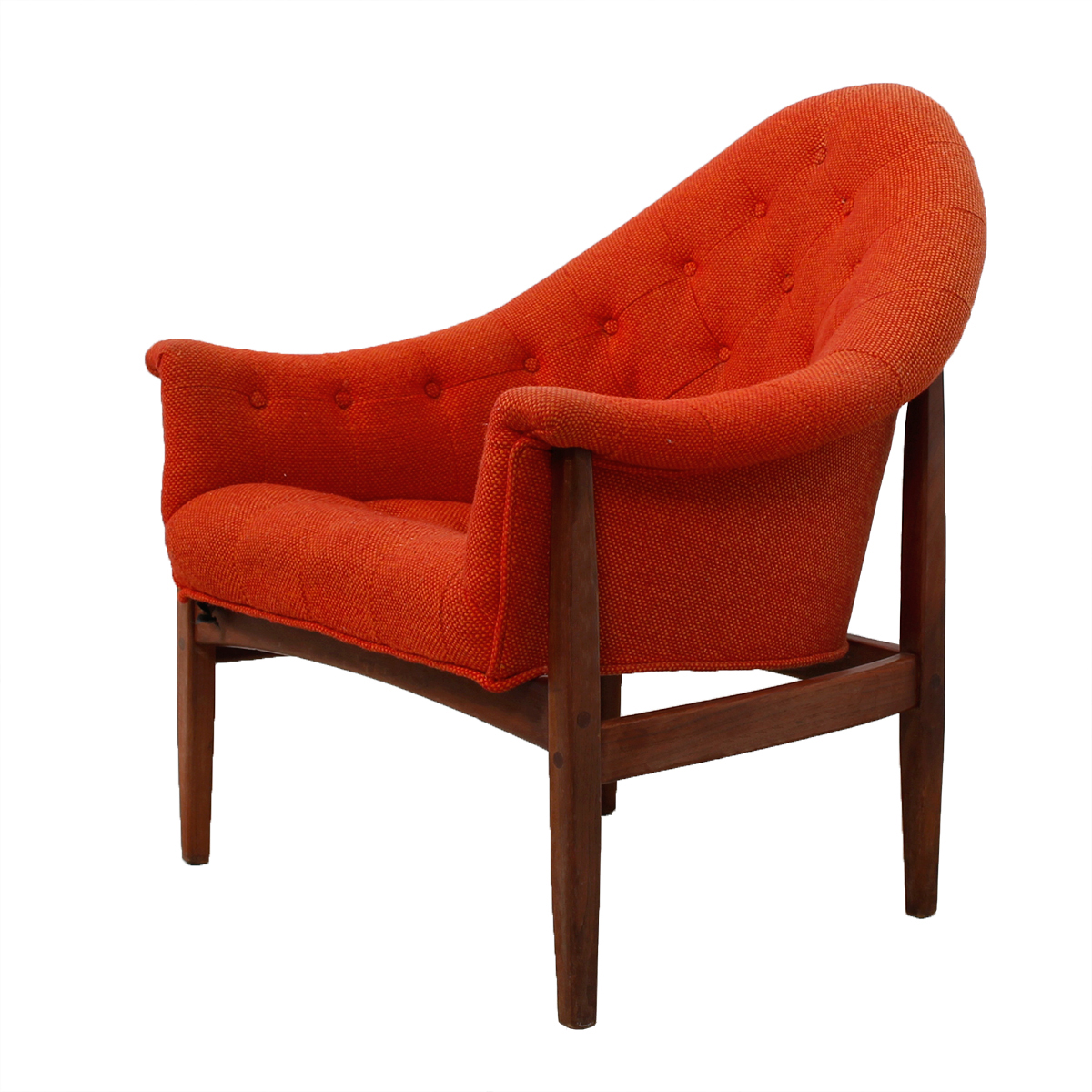 This fabulous and rare find is a lounge chair designed in the ’60s by Milo Baughman for Thayer Coggin. Nestled in the exposed walnut frame is a padded chair with a rounded point back and swooping, curved arms. The gorgeous flame-colored fabric is a sturdy tweed. Button tufting starts on each arm and then cascades down the back and spills onto the seat.