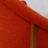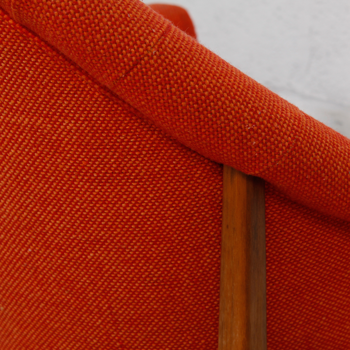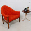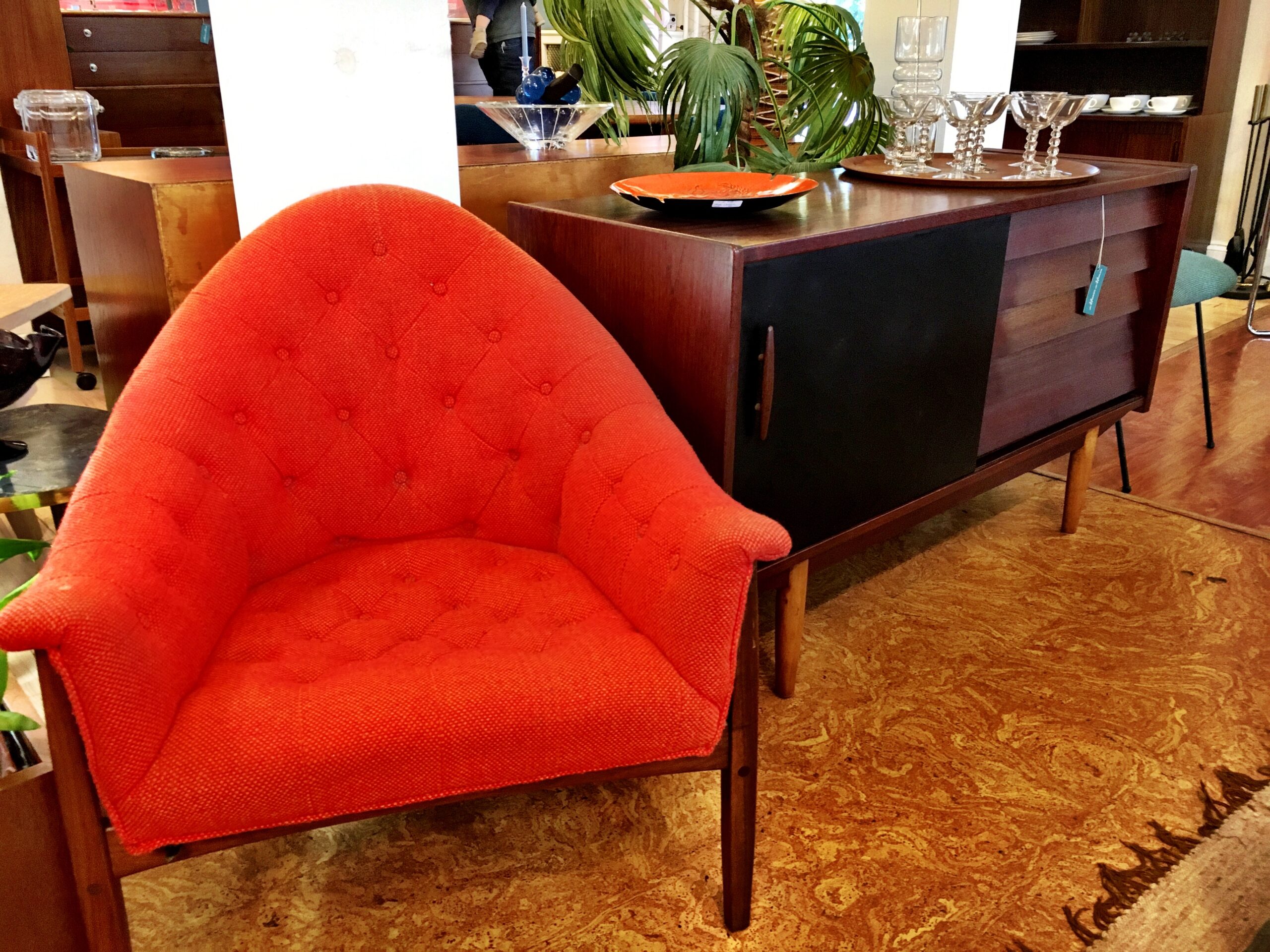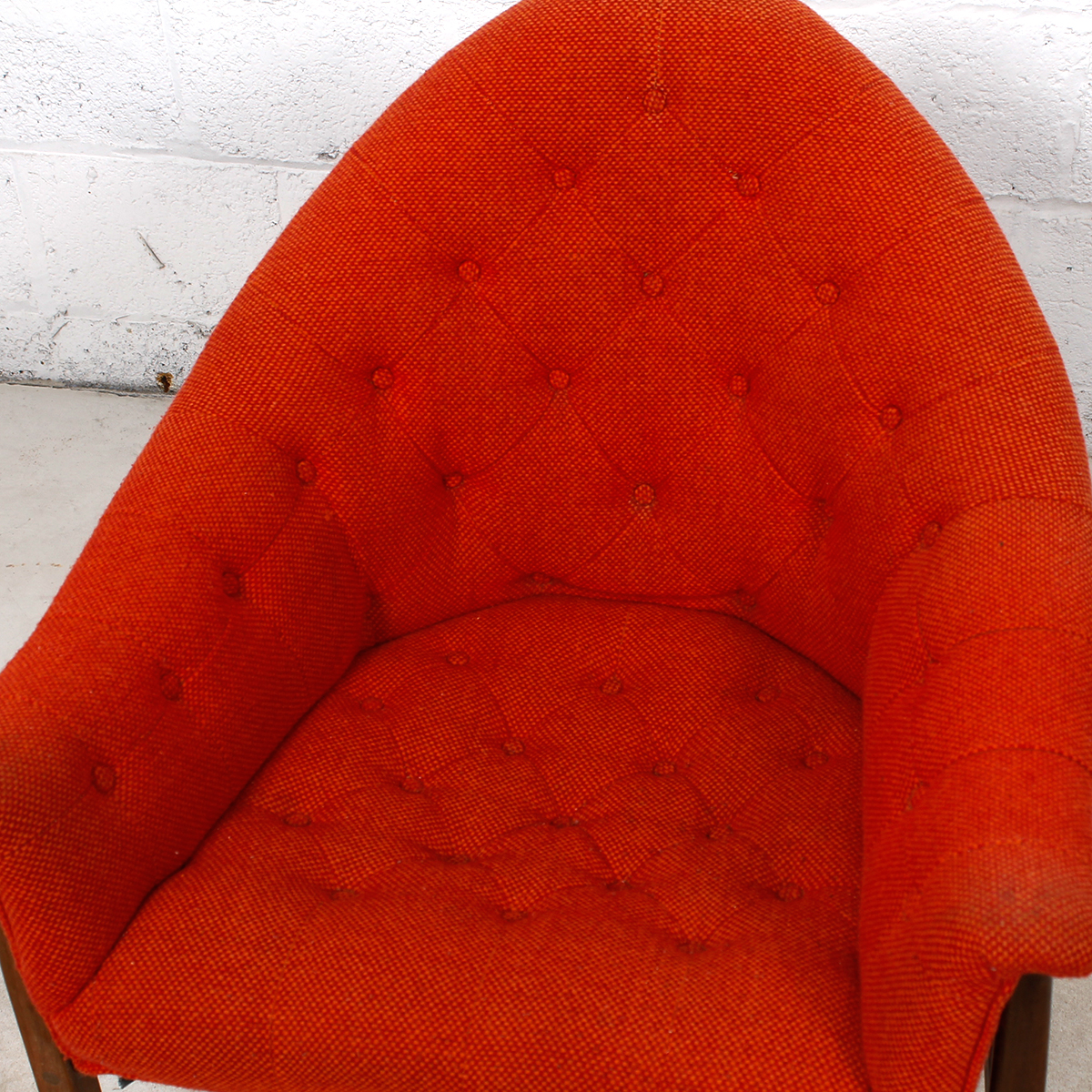 This fabulous and rare find is a lounge chair designed in the ’60s by Milo Baughman for Thayer Coggin. Nestled in the exposed walnut frame is a padded chair with a rounded point back and swooping, curved arms. The gorgeous flame-colored fabric is a sturdy tweed. Button tufting starts on each arm and then cascades down the back and spills onto the seat.