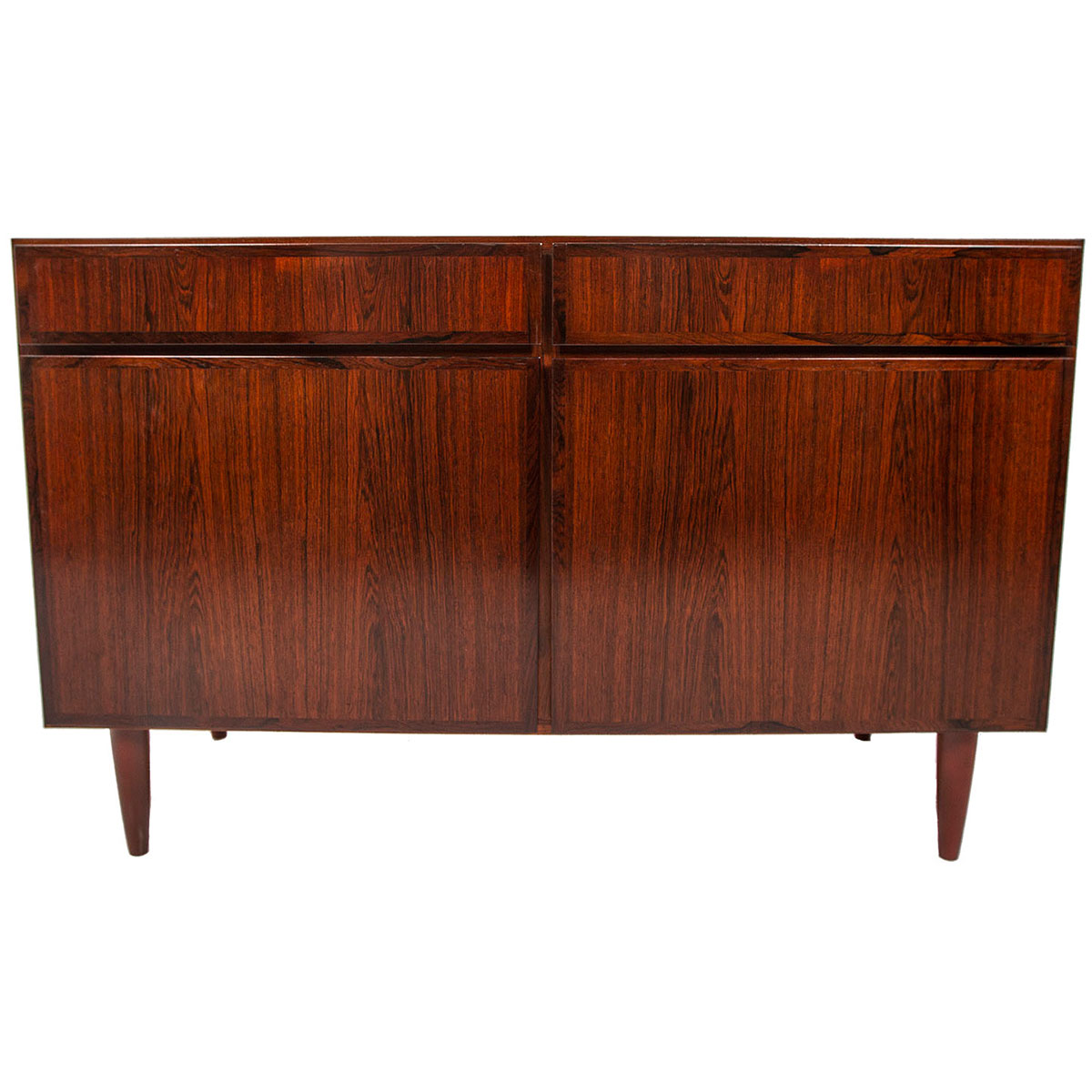 Highly Desirable Gunni Omann for Omann Junior Mobelfabrik Model #3. This Versatile & Compact Storage Cabinet @ Only 47″ Allows it to Easily Accommodate Living in the City. Two Top Drawers & Adjustable Shelves Below Behind Two Bottom Doors. Wonderful Rosewood Grain.