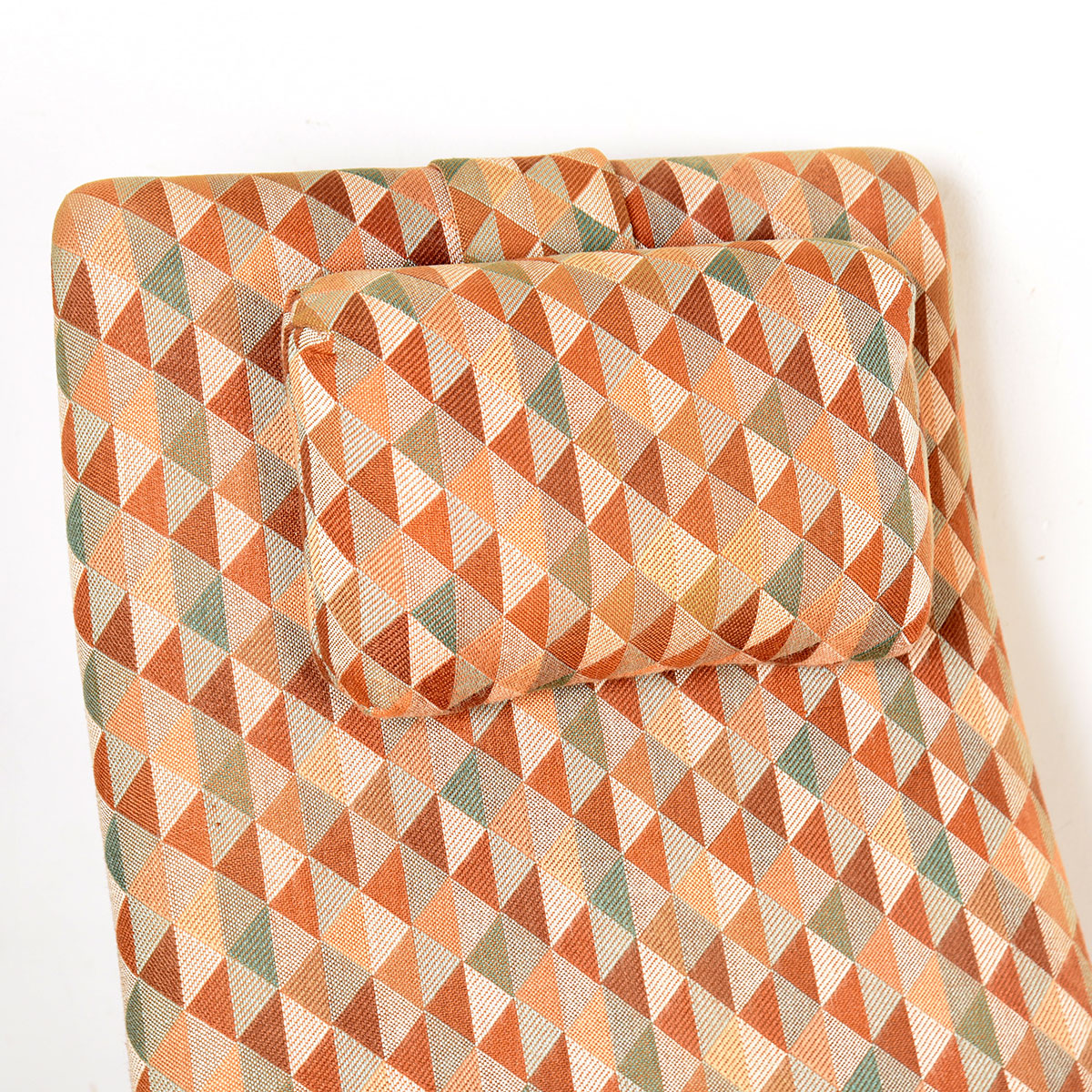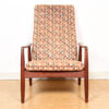 This upholstered reclining lounge chair features an open teak frame that cradles the back and seat. The armrest has a beautiful shape. Comes with a matching ottoman for the complete stretching out experience.