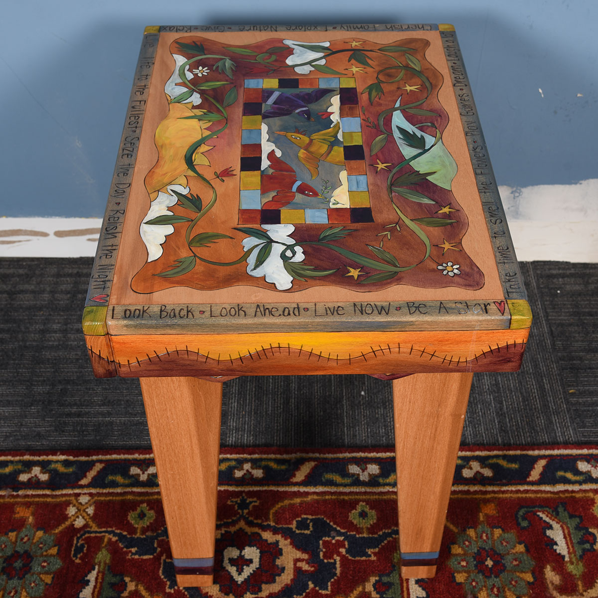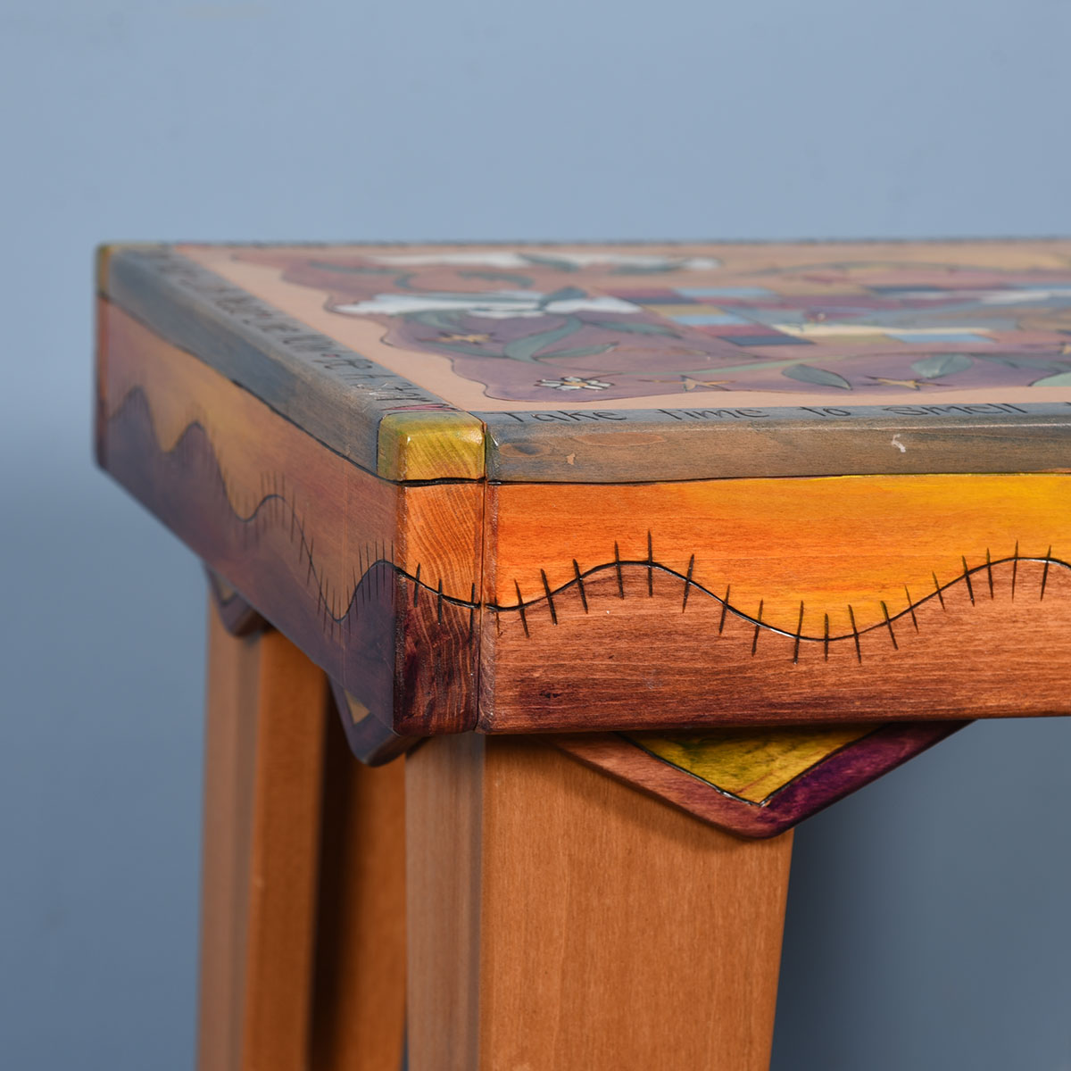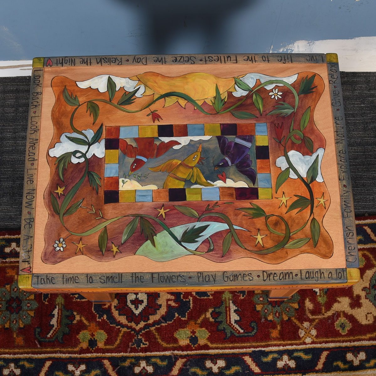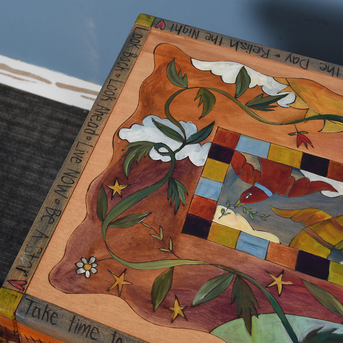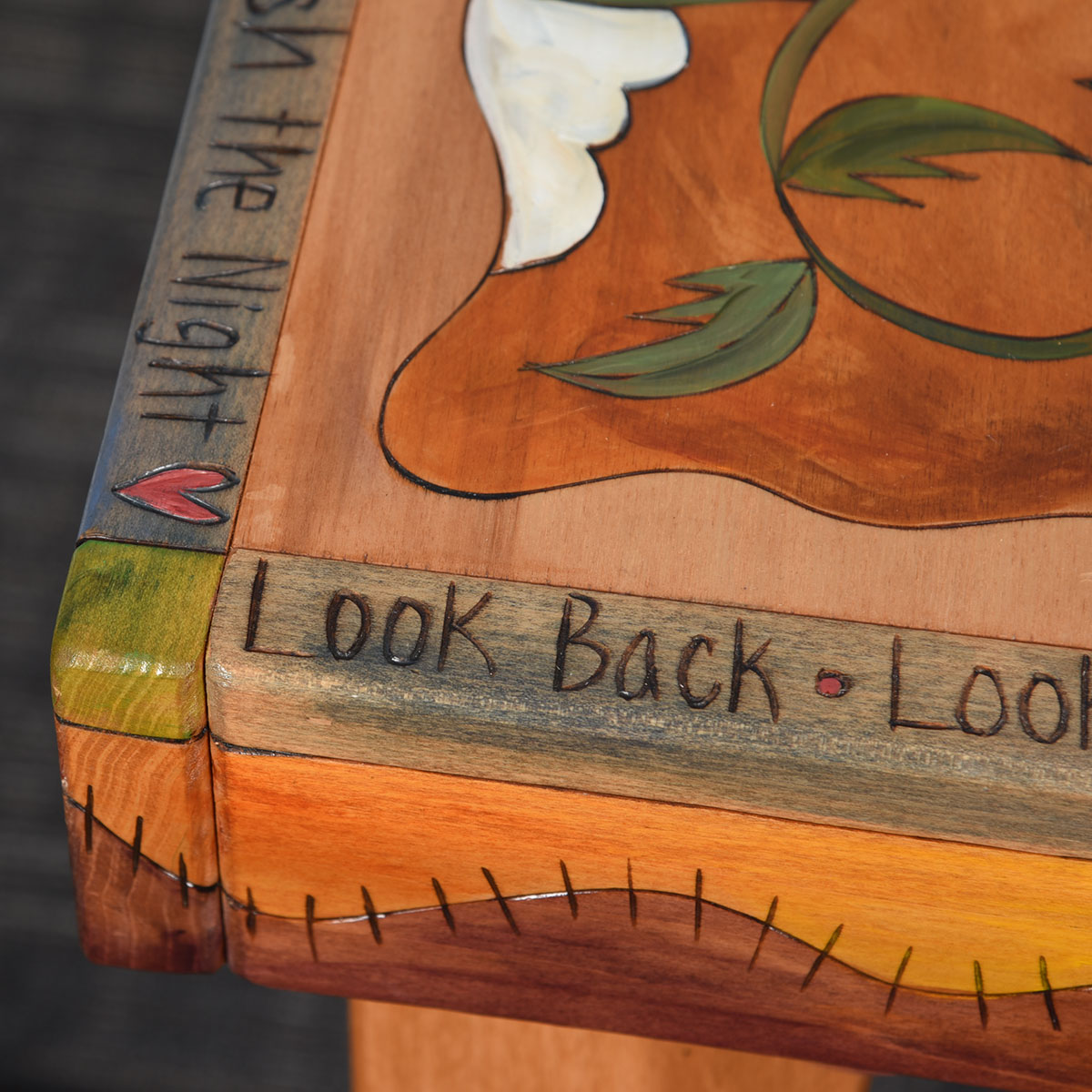- Designed with hand drawn imagery, etched contouring and vibrantly blended paint