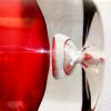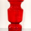 This striking vase, with its interesting three part column, is made of deep red glass. It is quite substantial and the base is clear with a bubble. Possibly Swedish.