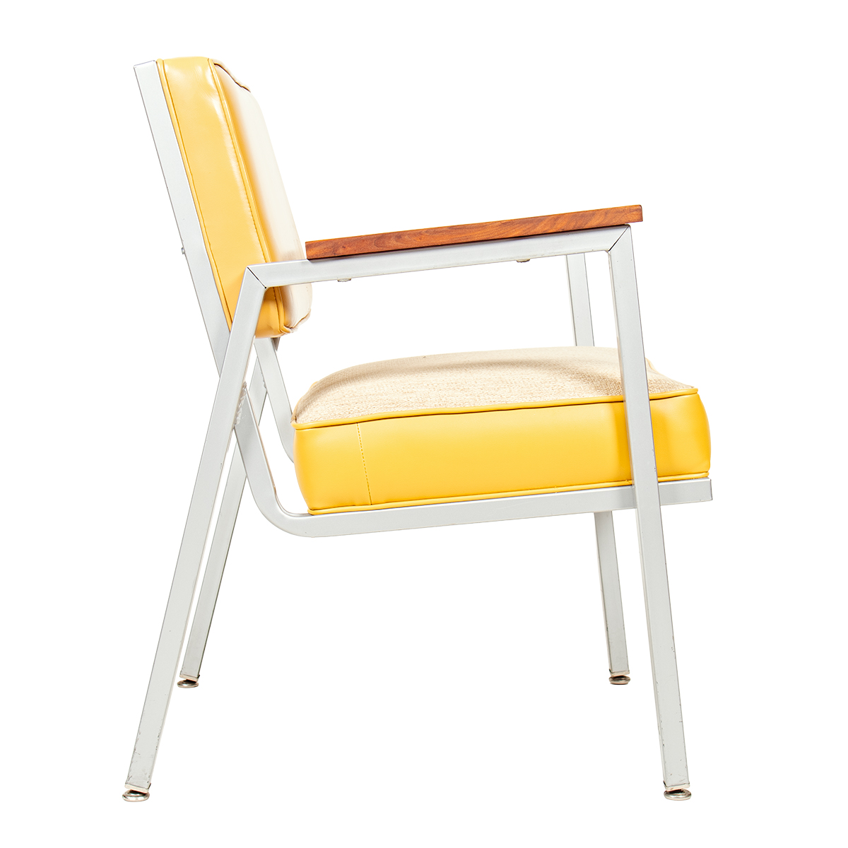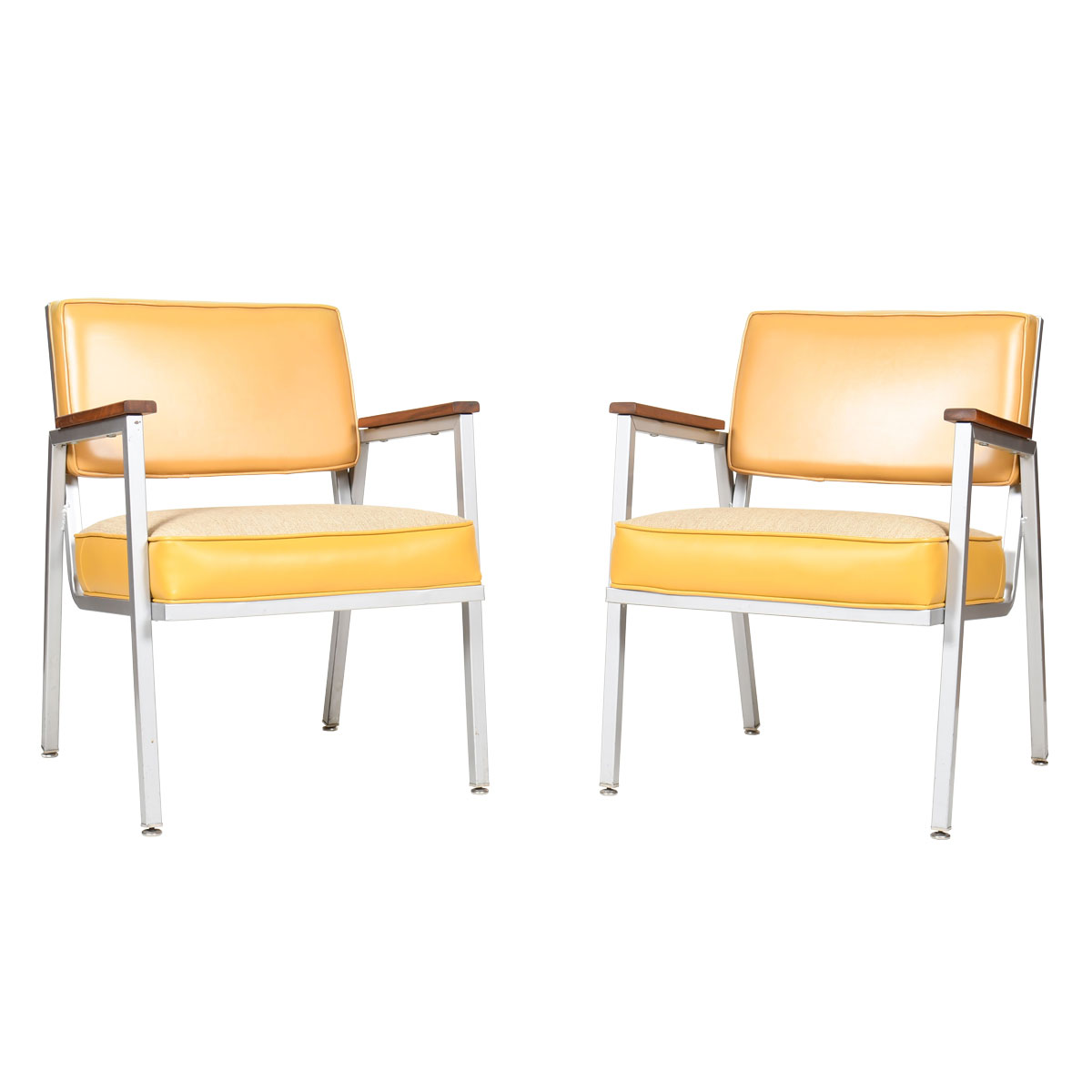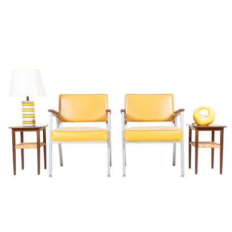 Reupholstered in a Sunny Yellow Upholstery — Chrome Frame MCM Accent Chairs w Walnut Armrests