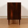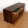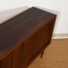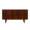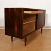 Wonderful compact cabinet with two sliding doors that open to storage space with two adjustable shelves (additional shelves may be available). A shallow drawer on the upper left provides storage for smaller items. Perfect for use as a media cabinet, office credenza or a dining room sideboard. Luscious rosewood takes the spotlight on this minimalist Danish Modern piece.