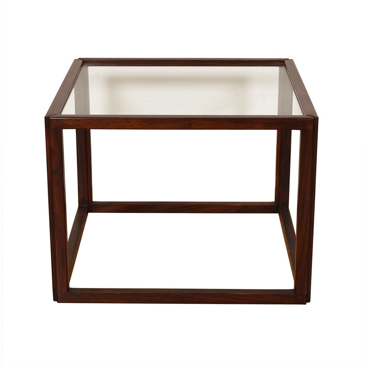 A frame of rosewood holds one pane of glass, forming the top of this luxurious minimalist accent table. The sides and bottom of the cube are open adding to its space-saving quality. The rosewood is gorgeous, having aged to the perfect patina. A wonderful table of timeless appeal that will fit into nearly any room and decor.