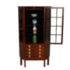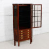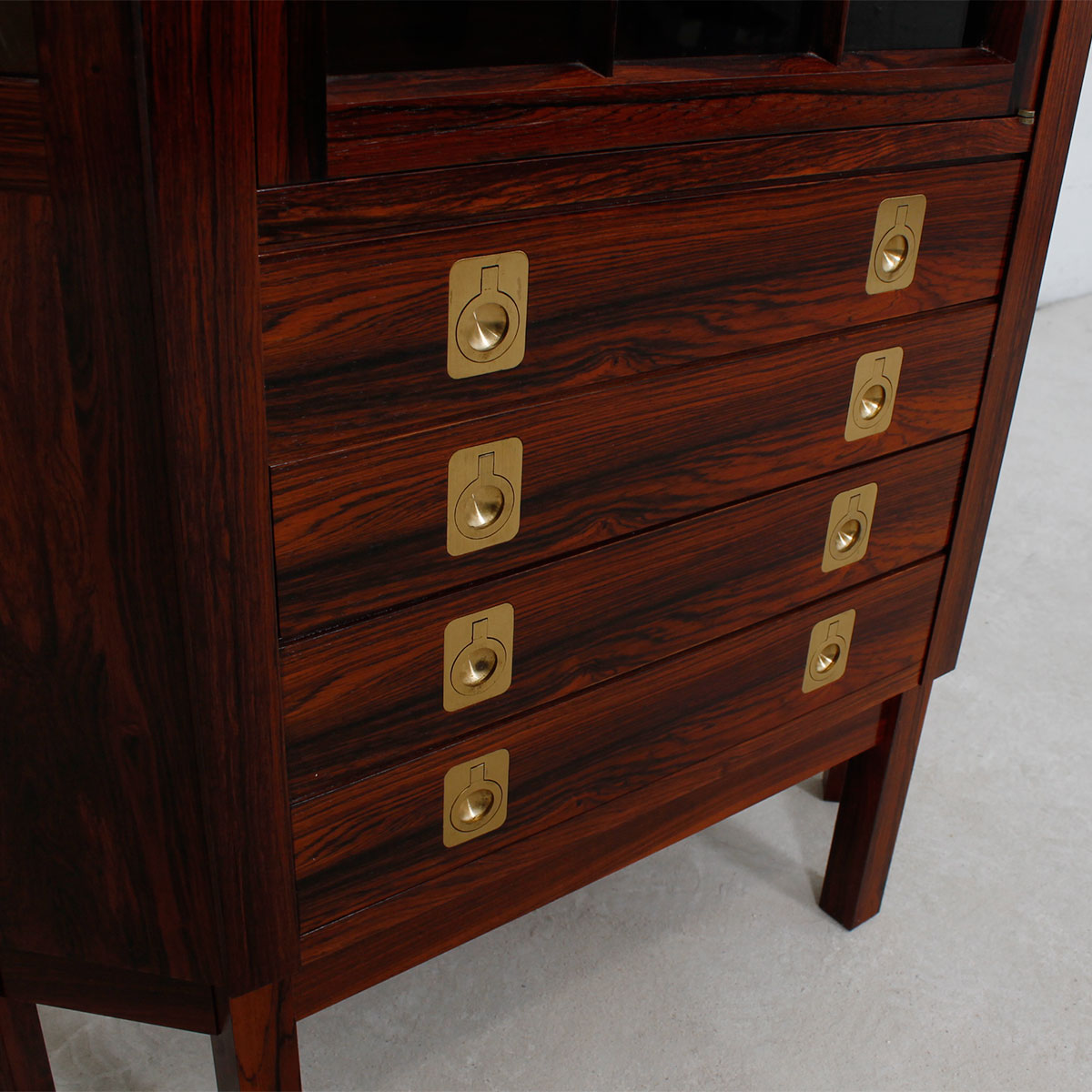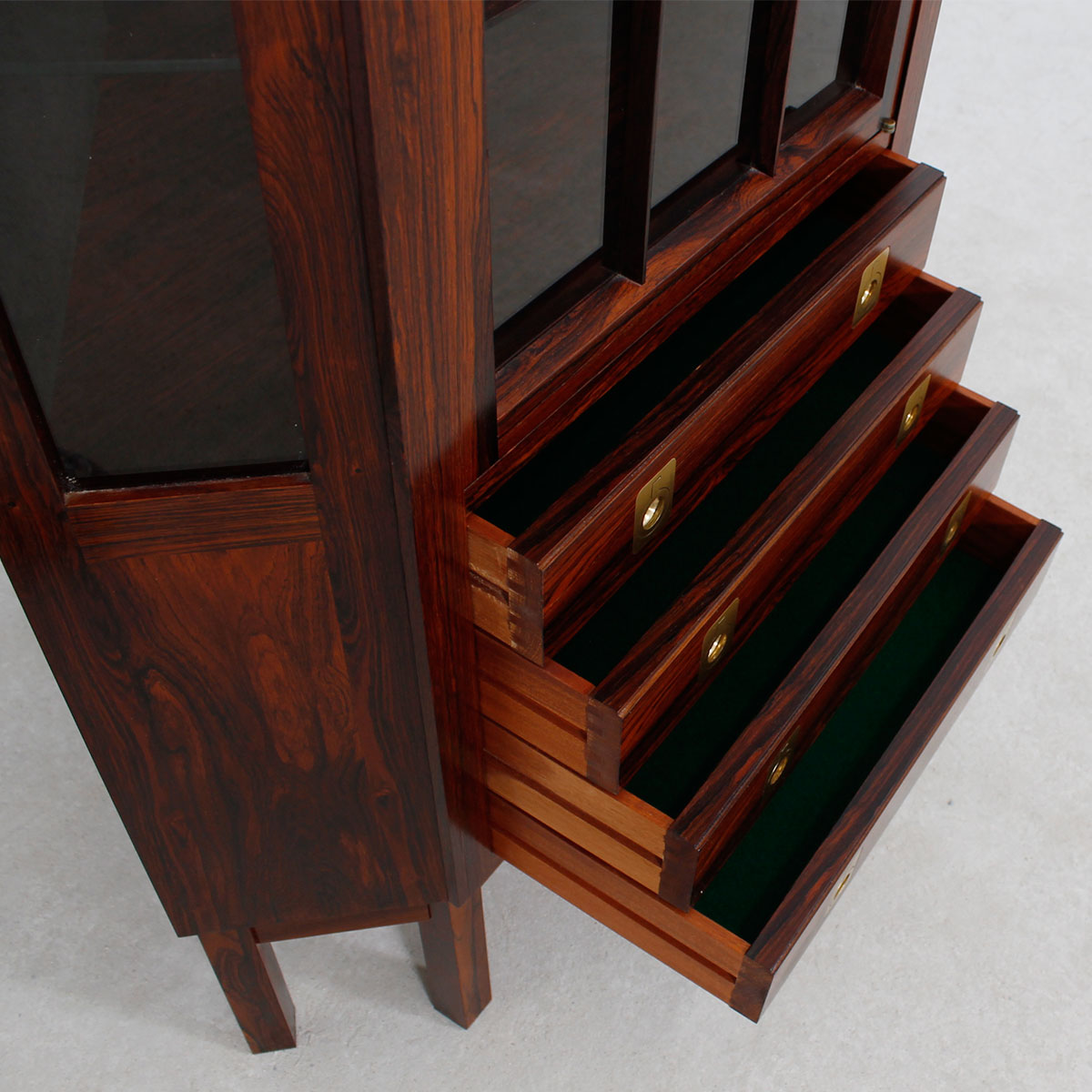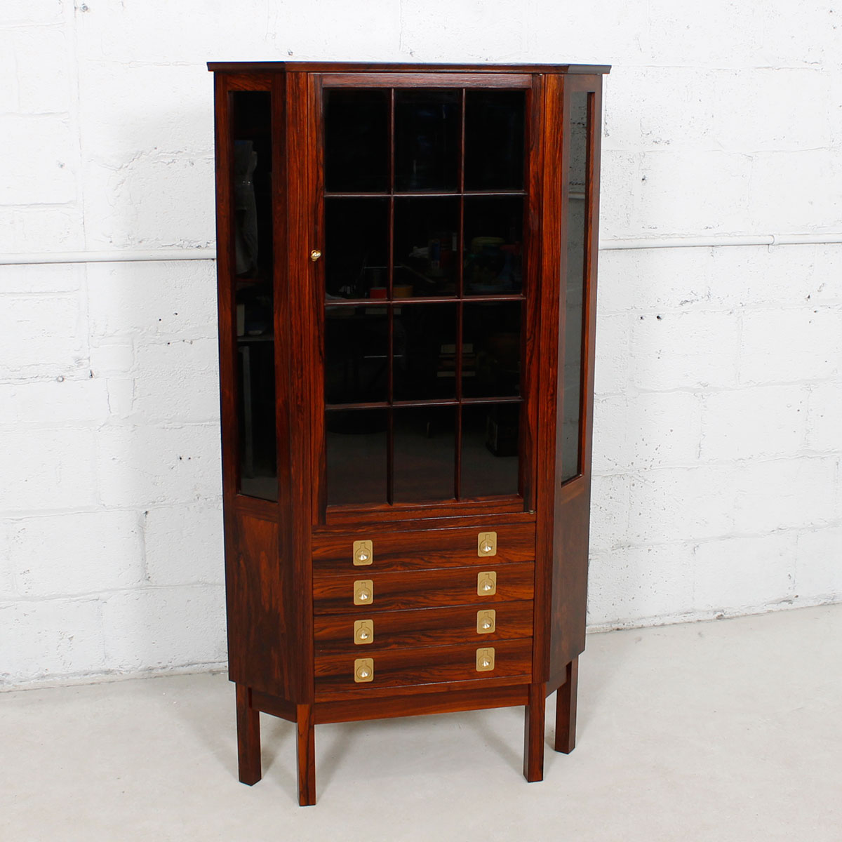 A beautiful Rosewood lighted corner cabinet designed, made in Norway. Cabinet has two locking glass-fronted doors, glass side panels, interior glass shelves, and four drawers with brass pulls.