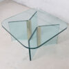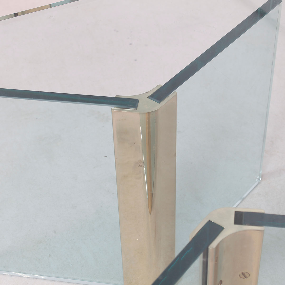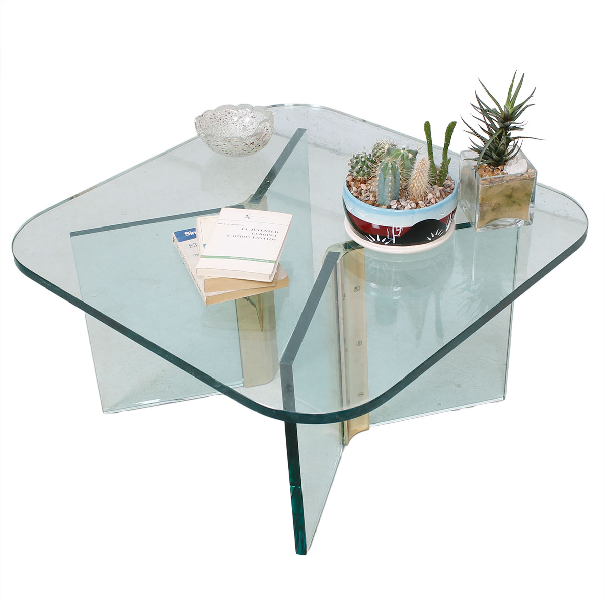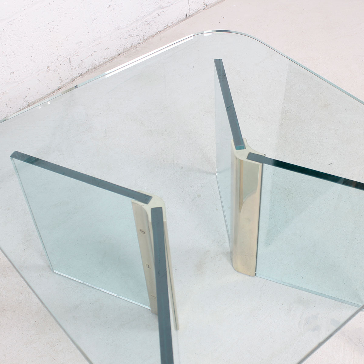 Table has two moveable arrowhead-shaped bases on which the thick glass top sits. Each base has a brass joint heightening the effect of the table when viewed from above. Bases can be positioned facing in or out to create different looks. Simple yet dynamic design.