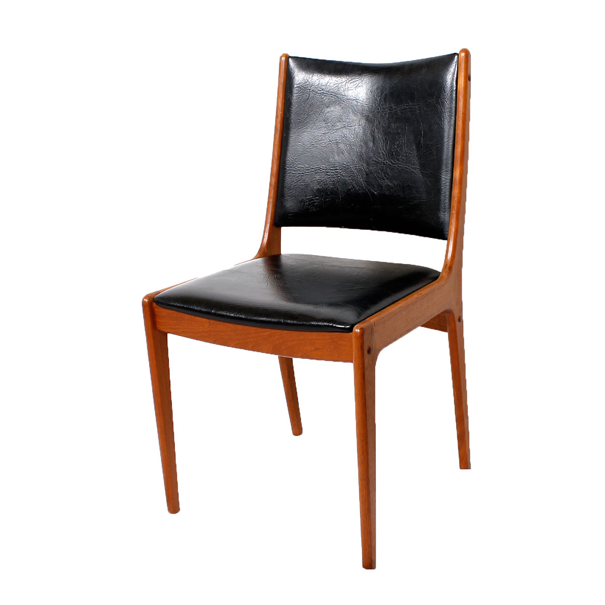 A set of four Johannes Andersen for Uldum Mobelfabrik Danish Teak Dining Chairs. In warm solid teak. Upholstered In Their Original Black Leatherette. As Always, Plenty of Dining Tables to Choose From.