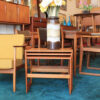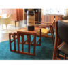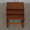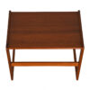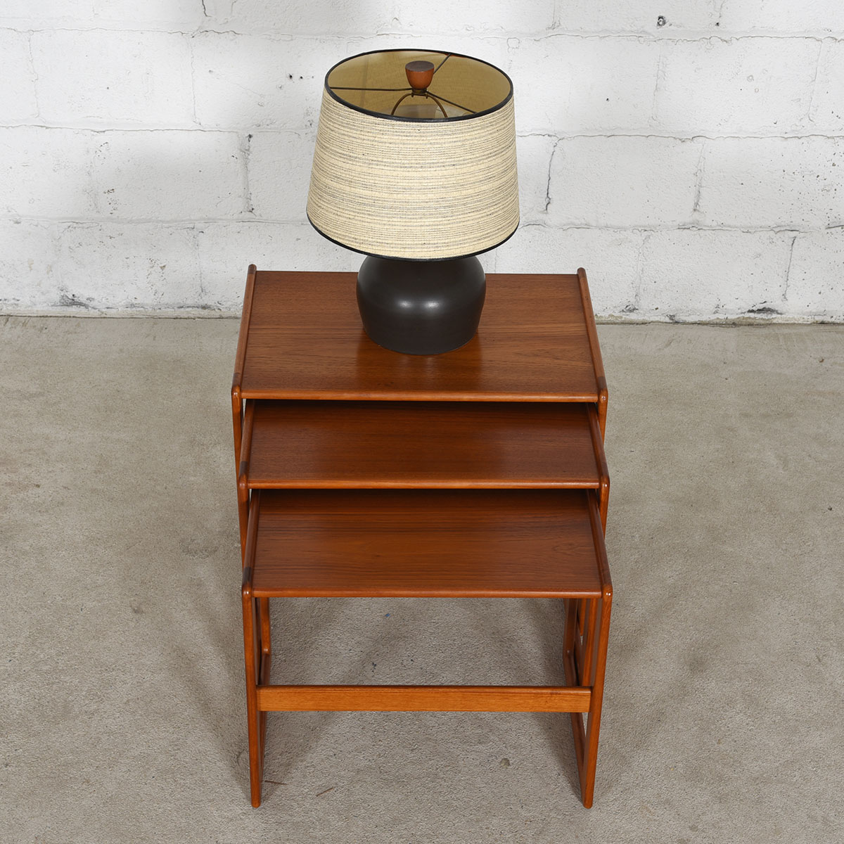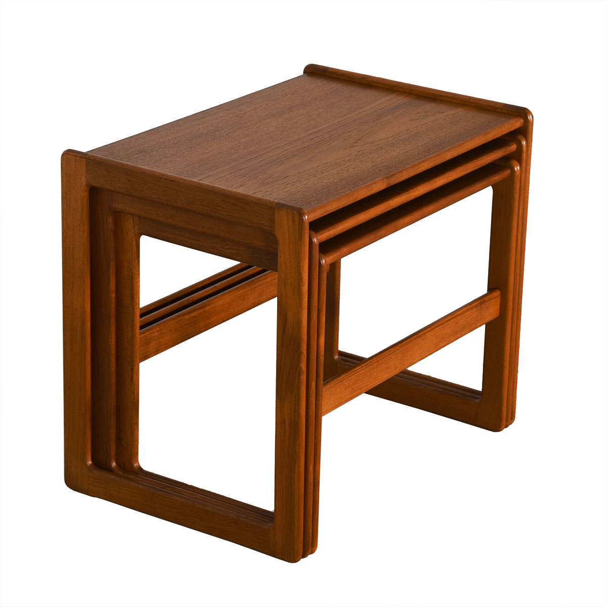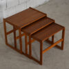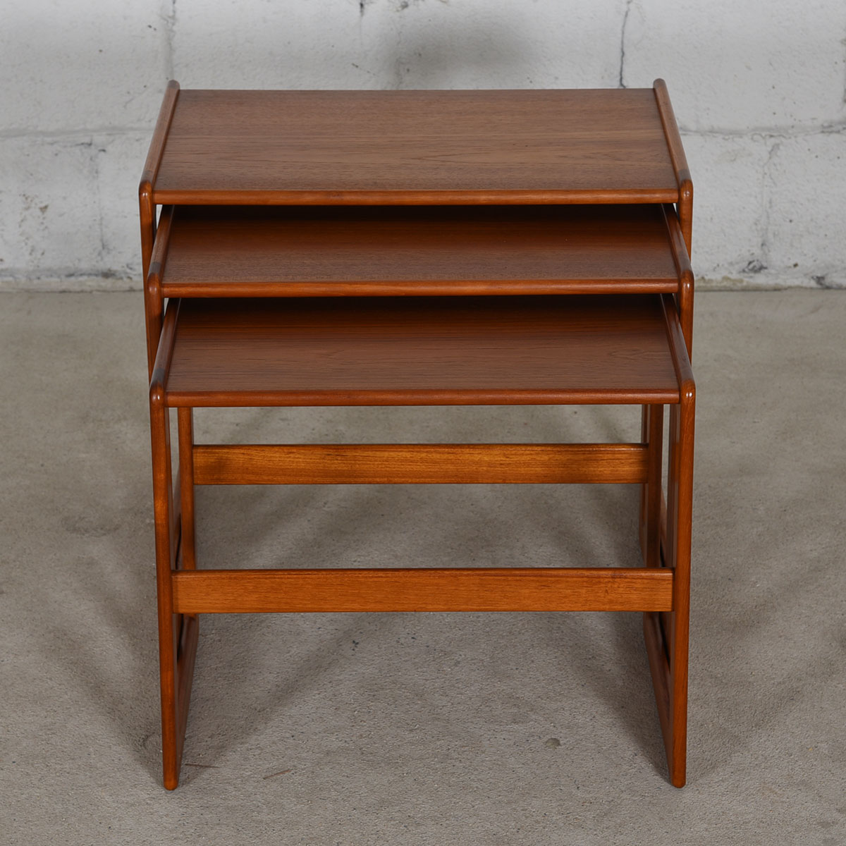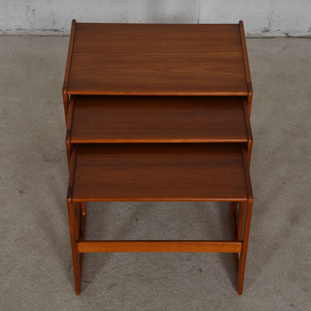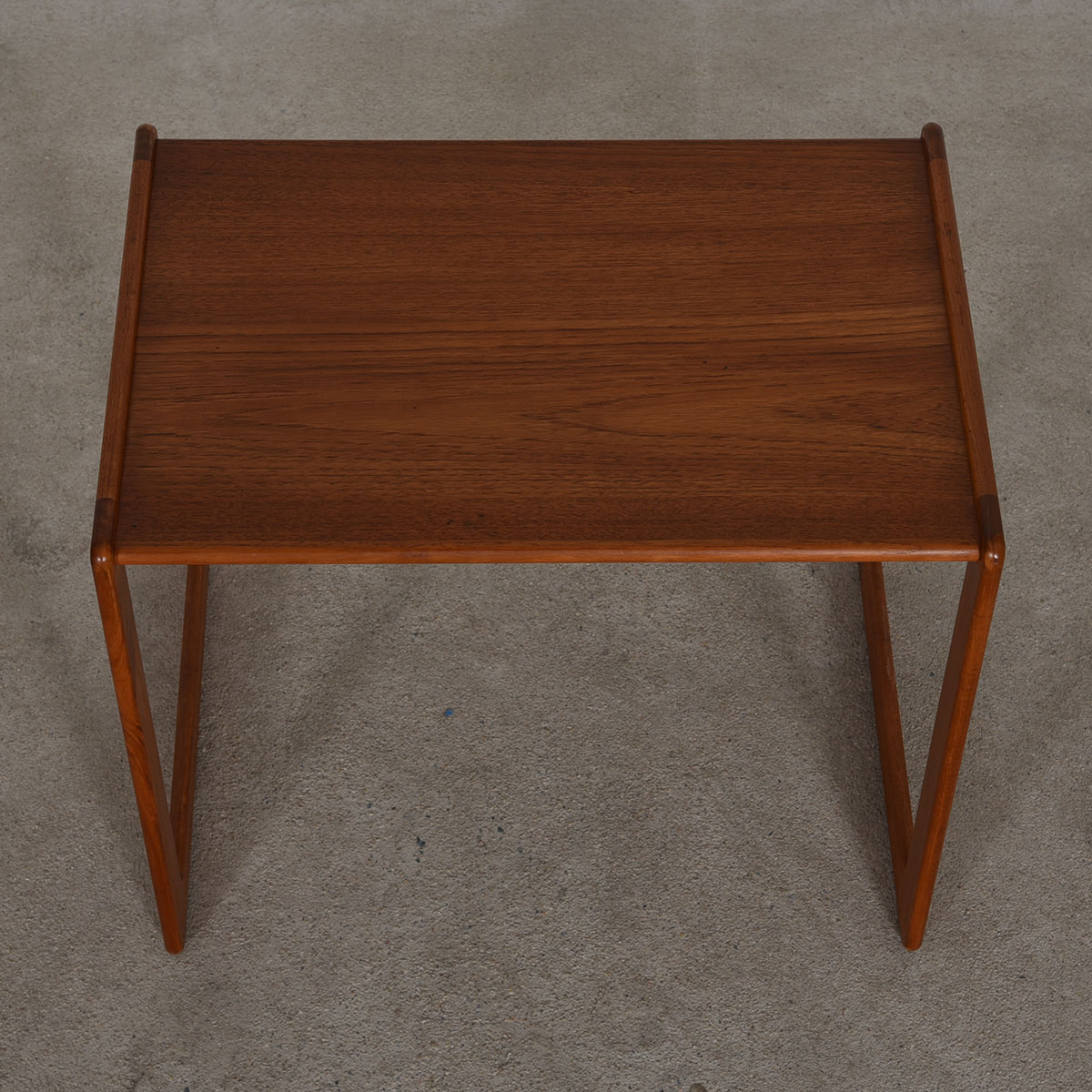 Wonderful set of three teak rectangular nesting tables from the 1970’s. When nested inside each other the set has a cube-like profile due to the way the legs are formed, including a bottom strut which also aids in the sturdiness of the tables. The top of each has a lip on the two shorter edges.
