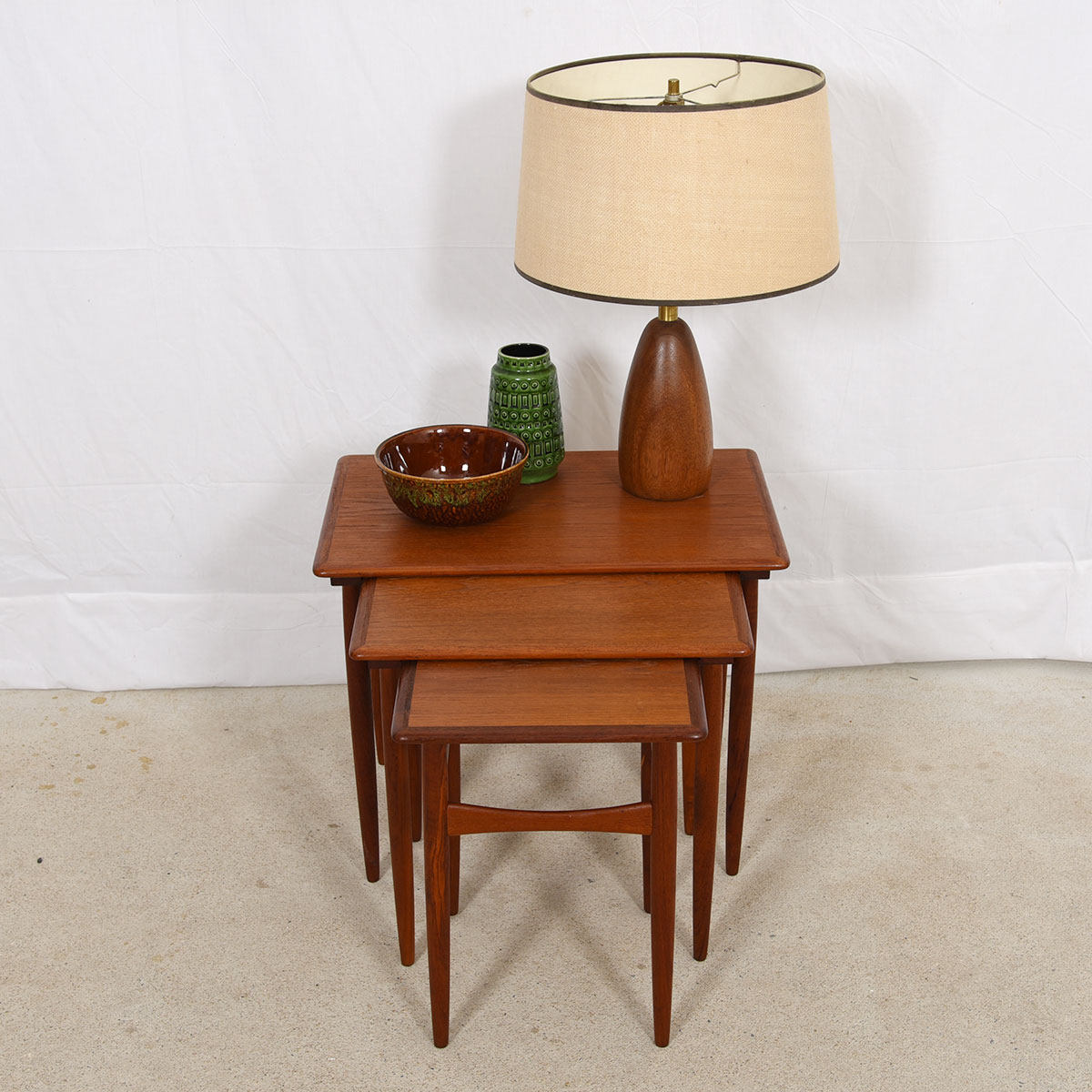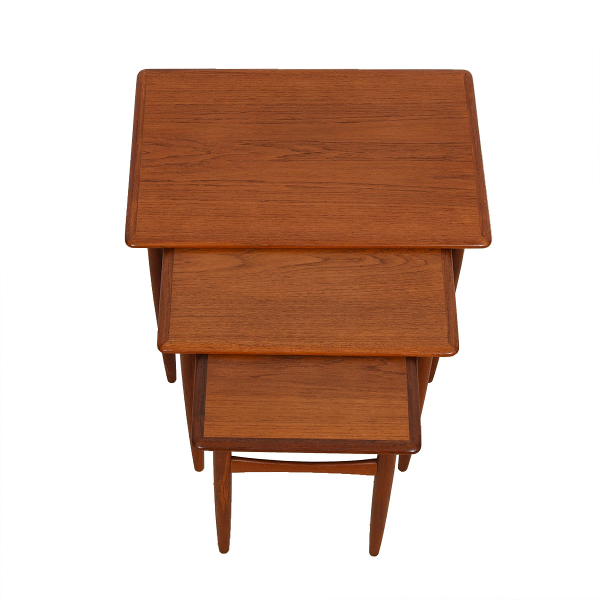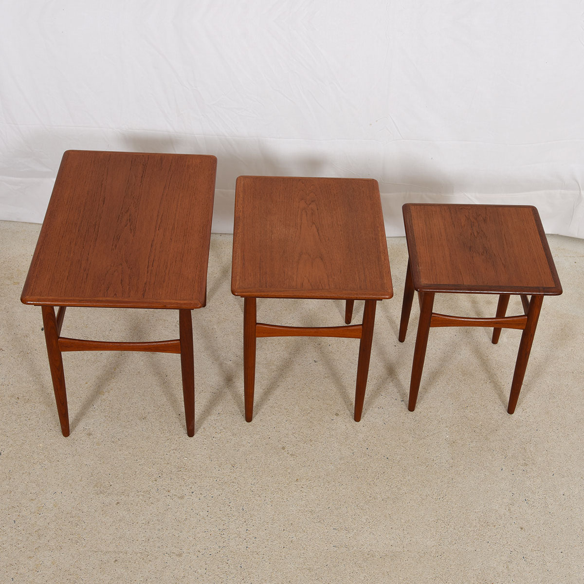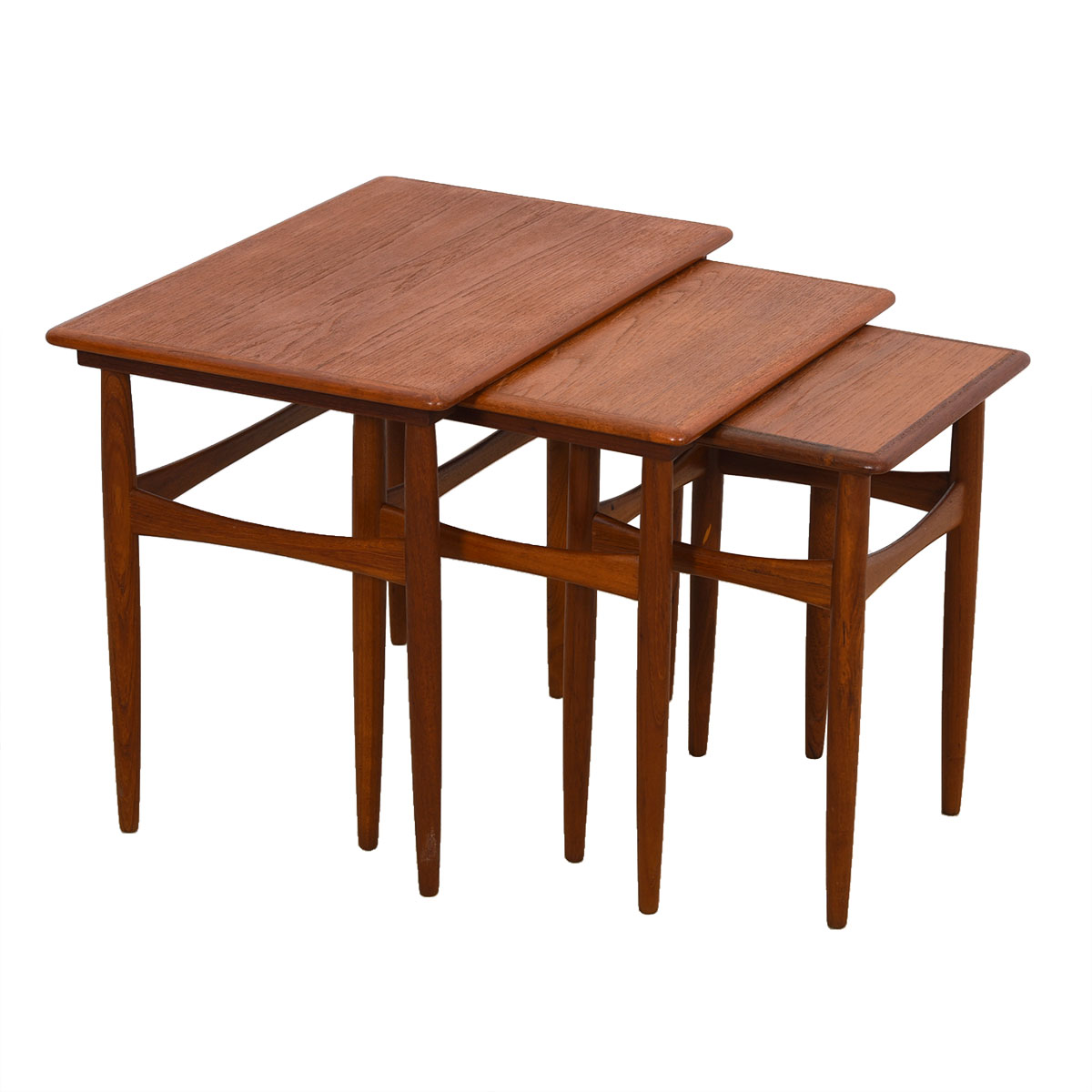 Lovely set of 3 Danish Modern nesting tables in teak. A beatuifully-shaped stretcher bar around the tapered legs makes these handy tables extra special.