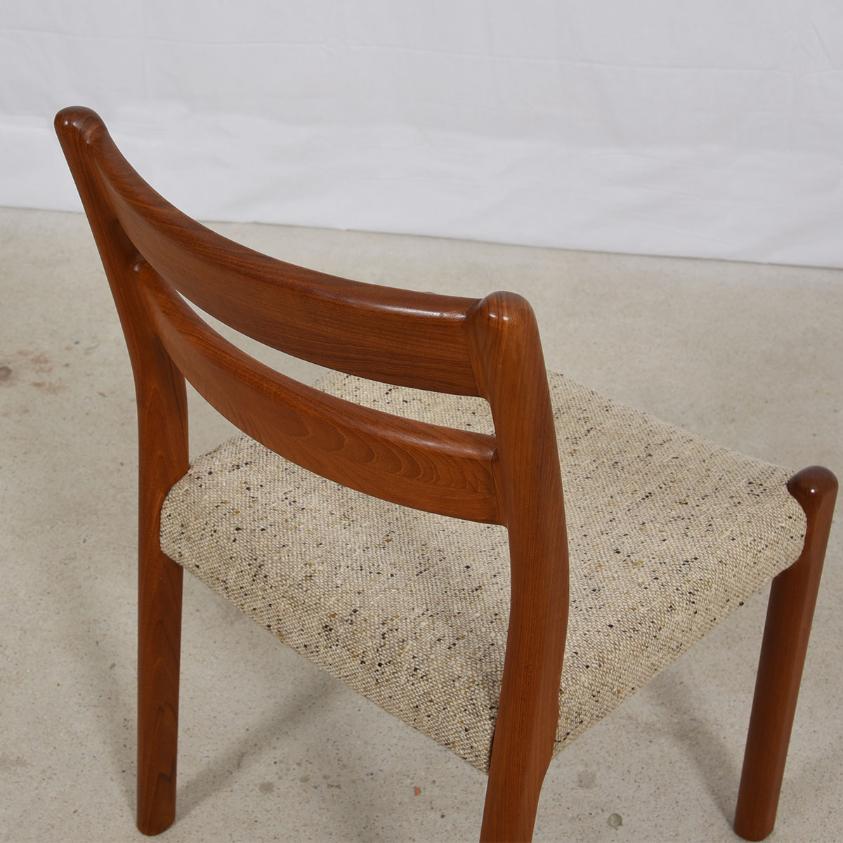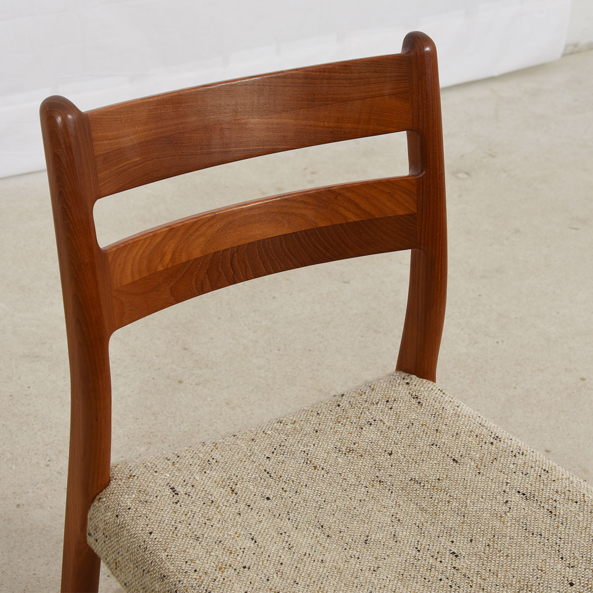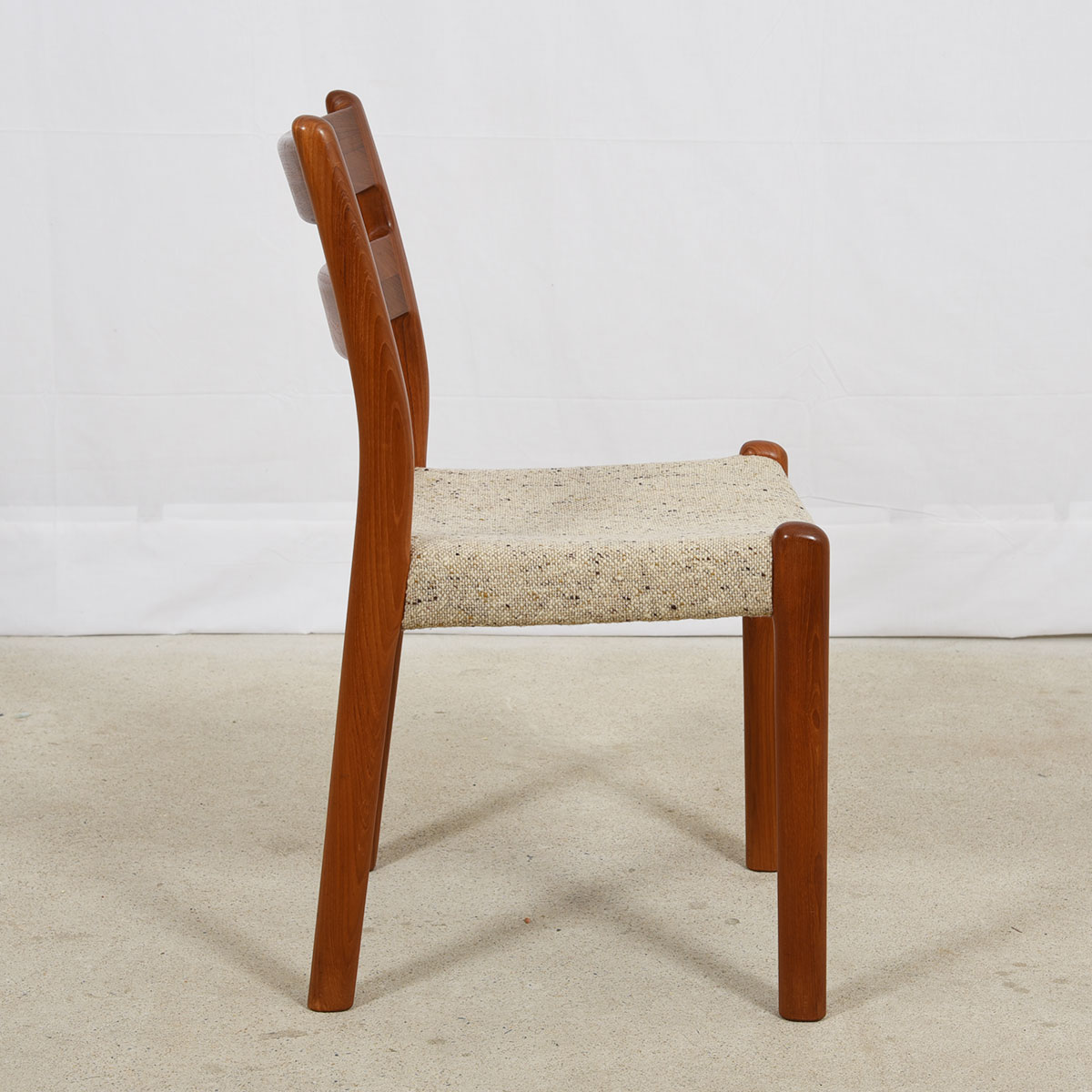 The frame of the chair is thick solid teak and the seat upholstered with its original oatmeal tweed upholstery. Look closely though and you see that the bars forming the backrest with the rest of the frame thicker than most, making it visually interesting as well as sturdy. The teak has aged to a glorious deep, rich tone. Combined with impeccable craftsmanship, these are the qualities you want in a chair.