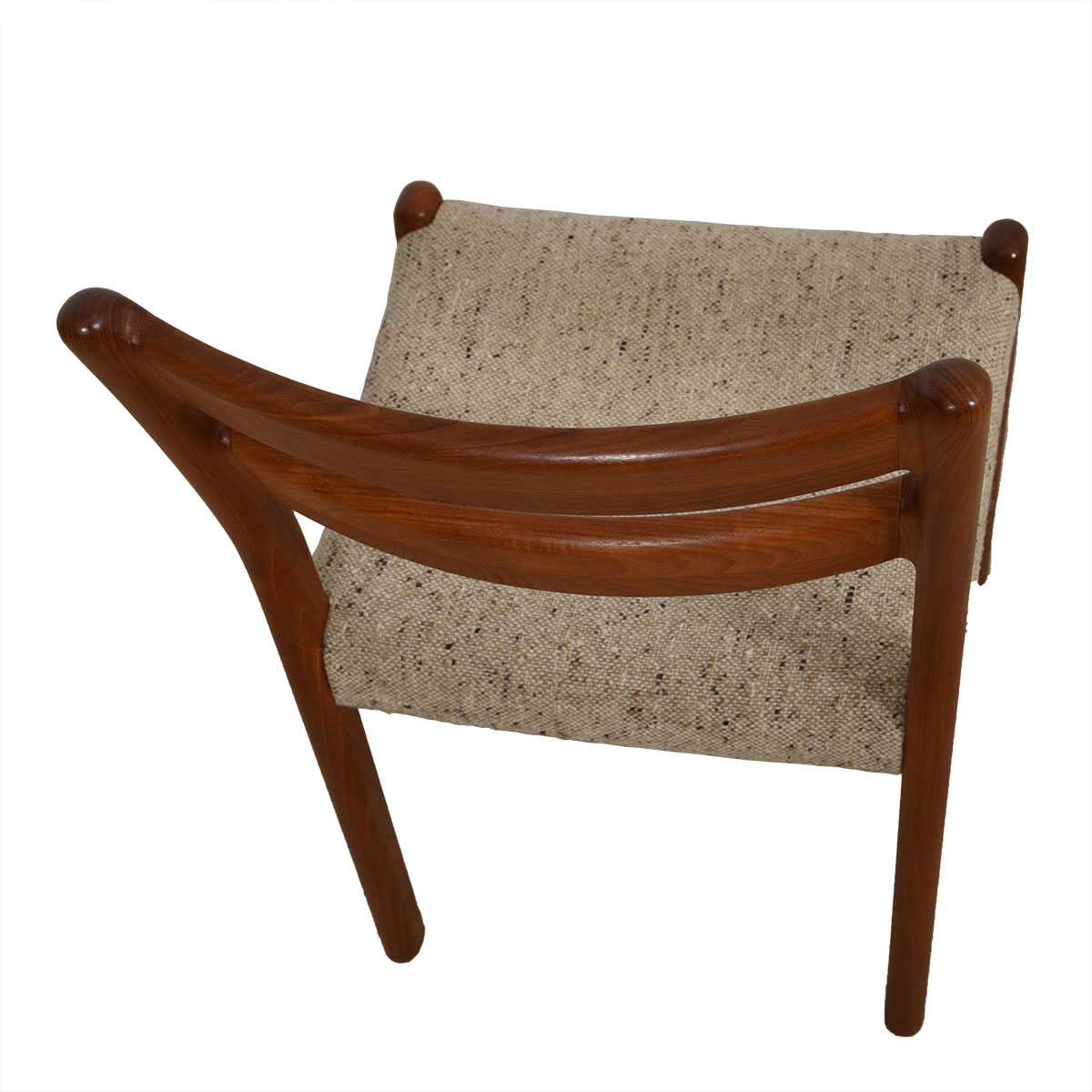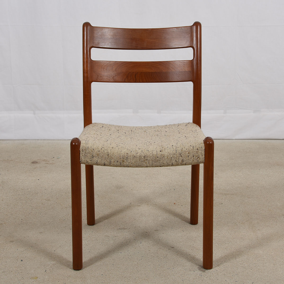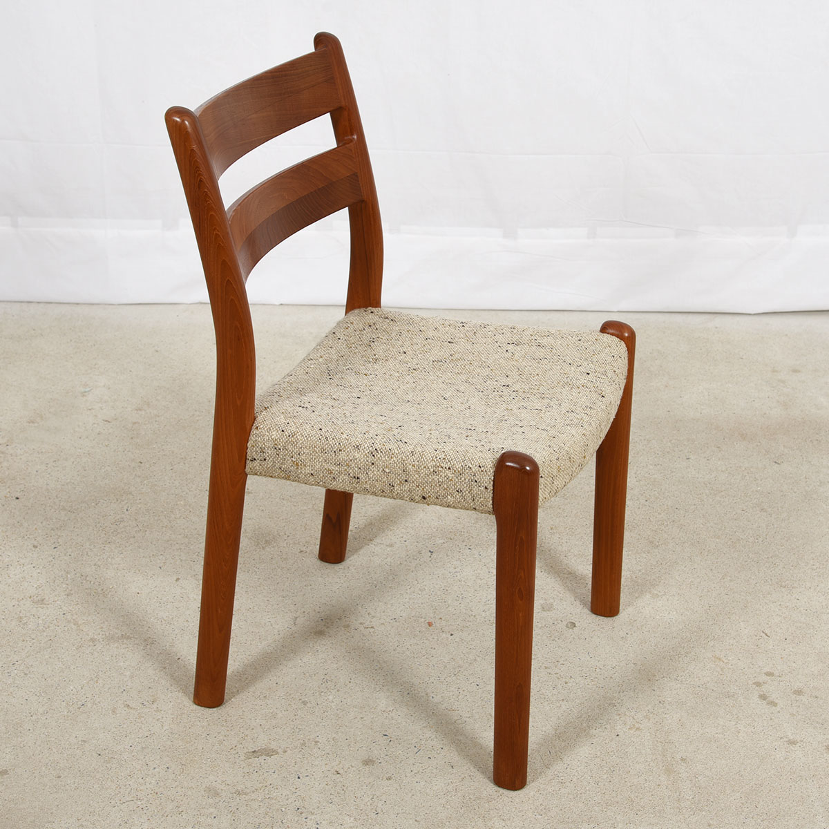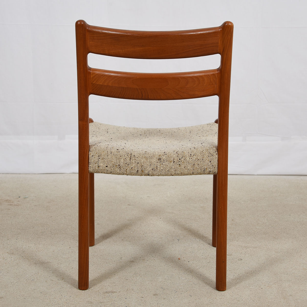 The frame of the chair is thick solid teak and the seat upholstered with its original oatmeal tweed upholstery. Look closely though and you see that the bars forming the backrest with the rest of the frame thicker than most, making it visually interesting as well as sturdy. The teak has aged to a glorious deep, rich tone. Combined with impeccable craftsmanship, these are the qualities you want in a chair.