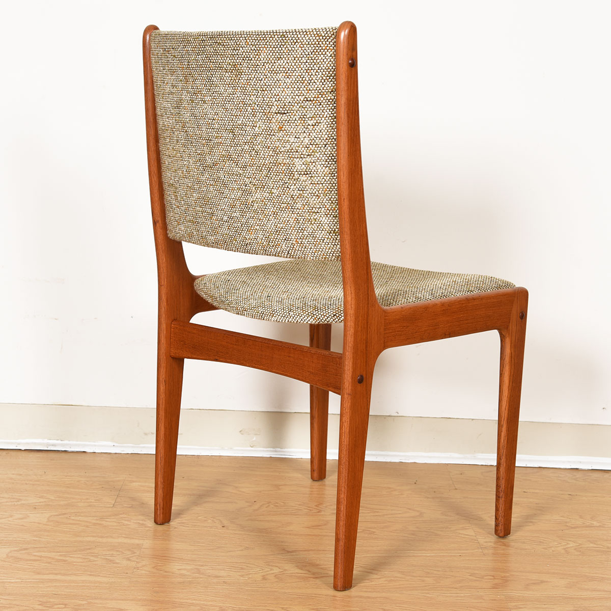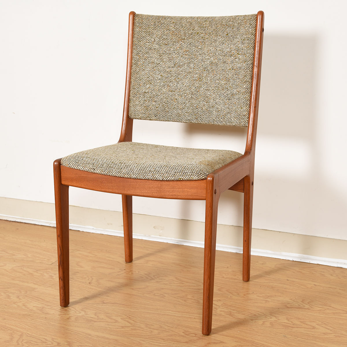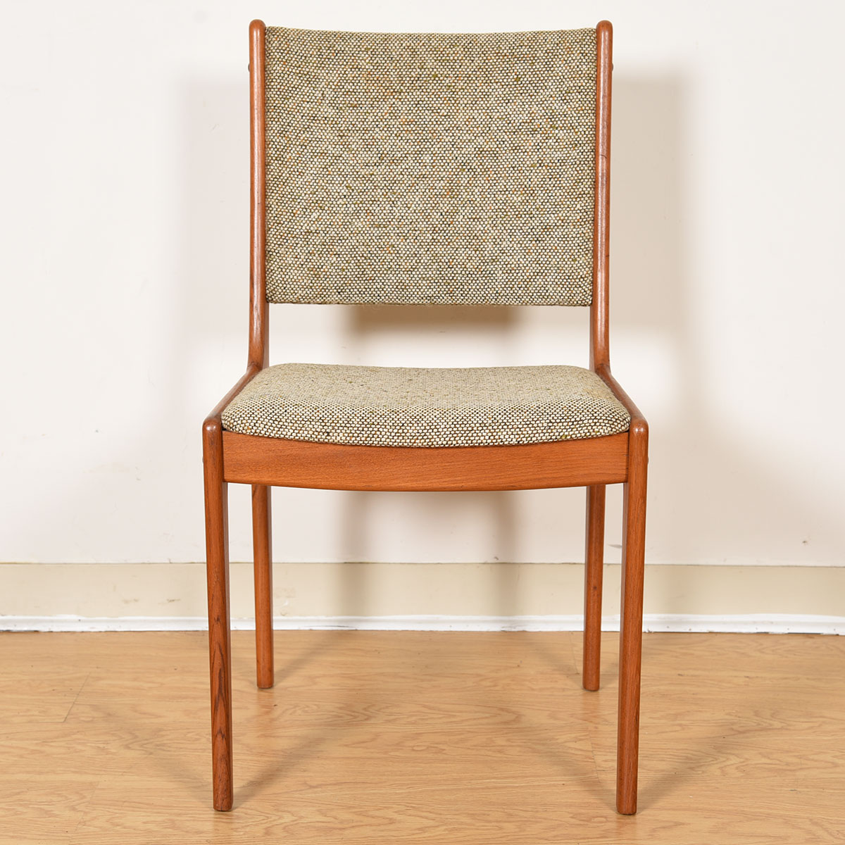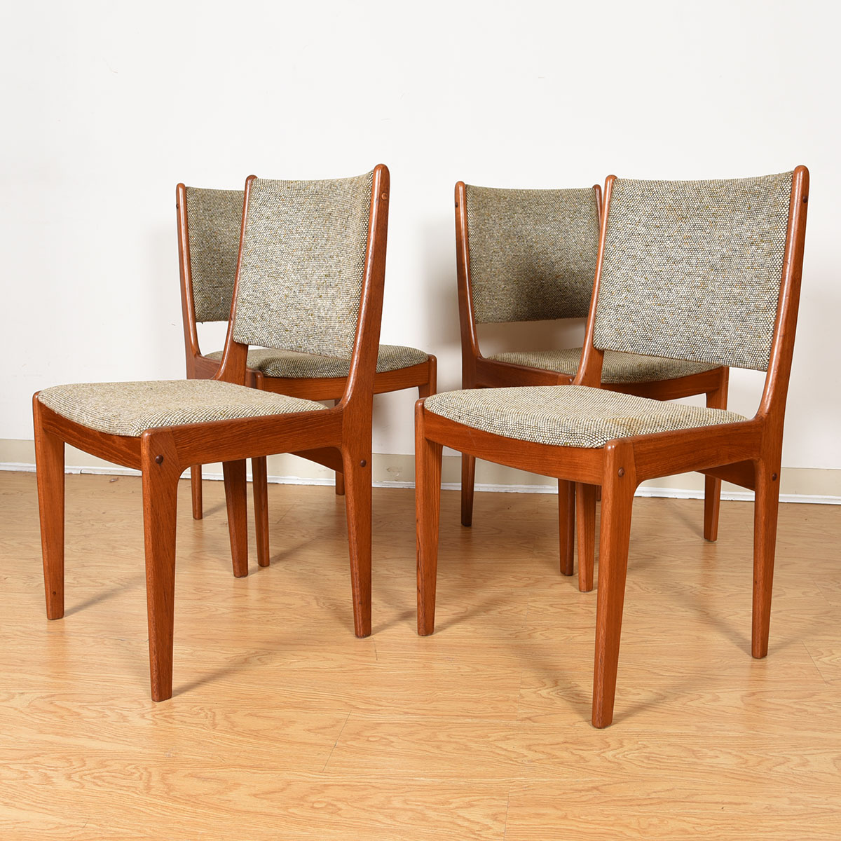 This is a handsome set of 4 Danish Modern chairs with a teak frame and fully upholstered back and seat. The upholstery is a tweedy taupe color. Very nice lines on these classic chairs that would pair well with any Danish teak table.