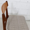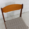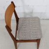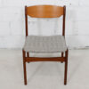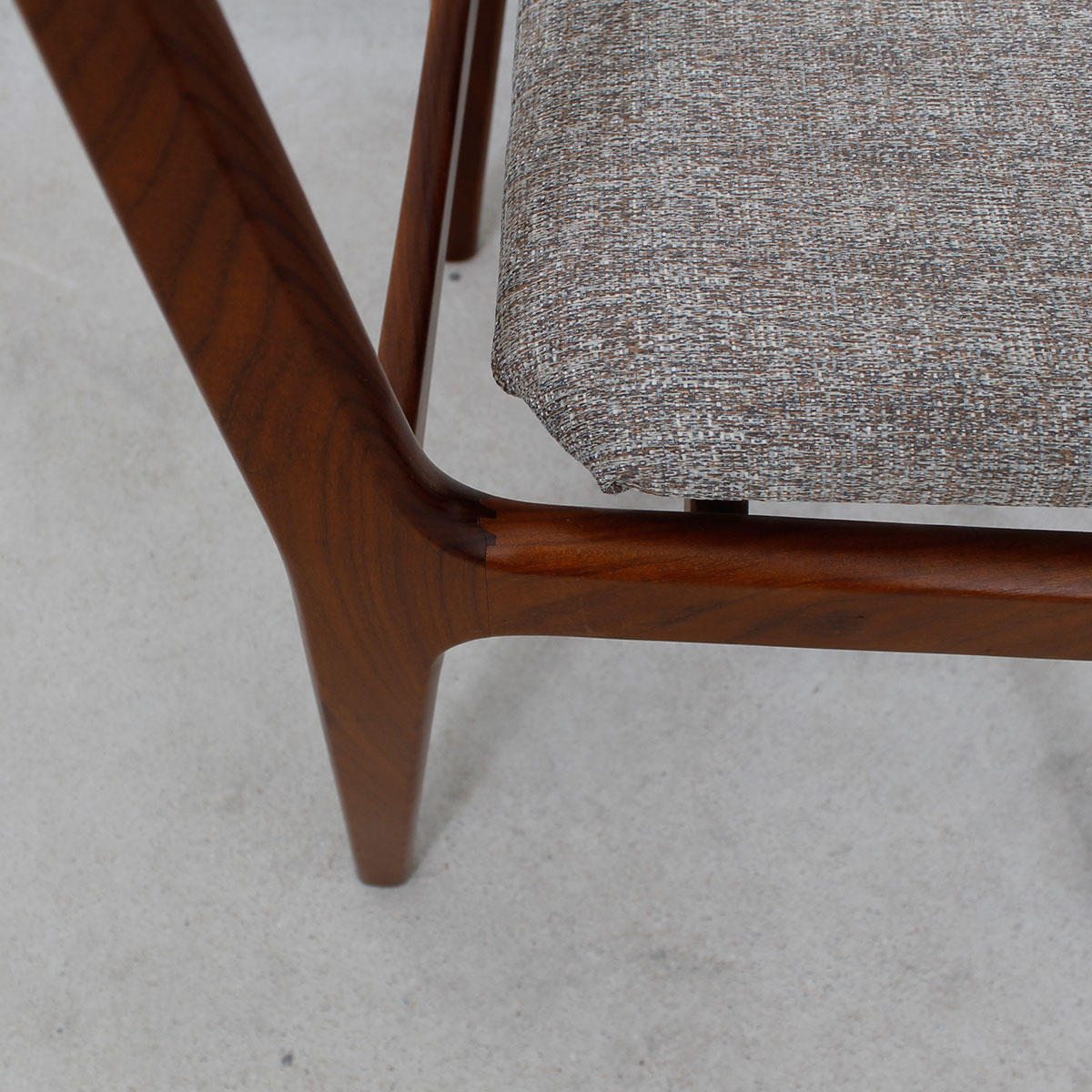 Of teak, the small backrest is lighter while the frame of the chair is deep and richly toned. The seats are upholstered in a period fabric of cadet blue. A great chair that would complement a table of many styles.
