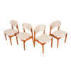 A wonderful set of Erik Buch Danish Modern teak dining chairs with a cream-colored upholstery. Designed by Erik Buch for O.D. Mobler, Denmark, the curved backrest & seat make these extremely comfortable. The classic stylish design gives these chairs the appearance of having floating seats.