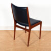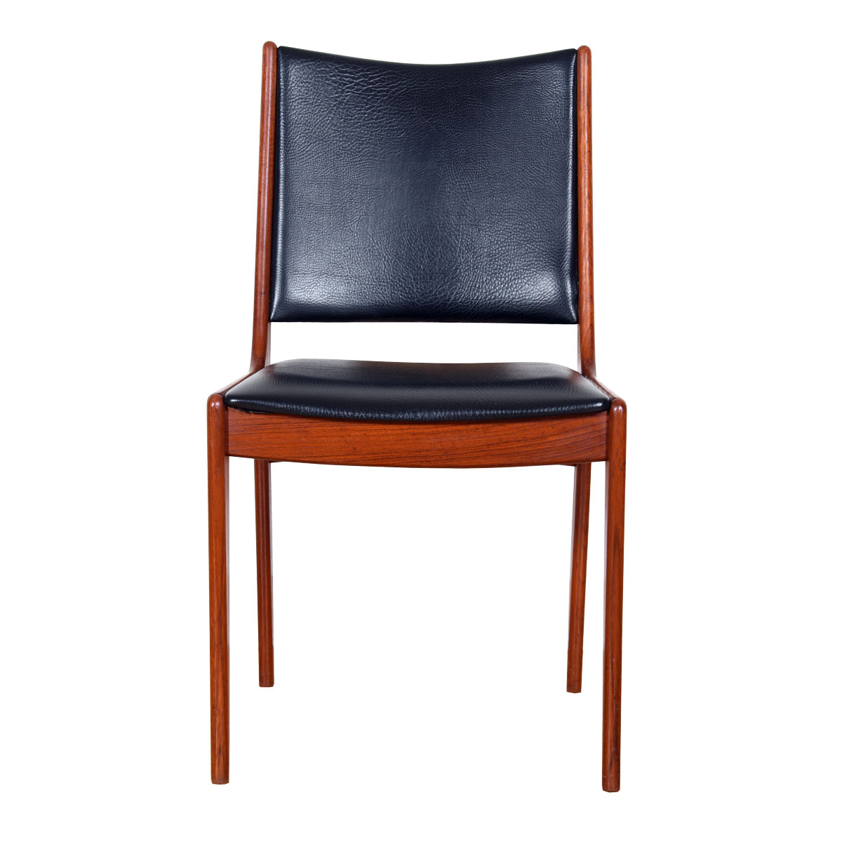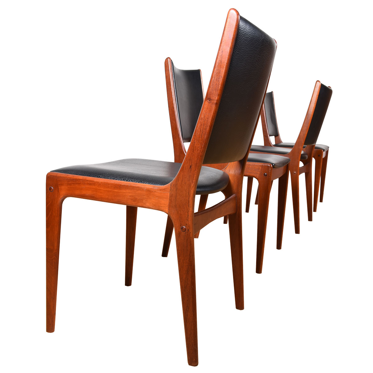 A set of 4 Johannes Andersen for Uldum Mobelfabrik Danish Teak Dining Chairs. In Warm Solid Teak. Upholstered In Their Original Black Leatherette.