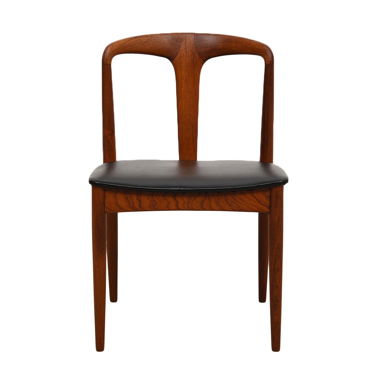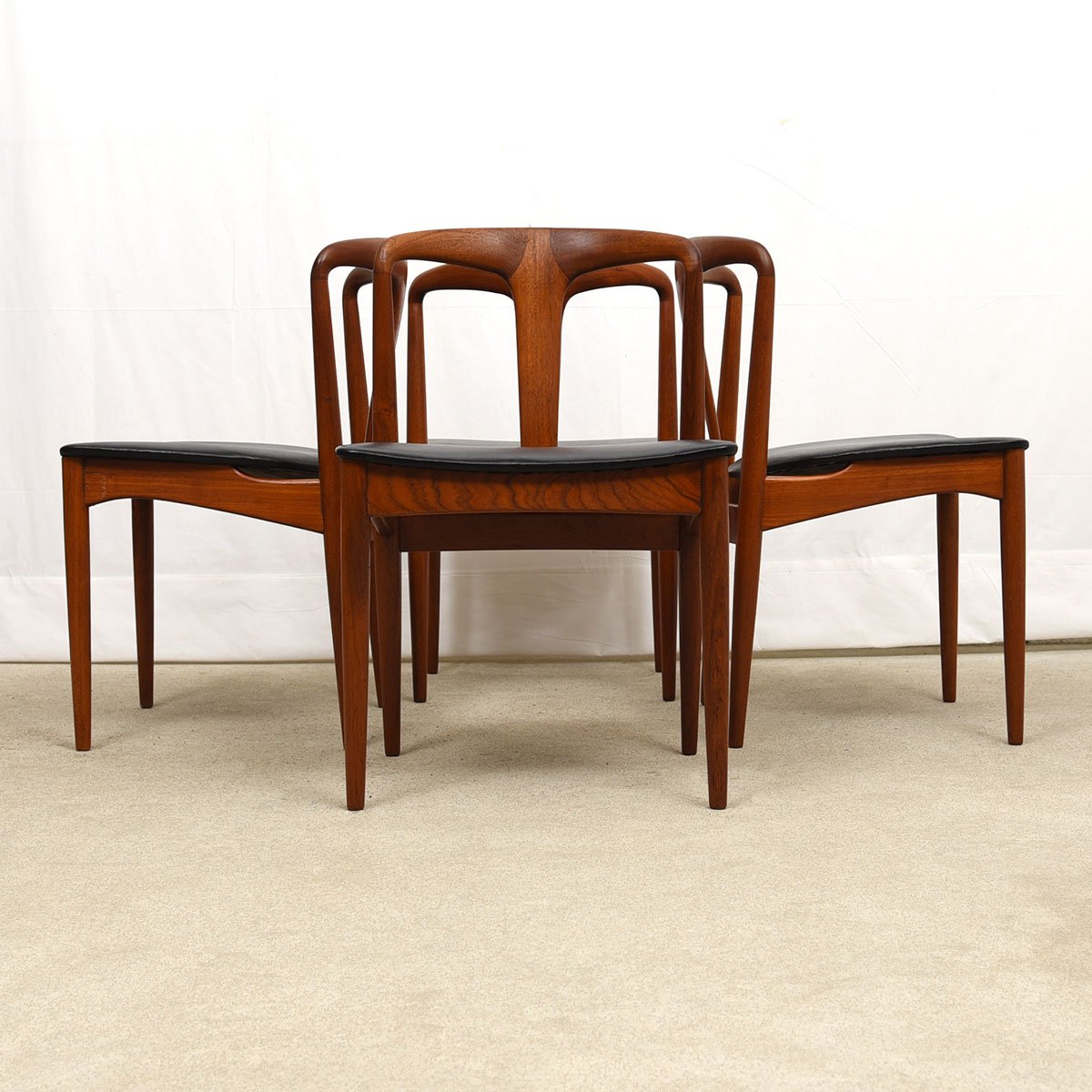 This remarkable set of Danish Modern dining chairs is solid teak. These were designed by Johannes Andersen circa 1960 and were manufactured by Uldum Møbelfabrik. They are Model 7171 also known as the “Juliane” chair.