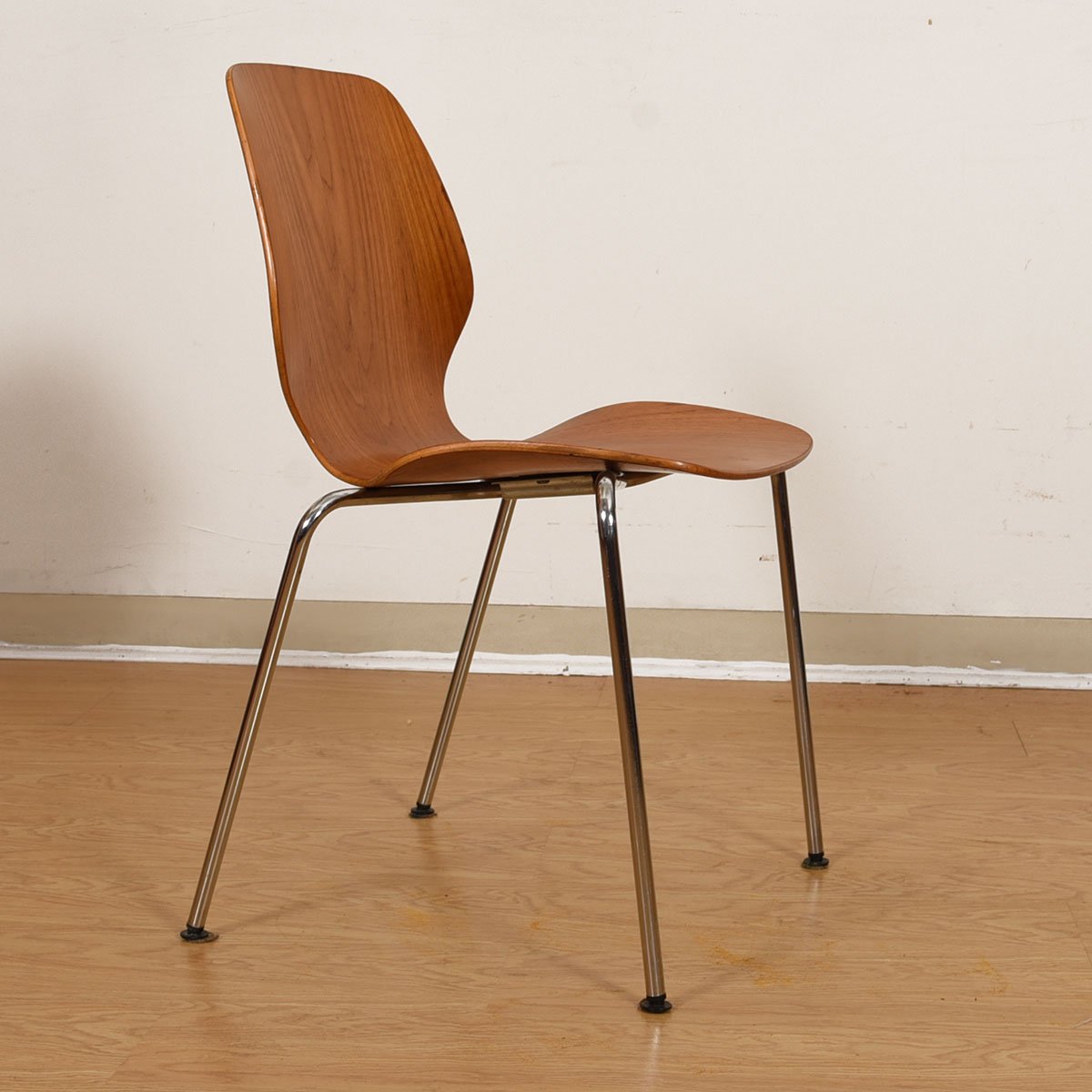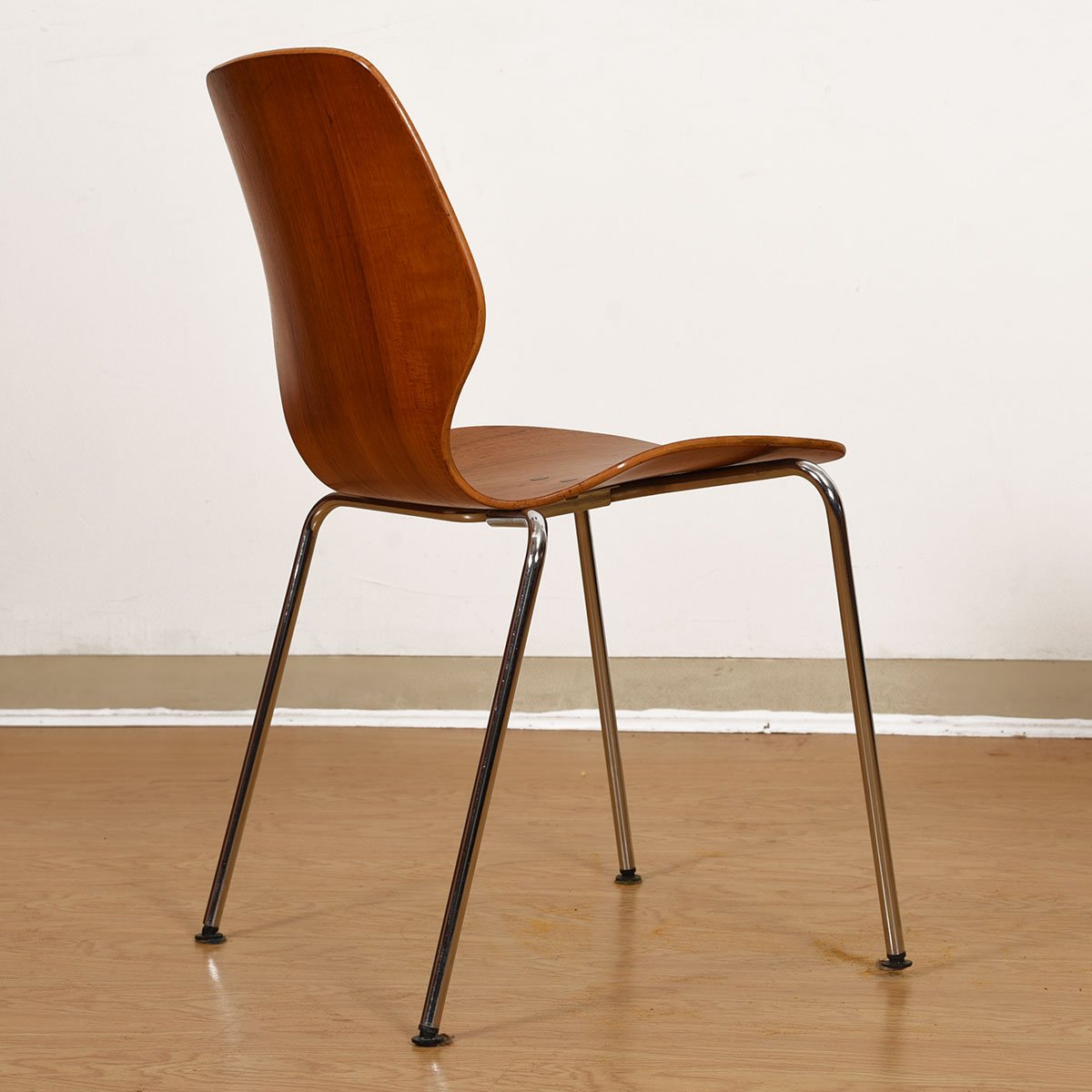 A sinuous teak bentwood seat perches atop four chrome legs. The “City Chair” by Oivind Iverson for Westnofa.