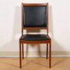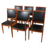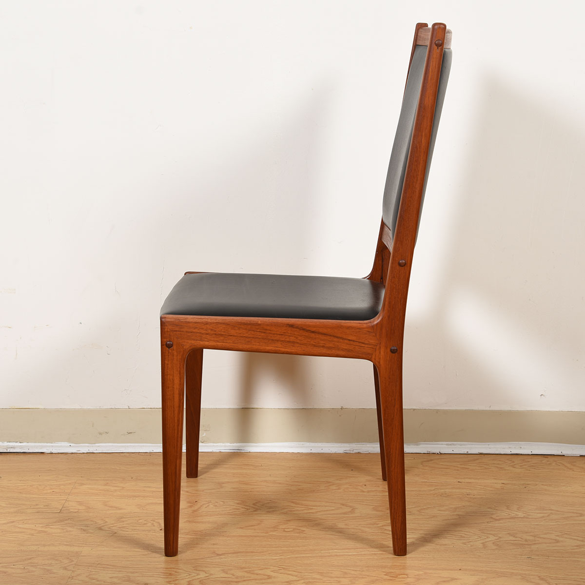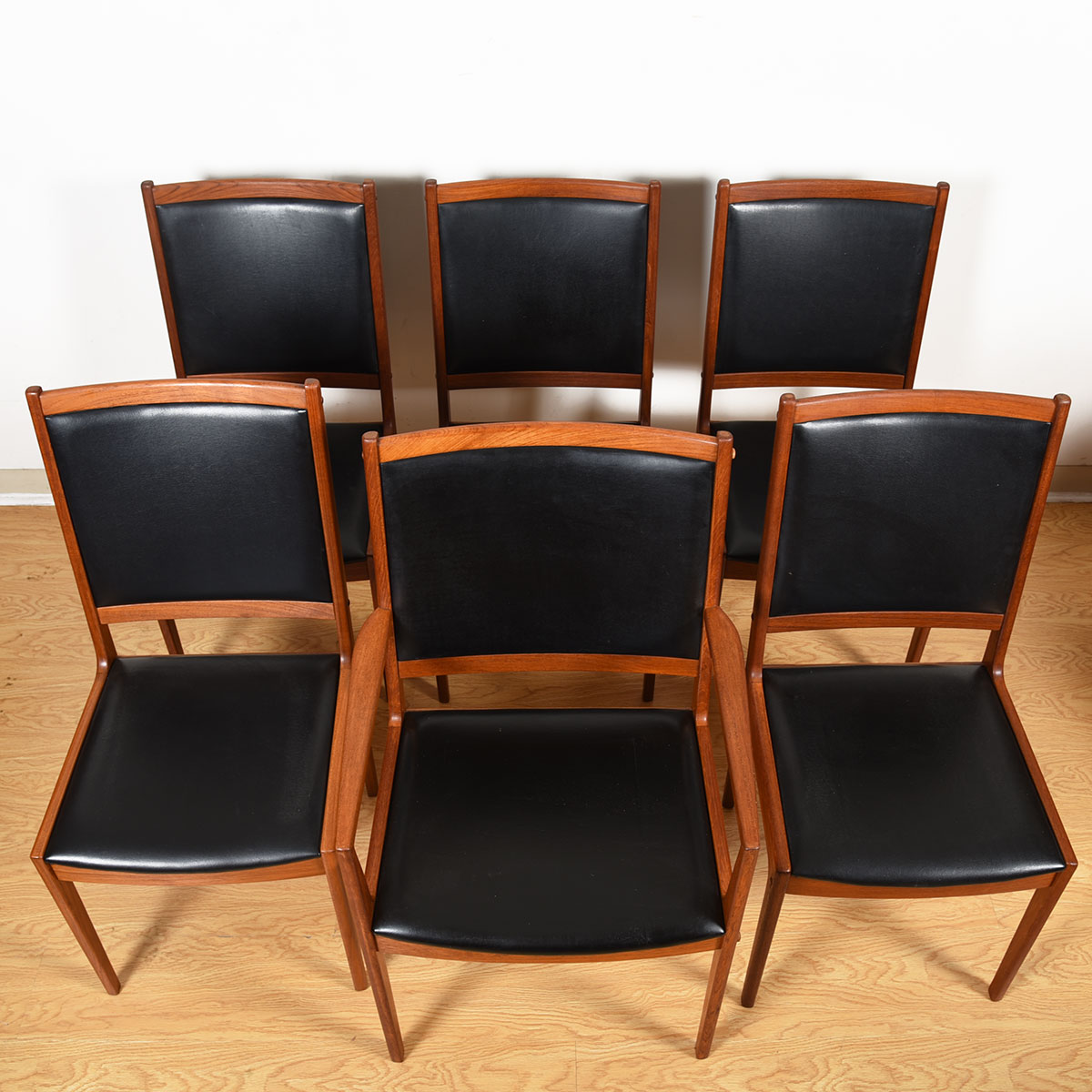 For larger spaces or for tables with a bold presence we are pleased to offer this set of six Danish Modern teak dining chairs by Kofod Larsen. A teak frame surrounds the backrest, upholstered on both sides in black as is the seat. The legs are squared and tapered.