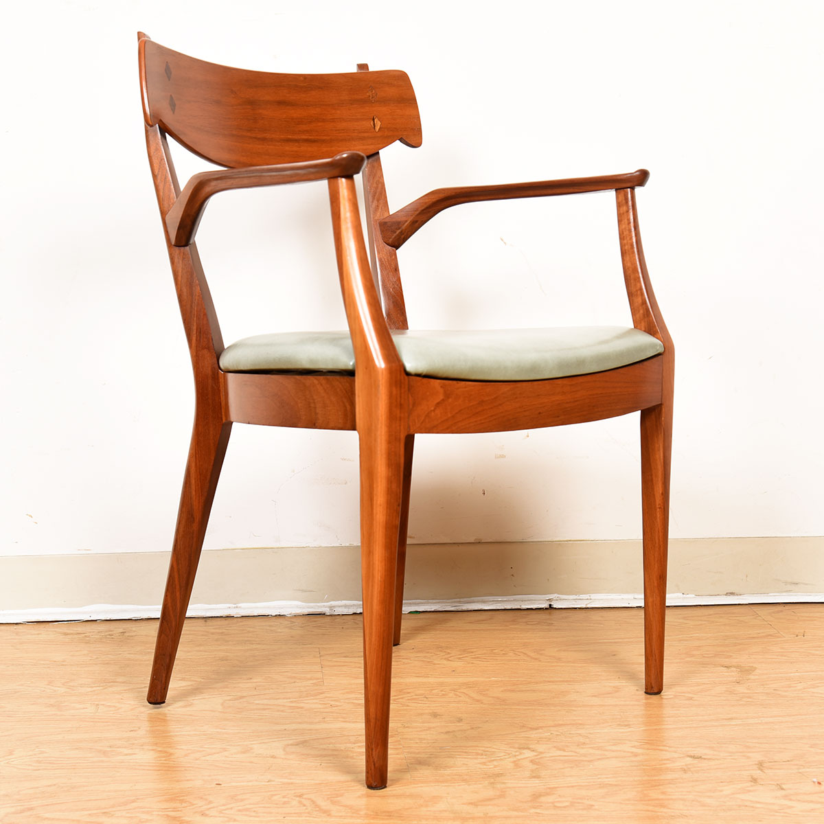 Exquisite Mid Century Modern Walnut chairs w/ diamond shaped inlays of Rosewood on backrest. These are chairs that are elegant enough to present a subtle statement excellent design of any dinner party. Chairs designed by Kipp Stewart and Stewart MacDougall for their Drexel “Declaration” Line.