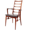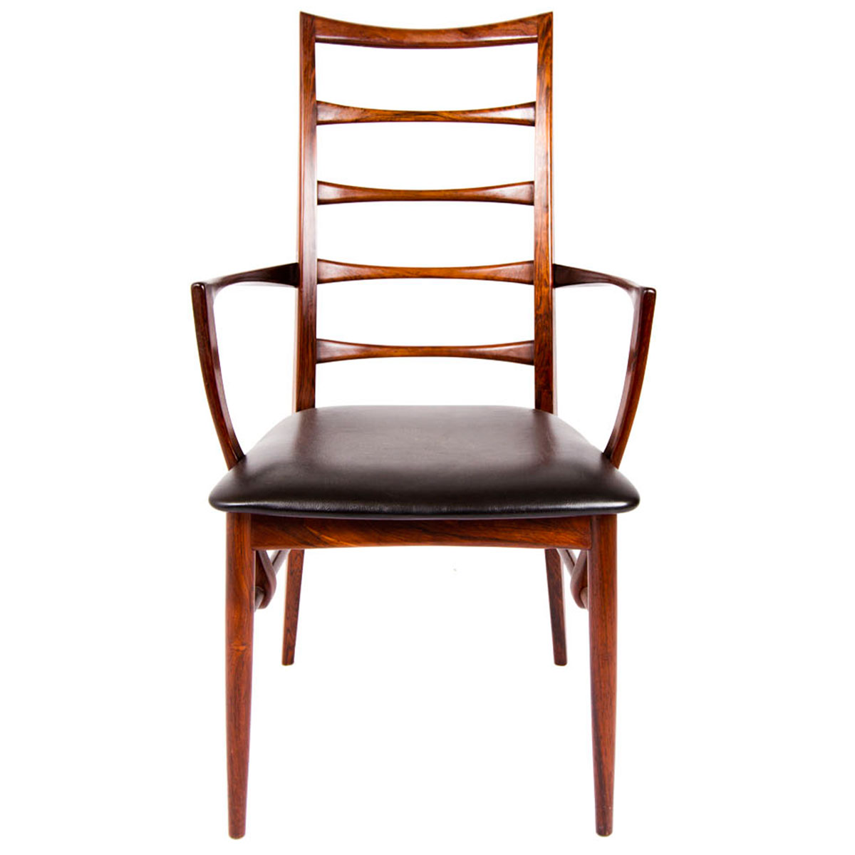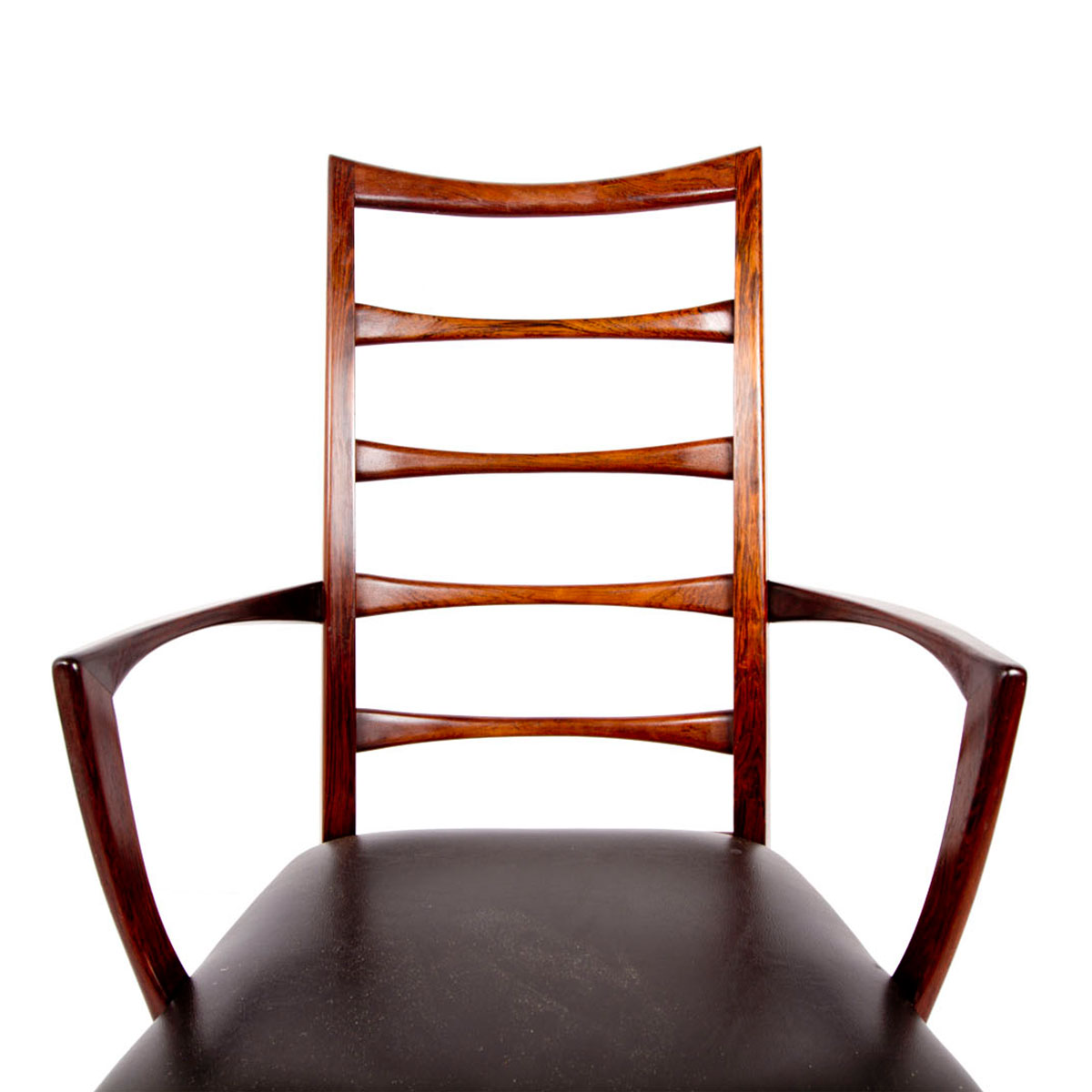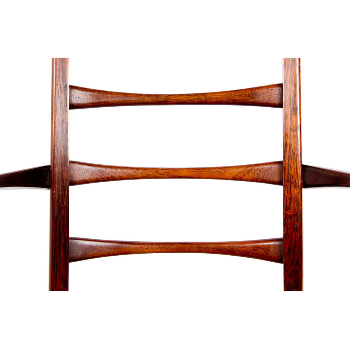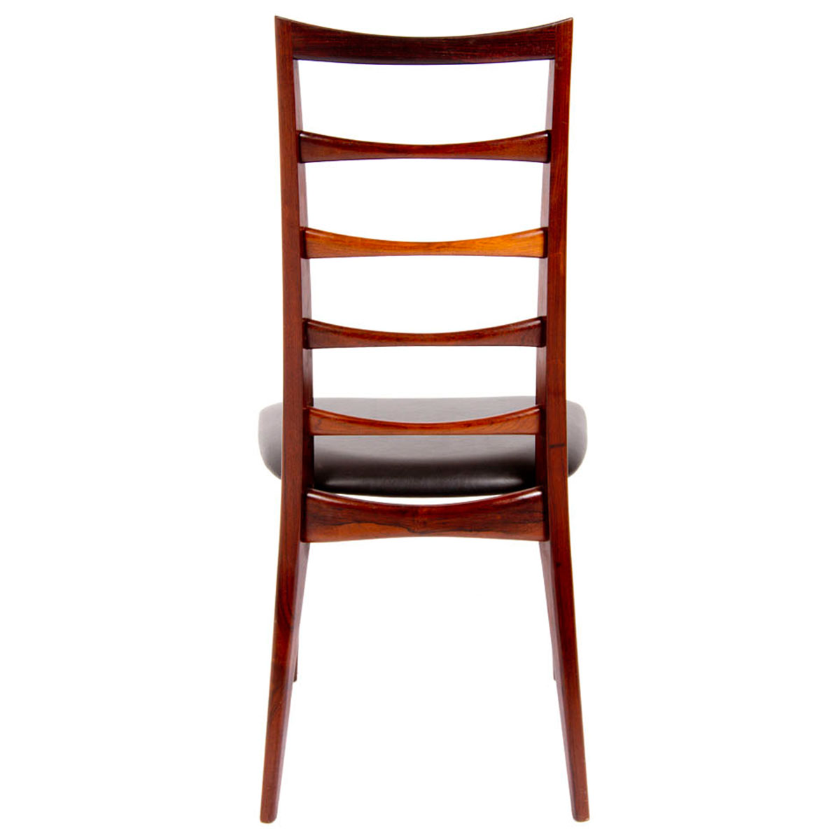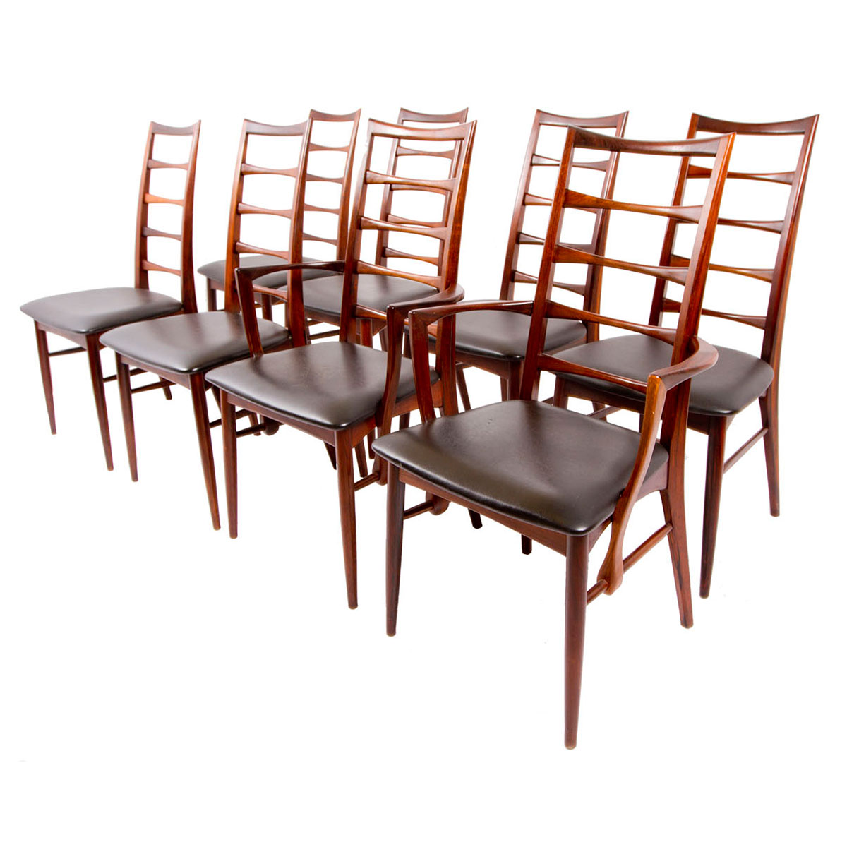 Original Seats. Beautifully proportioned and refined set of rosewood ladder back chairs from Koefoeds Hornslet. Two arm chairs and six side chairs. Some of the most elegant chairs we have ever come across! Measurements are Approximate.