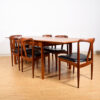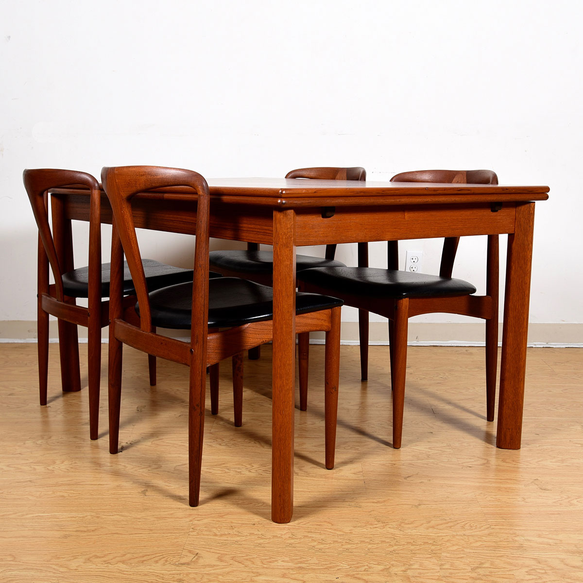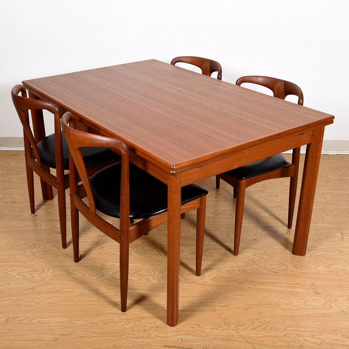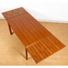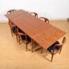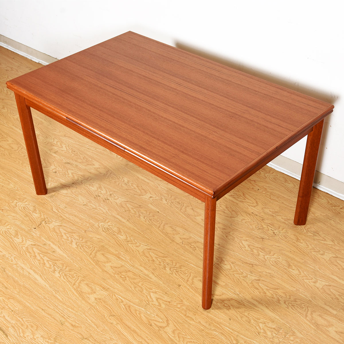 Long and narrow mid-sized teak dining table with subtle but striking grain pattern throughout, which allows the table to visually be the statement piece of the room. This table can then accomodate your guests without taking up too much visual space. Comes with two self storing leaves, each measuring 19.25″ each.