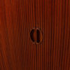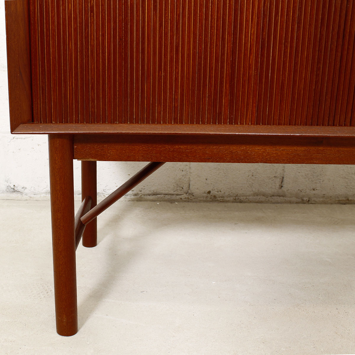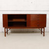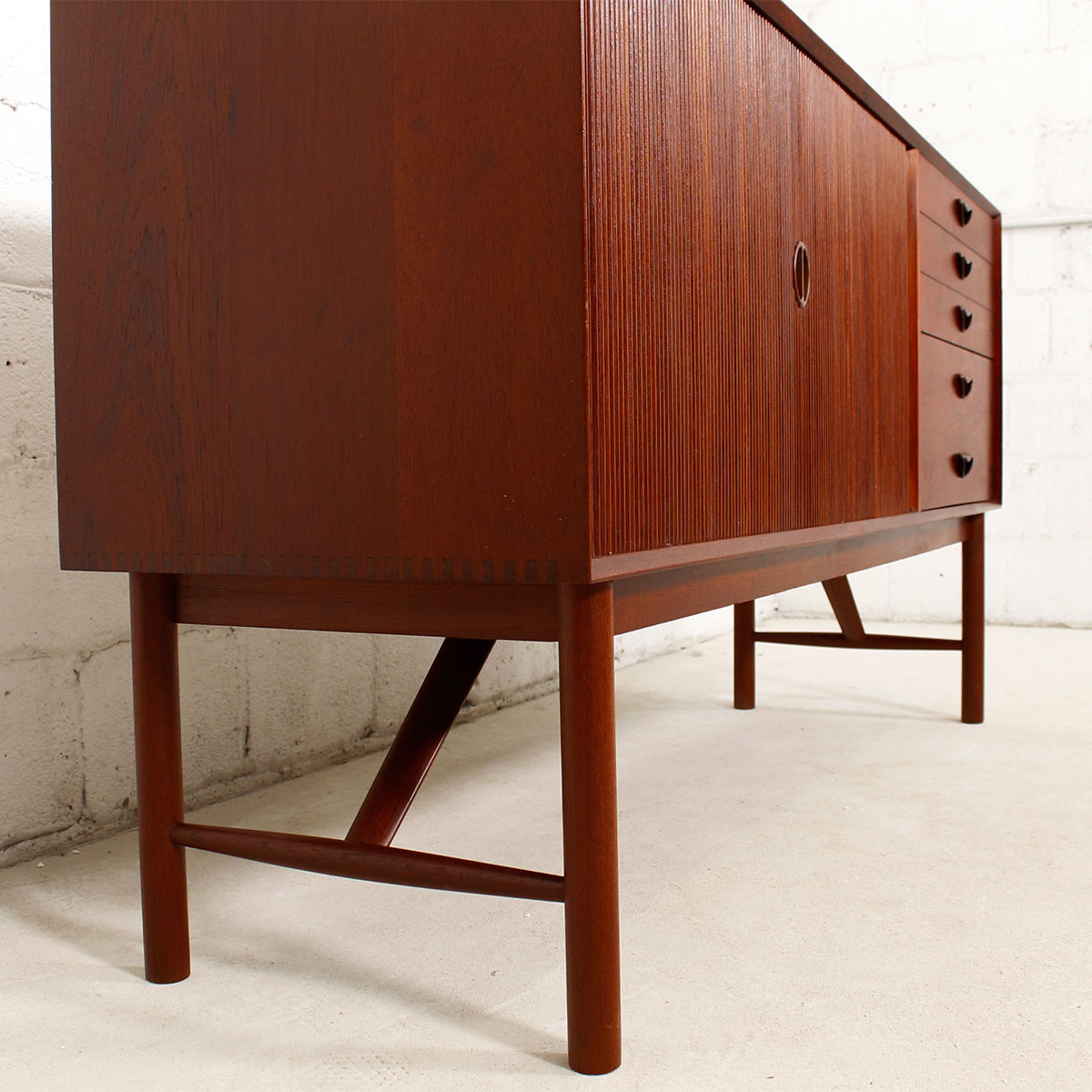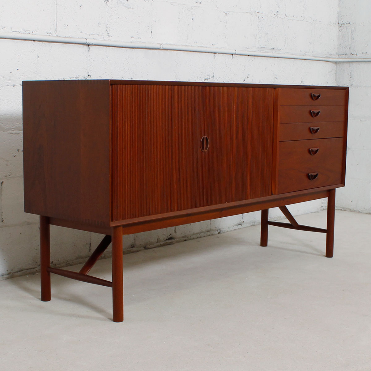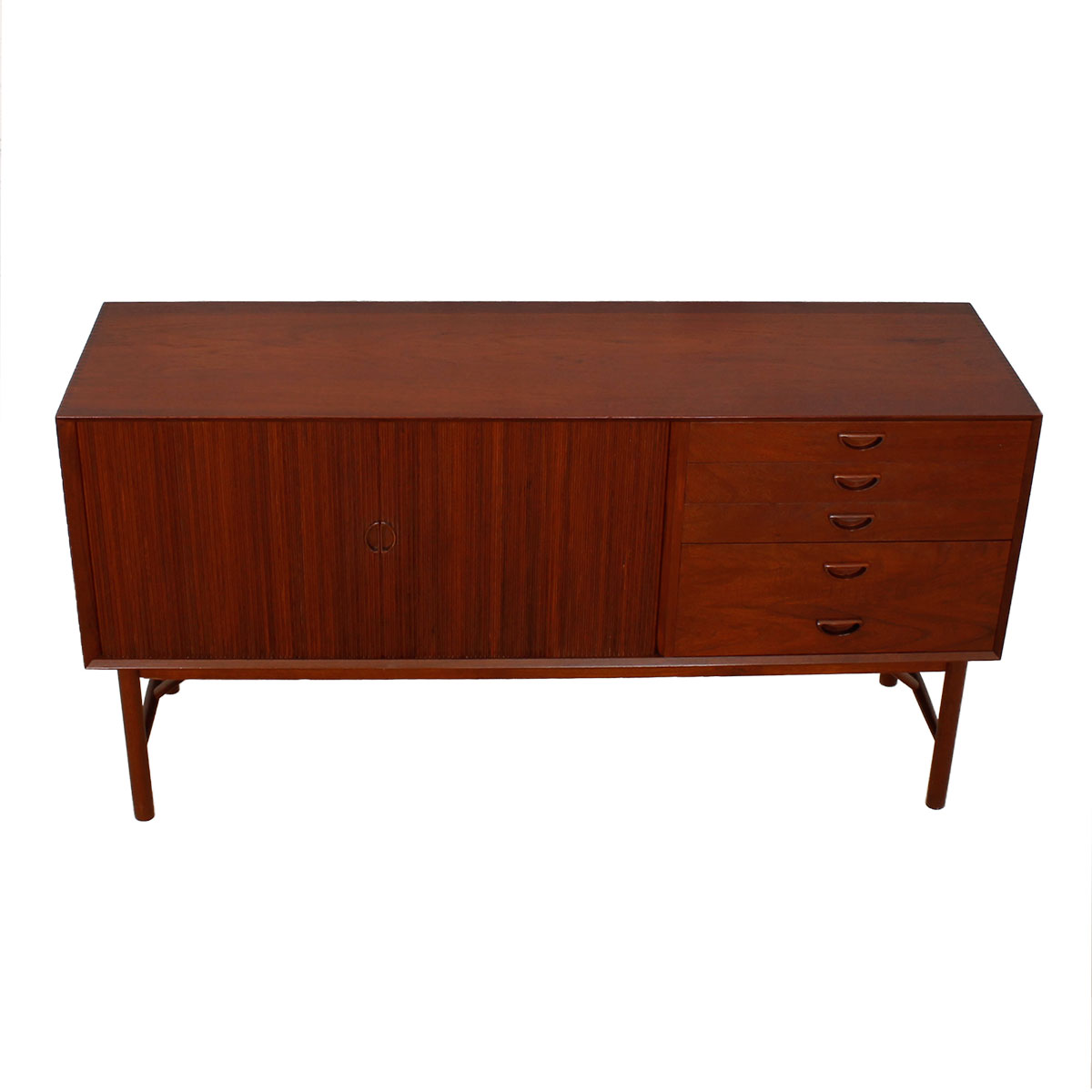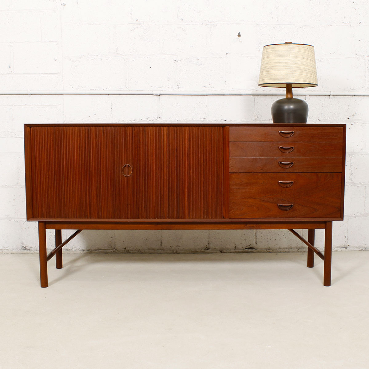 This sideboard is a showstopper. Designed by Peter Hvidt, it is solid teak and boasts lots of storage. Behind the tambour door on the left two-thirds is shelved storage. The right portion is composed of four drawers. Distinctive signature handles feature prominently on the piece, and it sits up on elegant squared legs with an angled stretcher, adding further visual interest. A truly remarkable find that is sure to bring your space together and provide storage for household goods, barware or media.