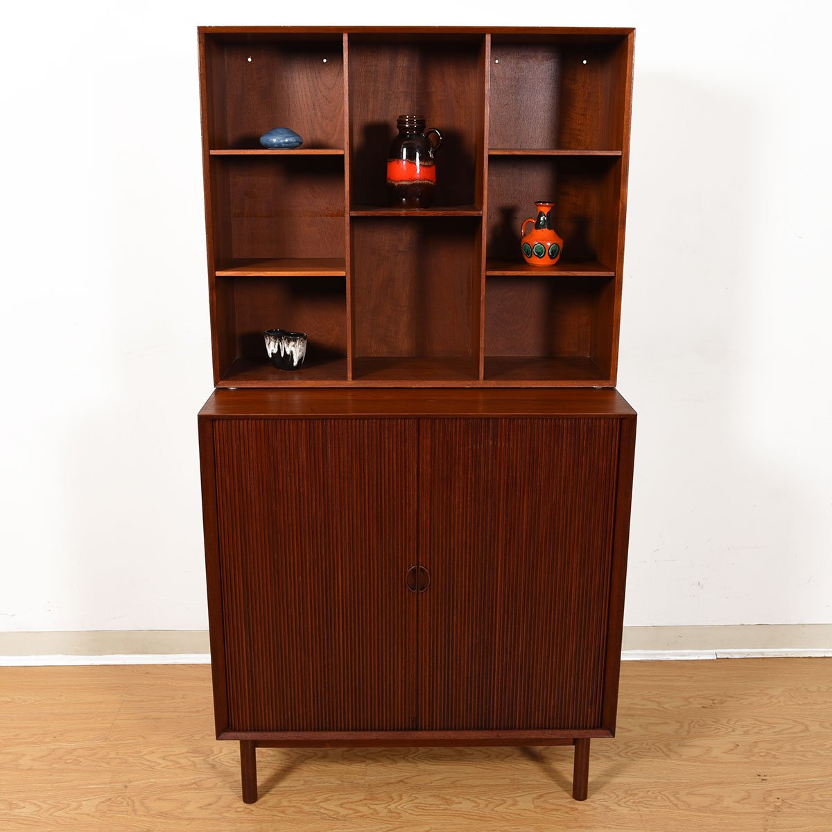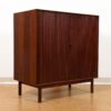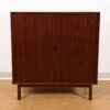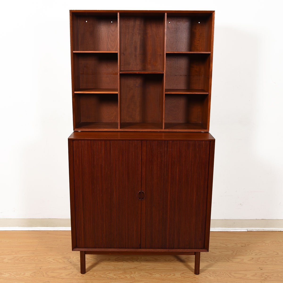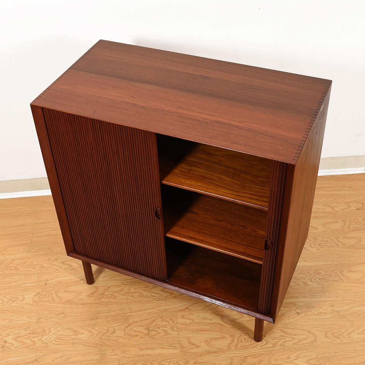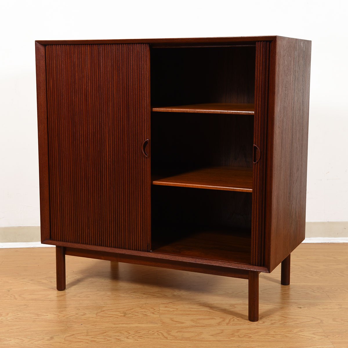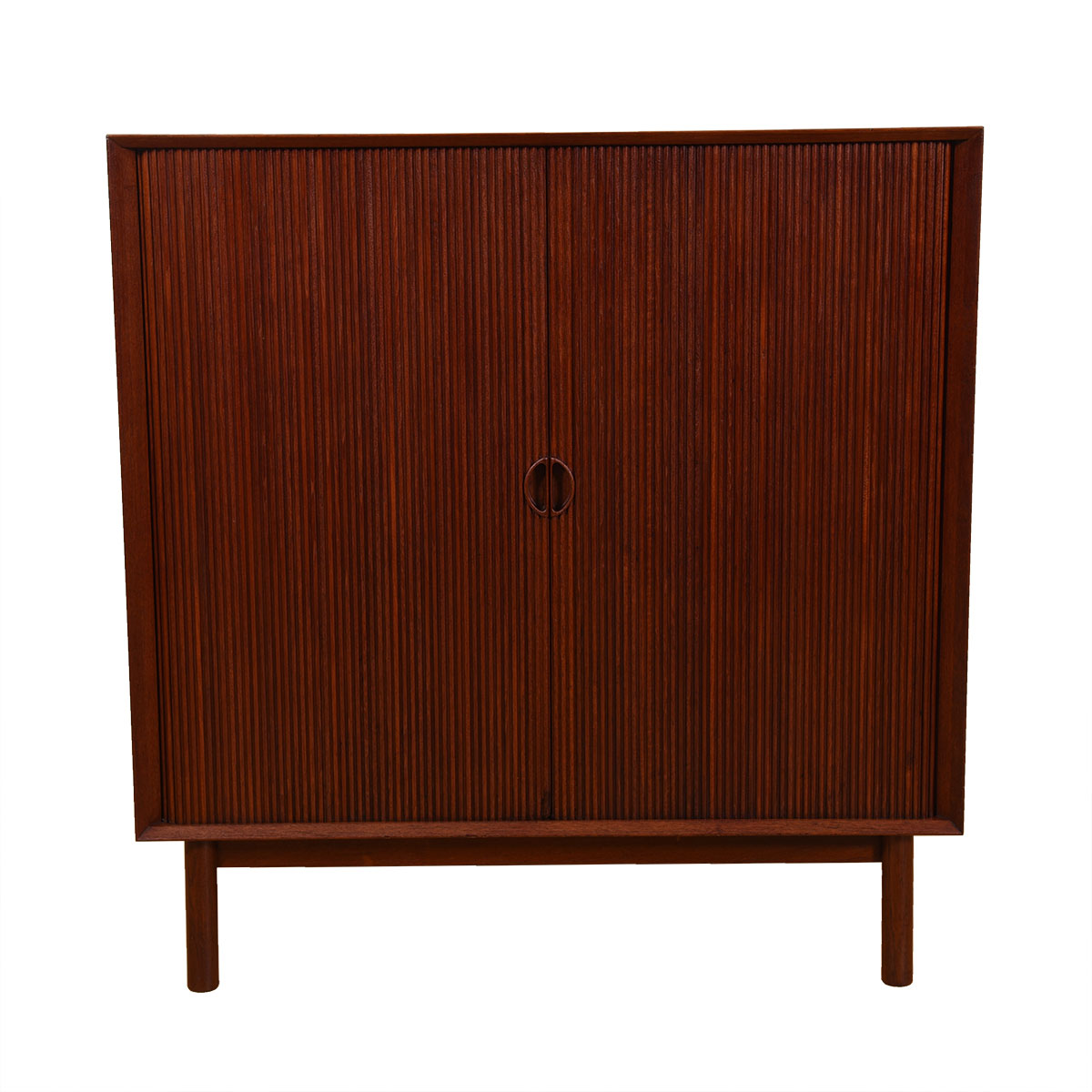 We are pleased to offer this very special cabinet in solid teak designed by Peter Hvidt. It features two large tambour doors that open from the middle. Shelved storage inside. The teak has aged to a deep, dark perfection. Use alone or with some of the other Peter Hvidt storage pieces we offer.