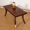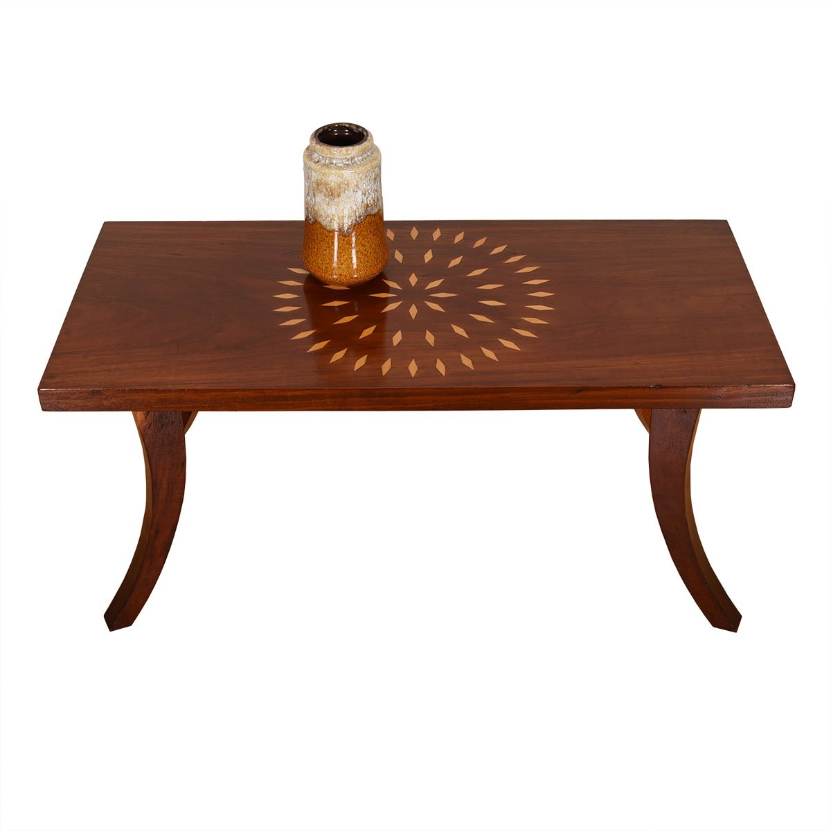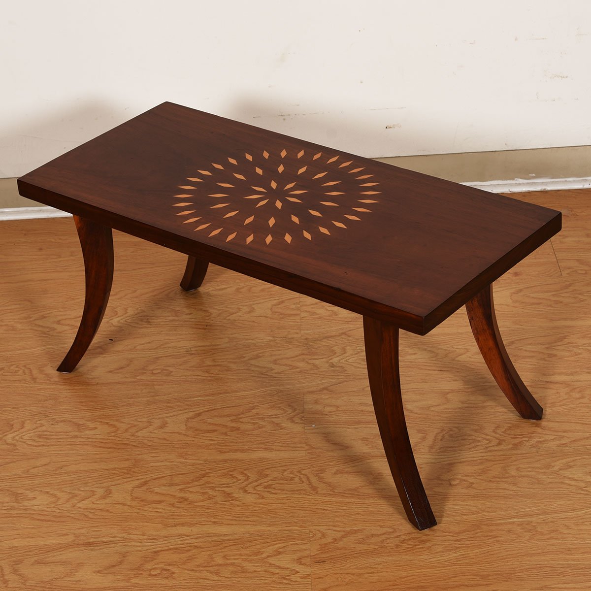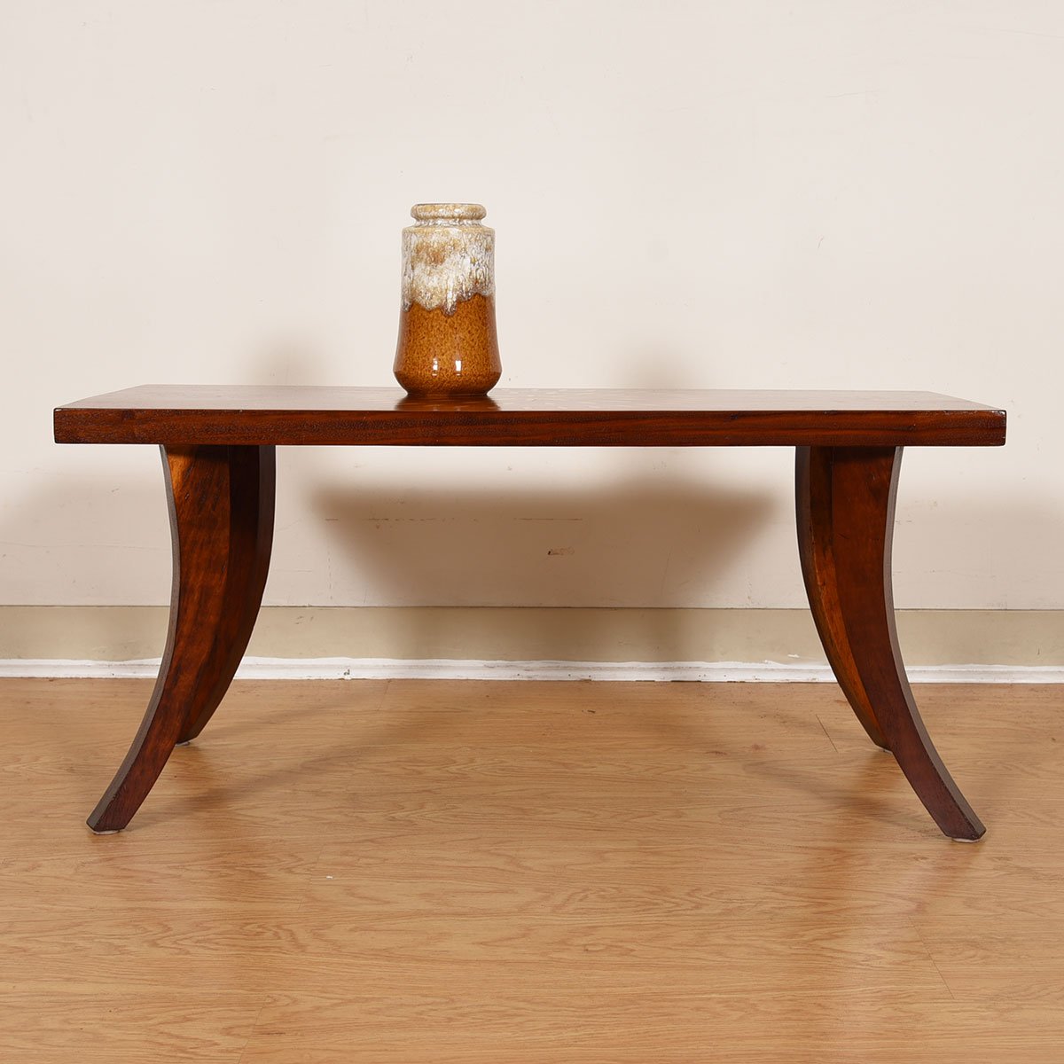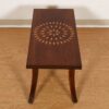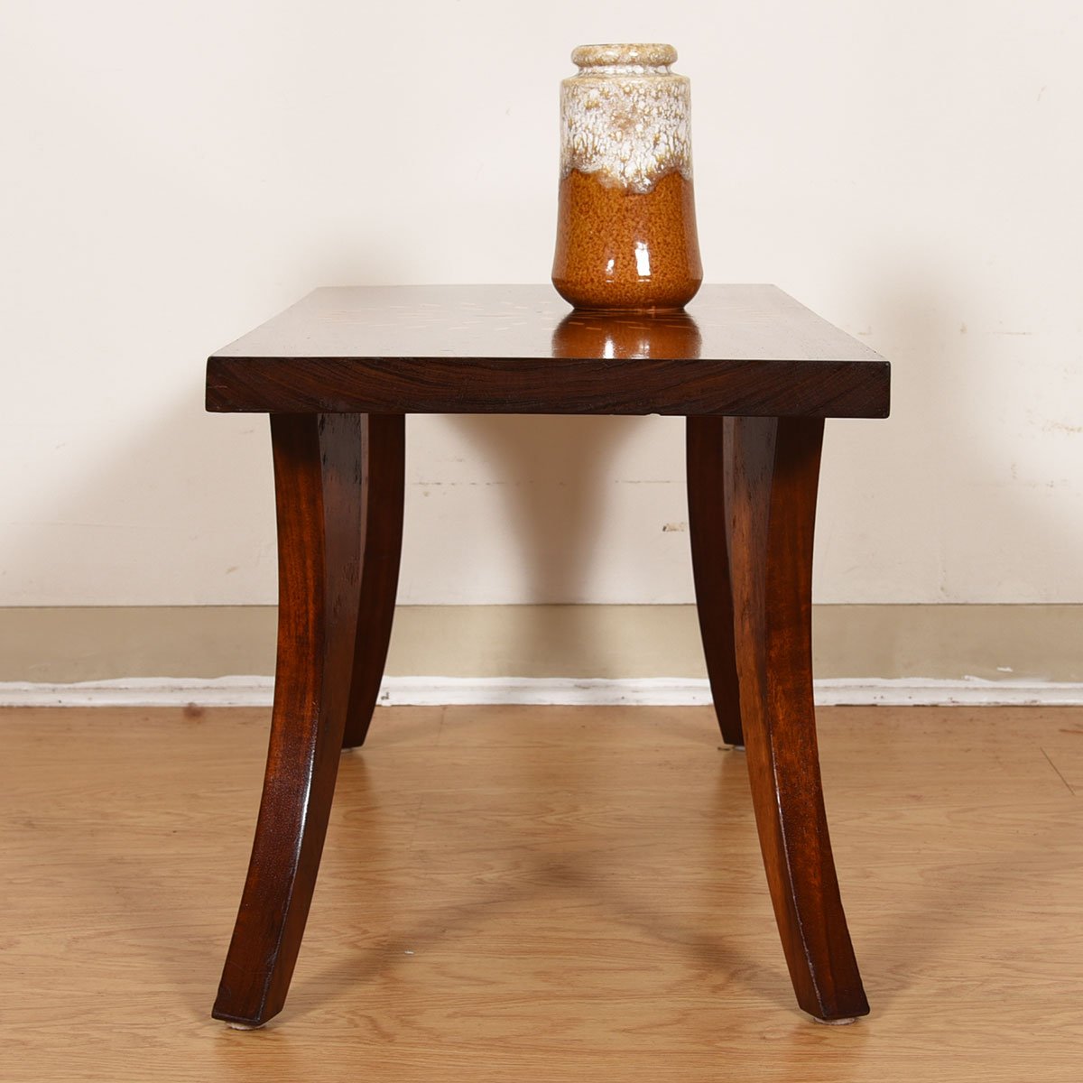 Wonderful design elements are captured on this delightful table crafted of redwood. On the table top, a lighter wood marquetry pattern has been inlaid and the shape of the legs gives the piece real personality. Very sturdy, it could also be used as a bench.