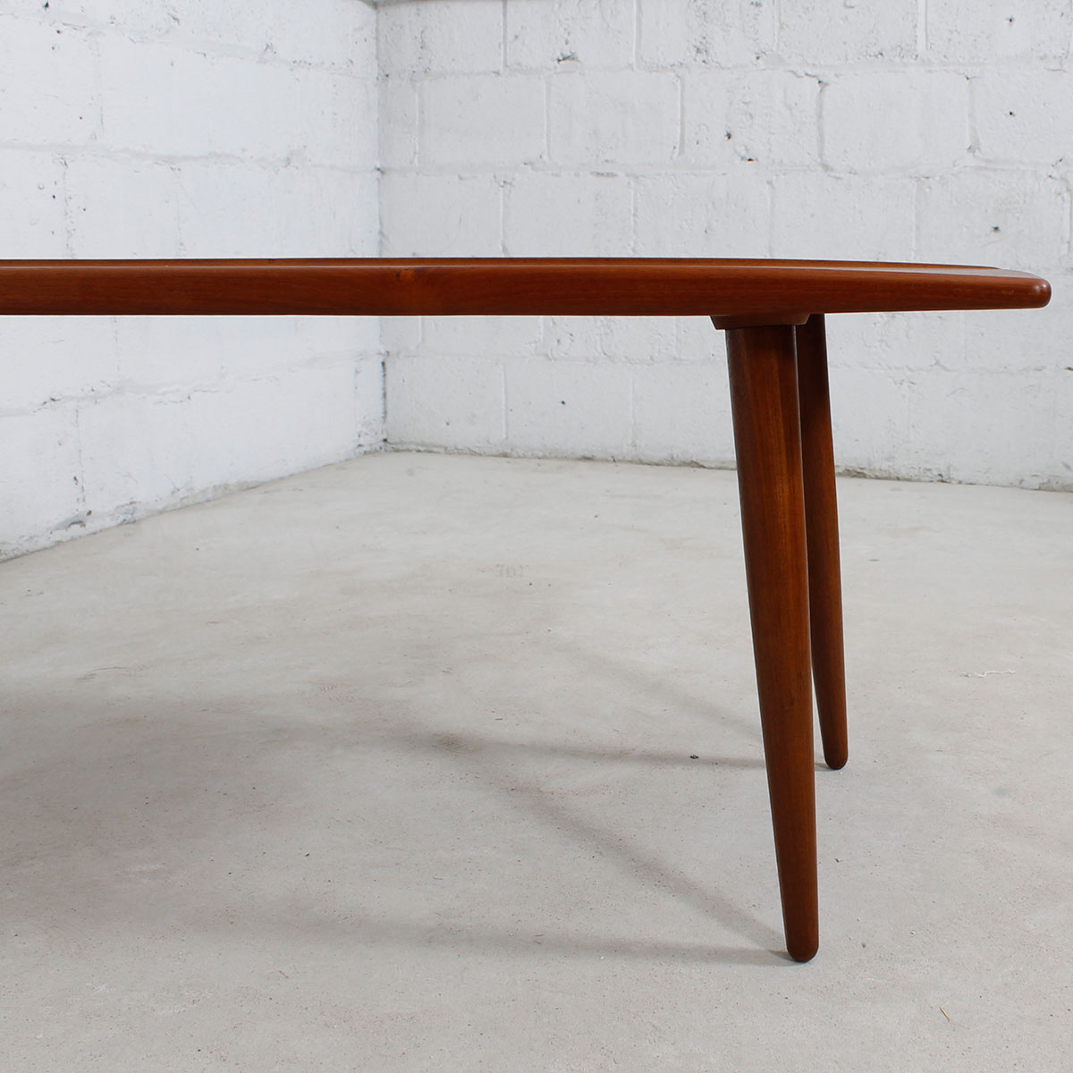Riding the crest of cool is this long Danish Modern teak coffee table with a surfboard shape. It has gentle raised edges on the long sides and ever-so-slightly splayed legs. The teak has nicely aged to a rich patina. This table is a classic beauty!