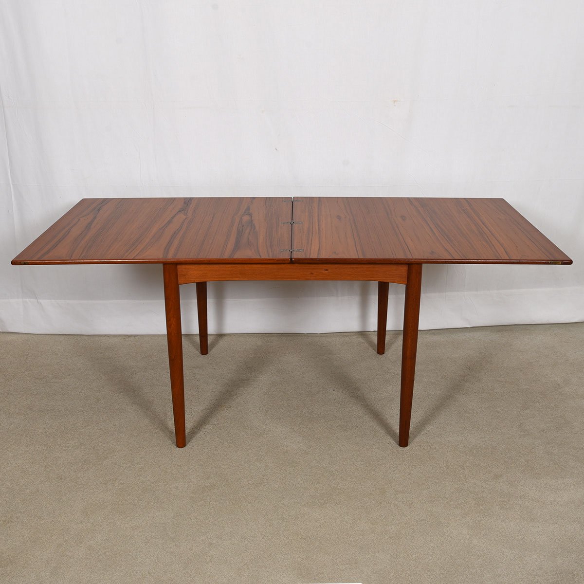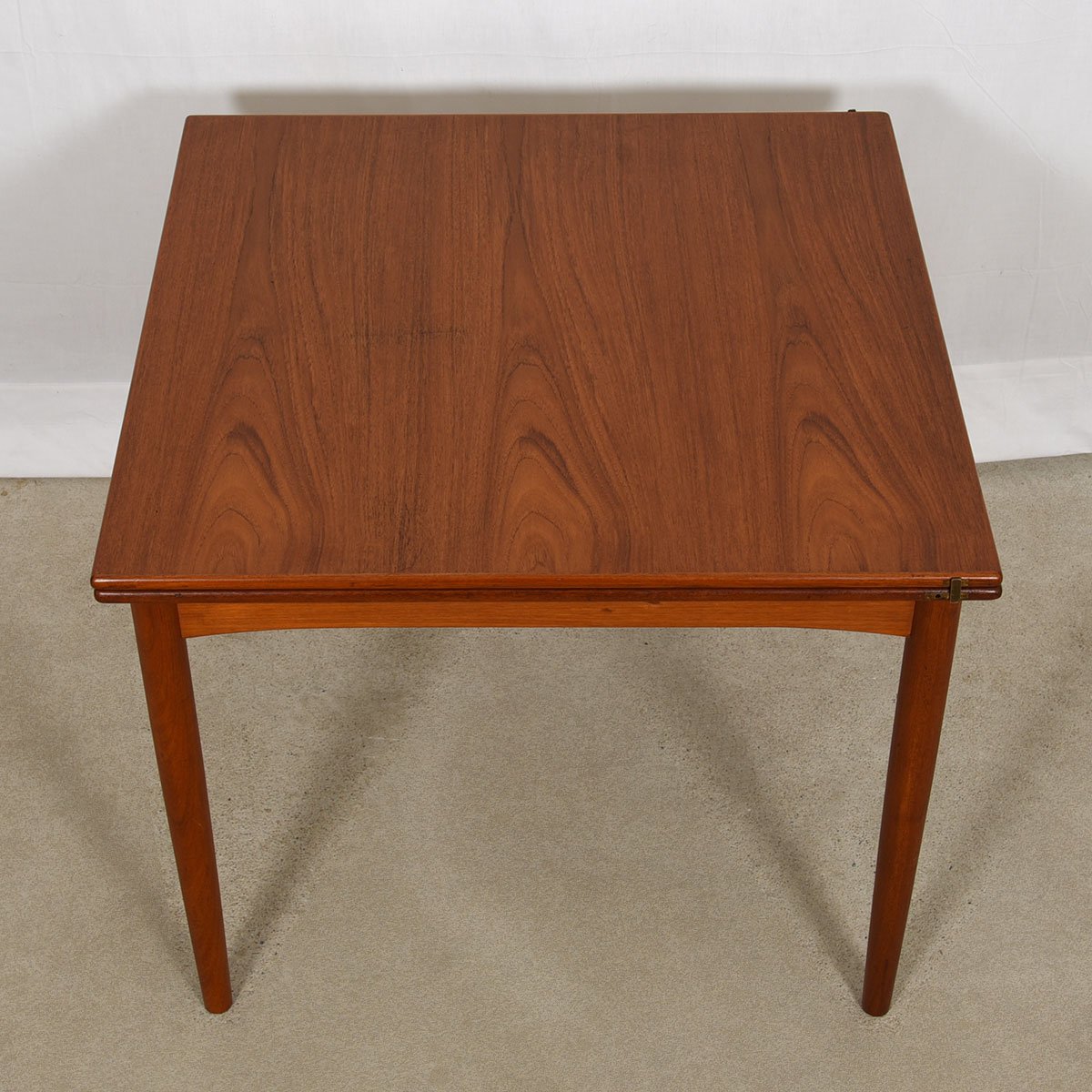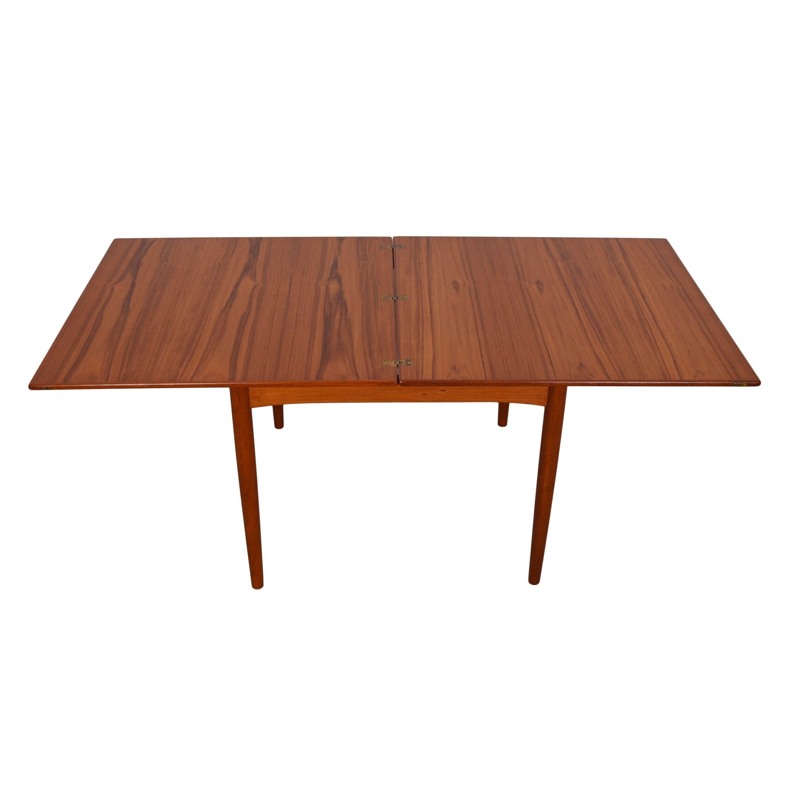 Ingenious Danish design is at work in this beautiful and practical teak table. It goes from a square to doubling its size as a rectangle by lifting the top, swiveling it a half turn and opening the top.The teak on this piece is especially beautiful. Original ‘Old School’ Brass Hinges Prevent Movement While in the Closed Position and lies flat while open. Turned legs and a graceful apron complete this wonderful dining table.