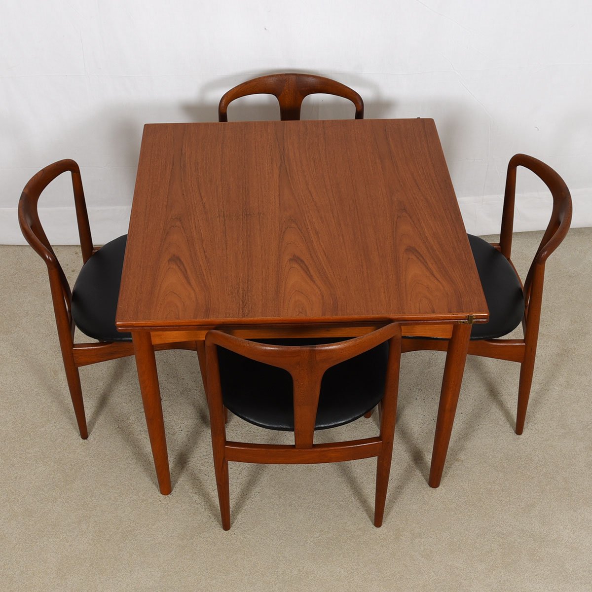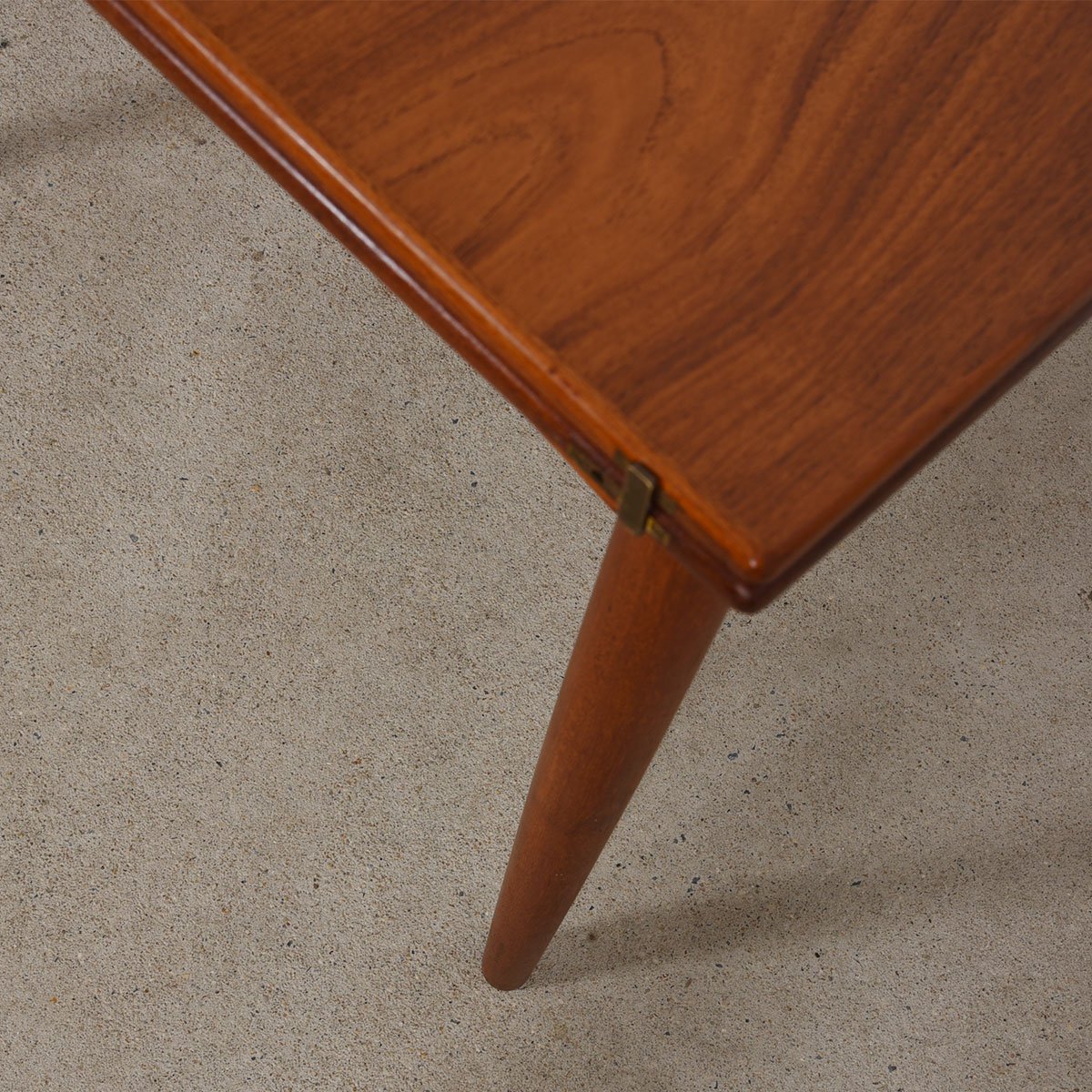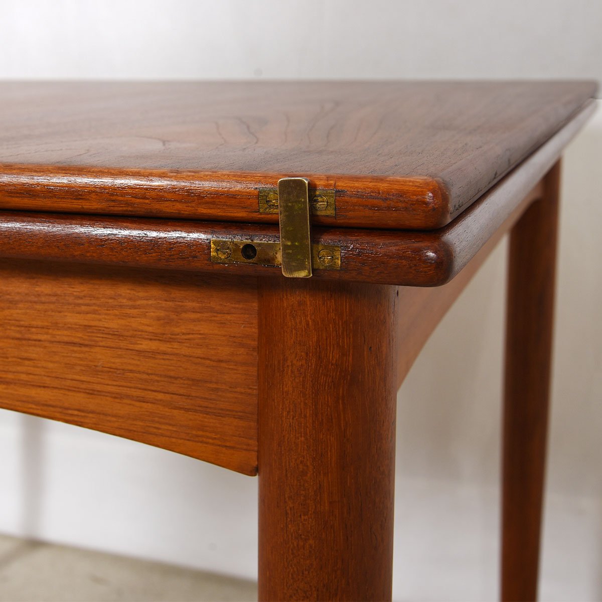 Ingenious Danish design is at work in this beautiful and practical teak table. It goes from a square to doubling its size as a rectangle by lifting the top, swiveling it a half turn and opening the top.The teak on this piece is especially beautiful. Original ‘Old School’ Brass Hinges Prevent Movement While in the Closed Position and lies flat while open. Turned legs and a graceful apron complete this wonderful dining table.