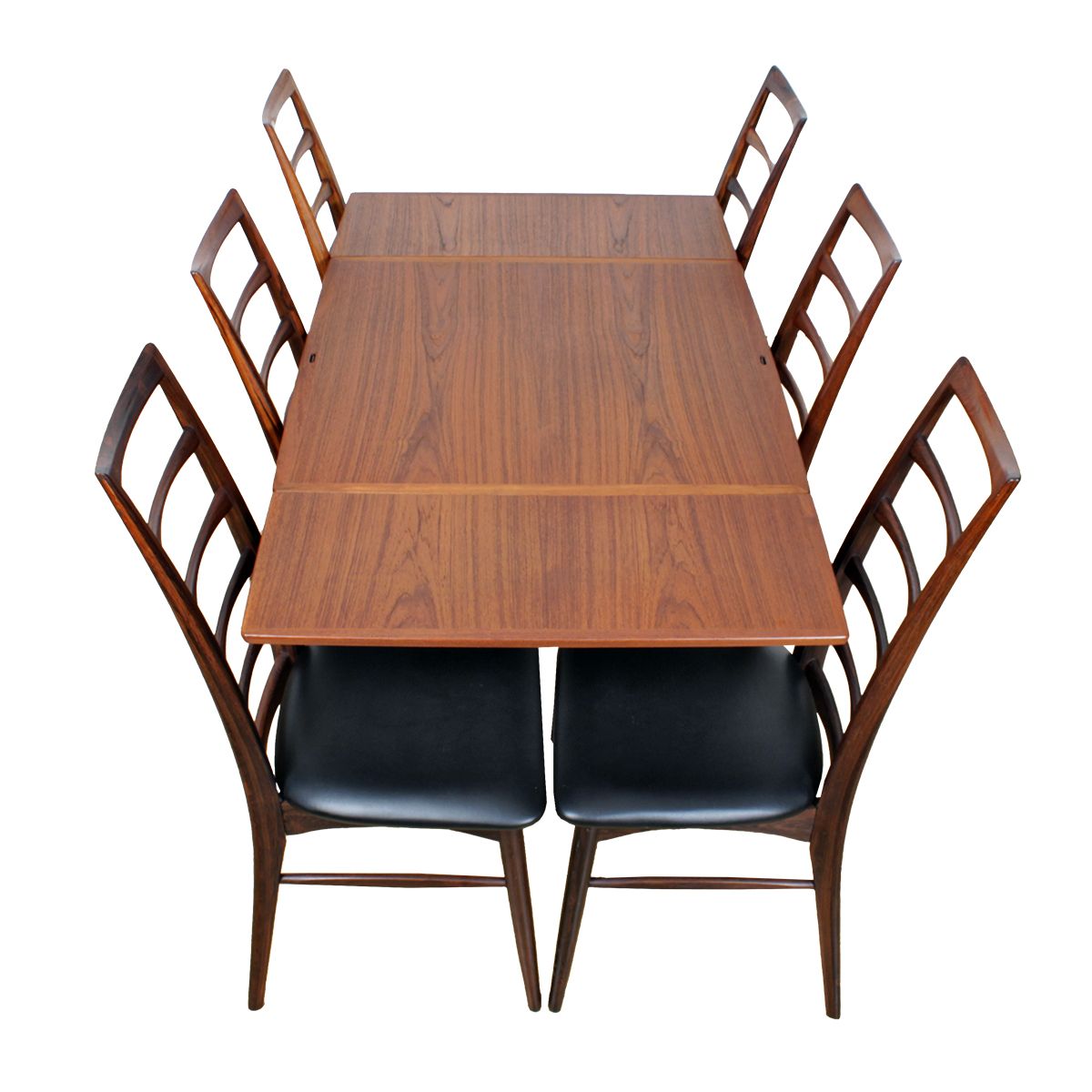 - Beautiful Danish teak dining table has a ‘Flip-Top’: one side is teak, the other side is black leatherette