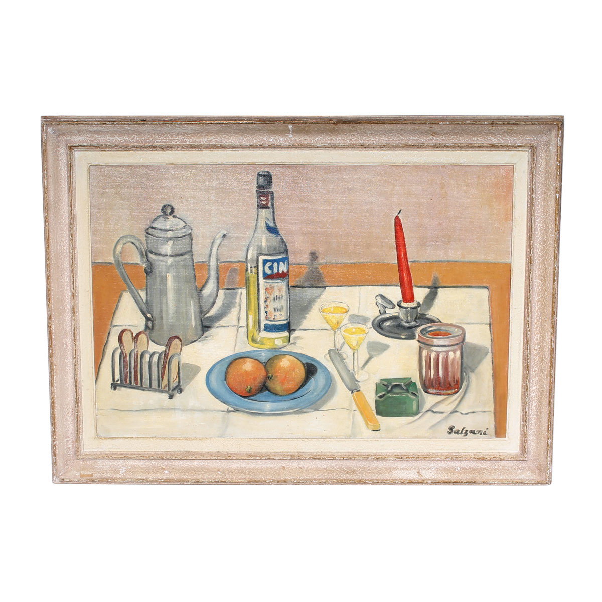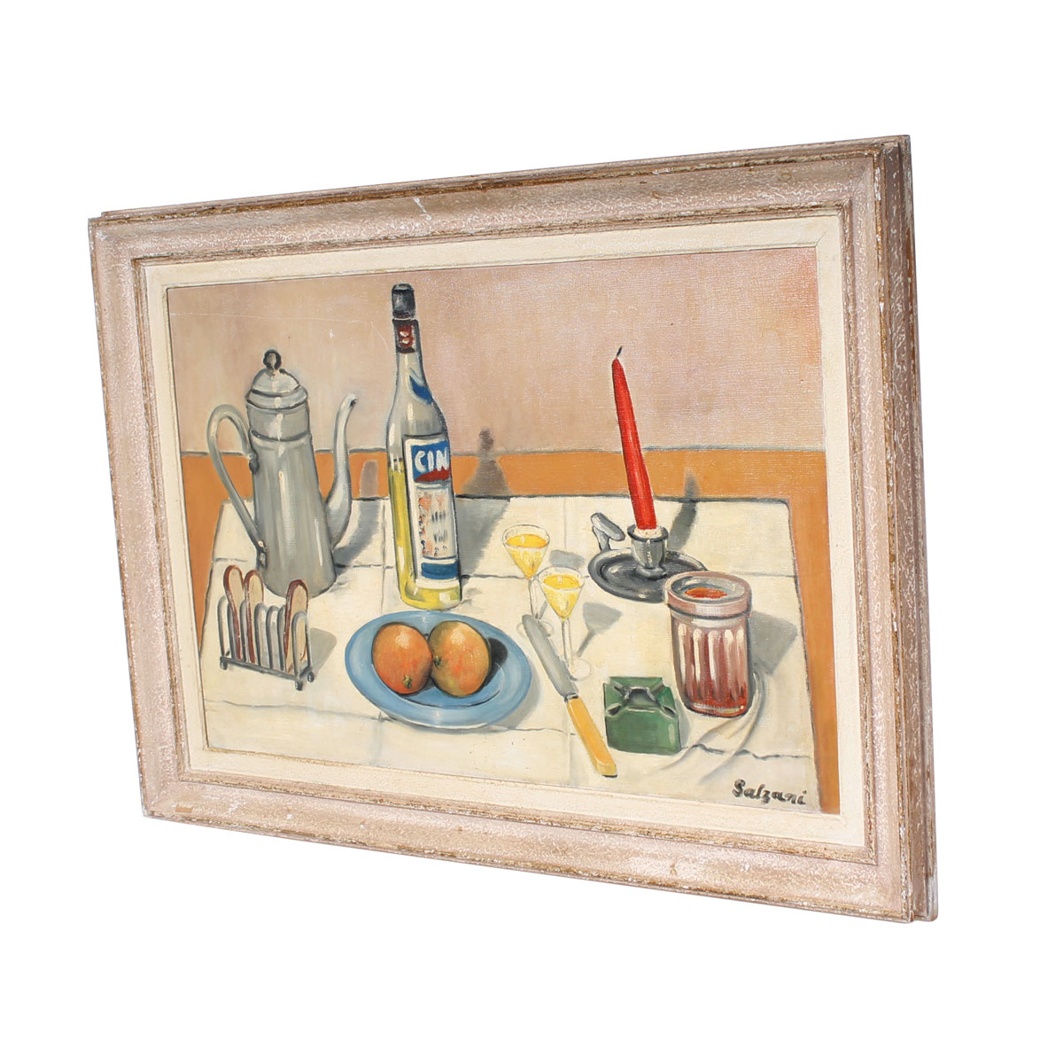Fantastic modern still life circa ’50s, evocative of breakfast in Rome with toast, coffee, blood oranges, jam – and of course, an ashtray, aperitif and a bottle of Cinzano. La dolce vita! Realismo style combined with a softer palette make this extremely interesting. Oil on canvas and a wonderful period frame. Signed Salzani (Maurice Salzani).