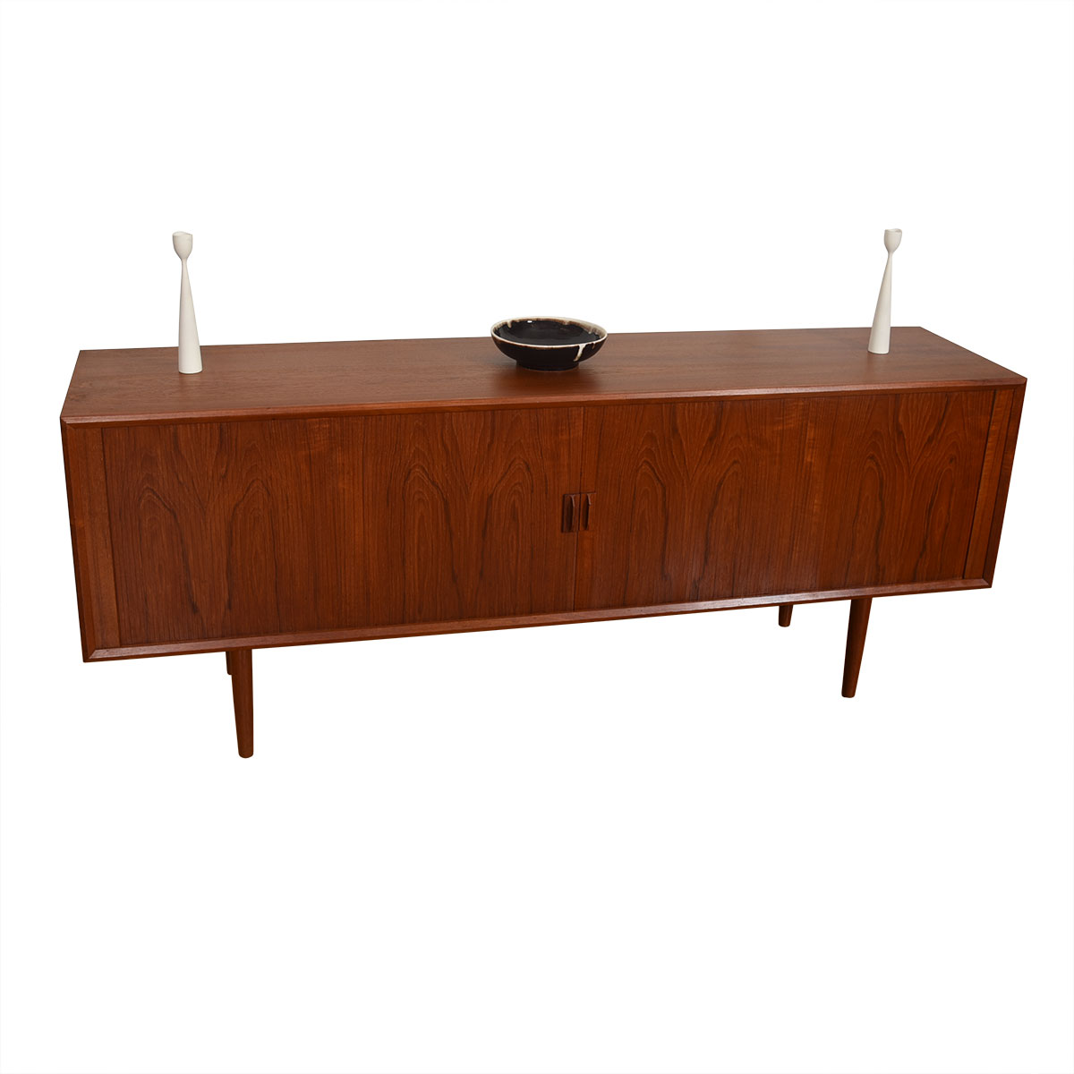A Danish Modern teak sideboard / room divider. Featuring tambour doors that slide open to reveal four felt lined drawers & two adjustable shelves. The backside is fully finished, allowing it to be placed in the middle of a room and used as a room divider.
