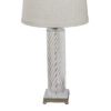 This is a pair of glamorous lamps. Each has a glass column with a tightly coiled spiral going up the cylinder that catches the light. The chrome base accentuates the silvery effect. The lamps hold two bulbs, each with a pull chain to turn it on and off so you can have one or both bulbs lit.