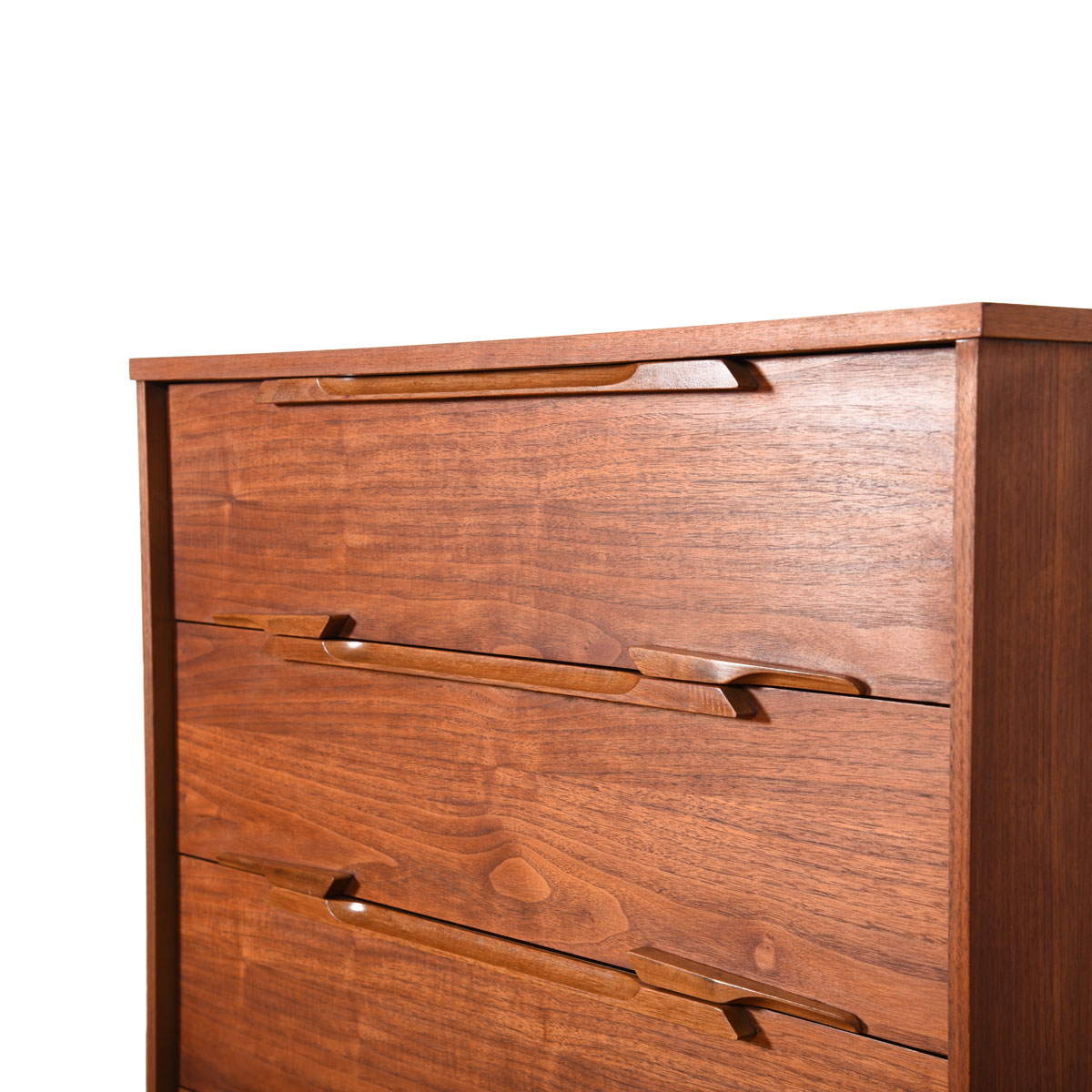 - On both the top and bottom of each drawer, the interlocking handles are the focus of the piece.
