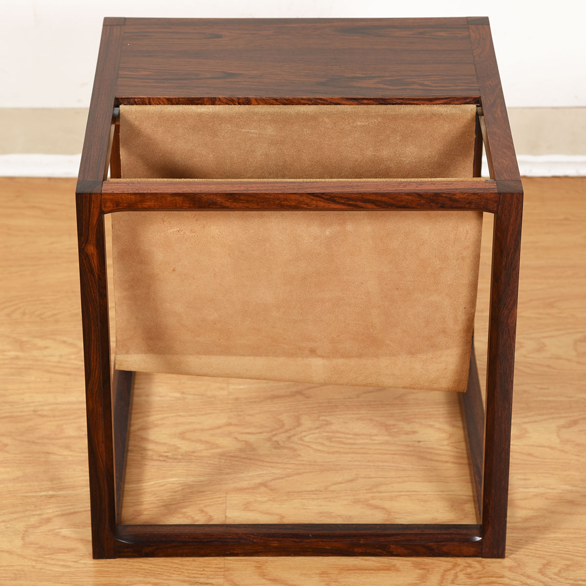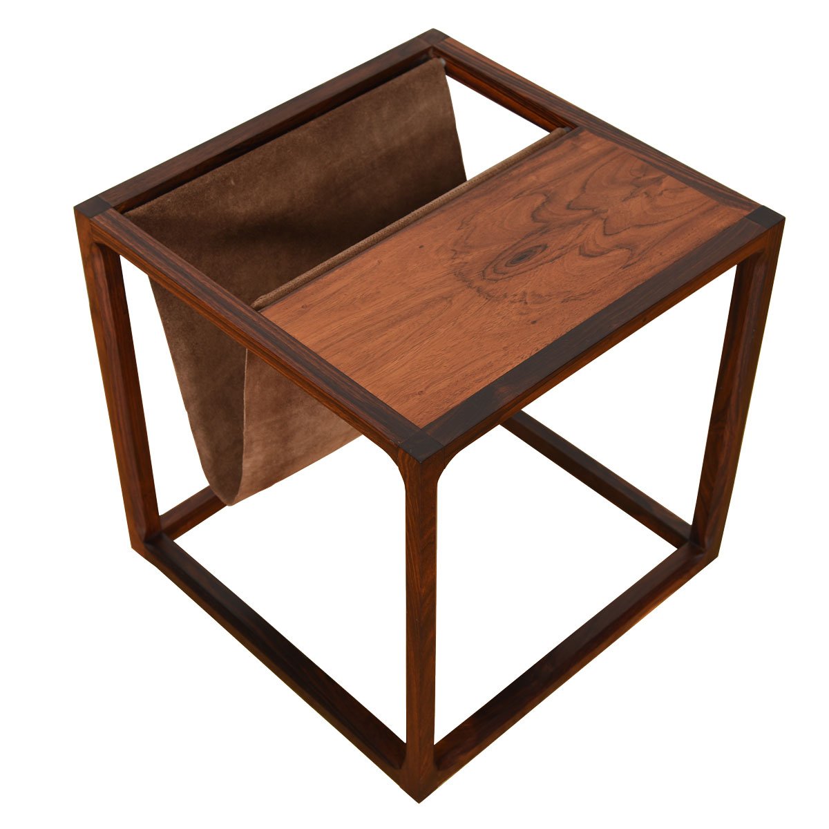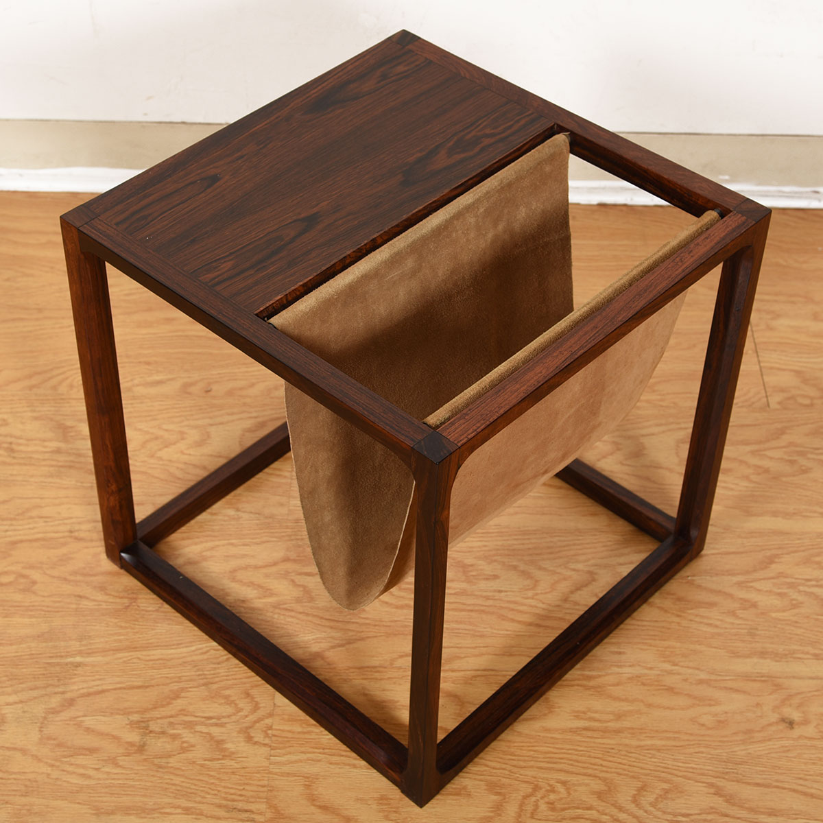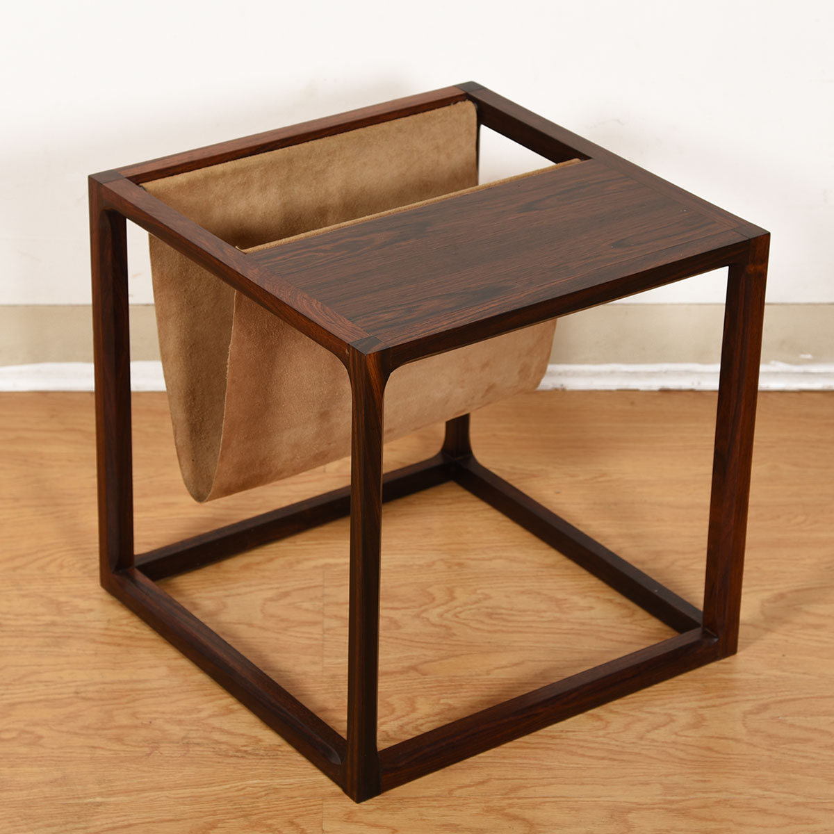 An open cube frame in luxurious rosewood features a table top with a suede sling for magazine storage, providing great functionality on this minimalist accent table. The rosewood has mellowed to a superb patina, and the mix of suede with the wood is very sexy.