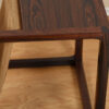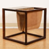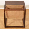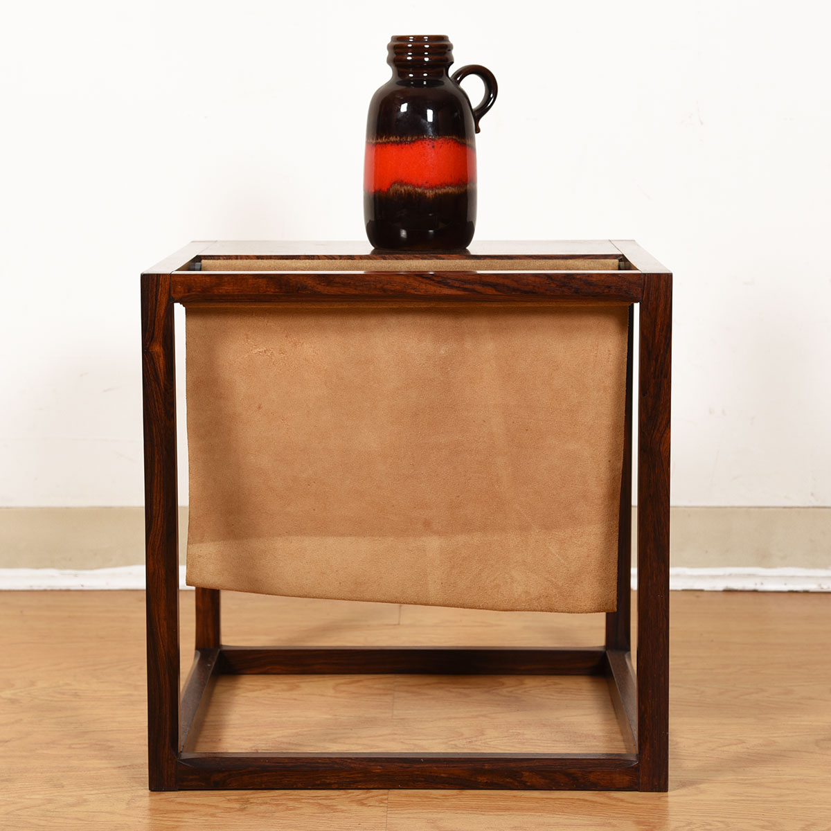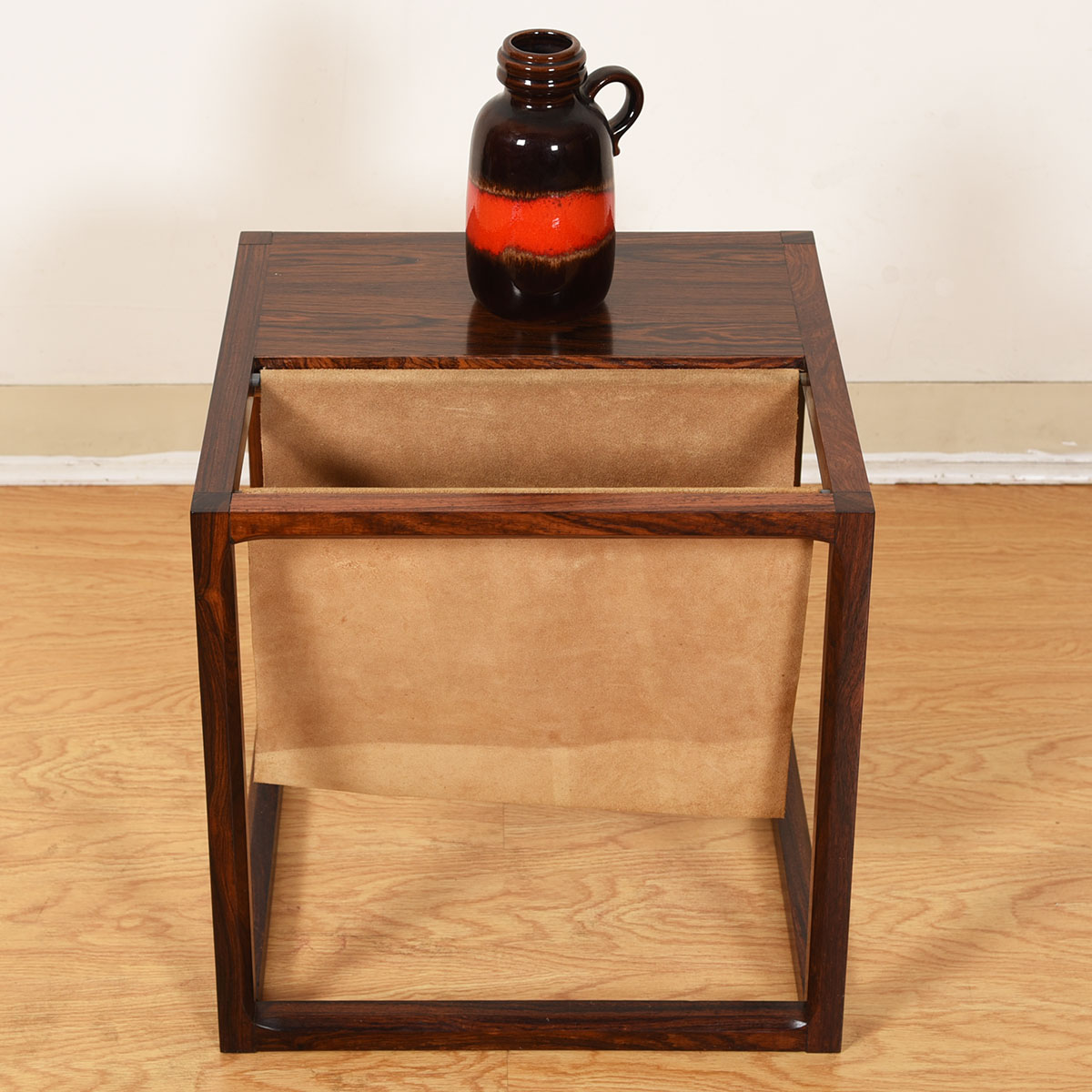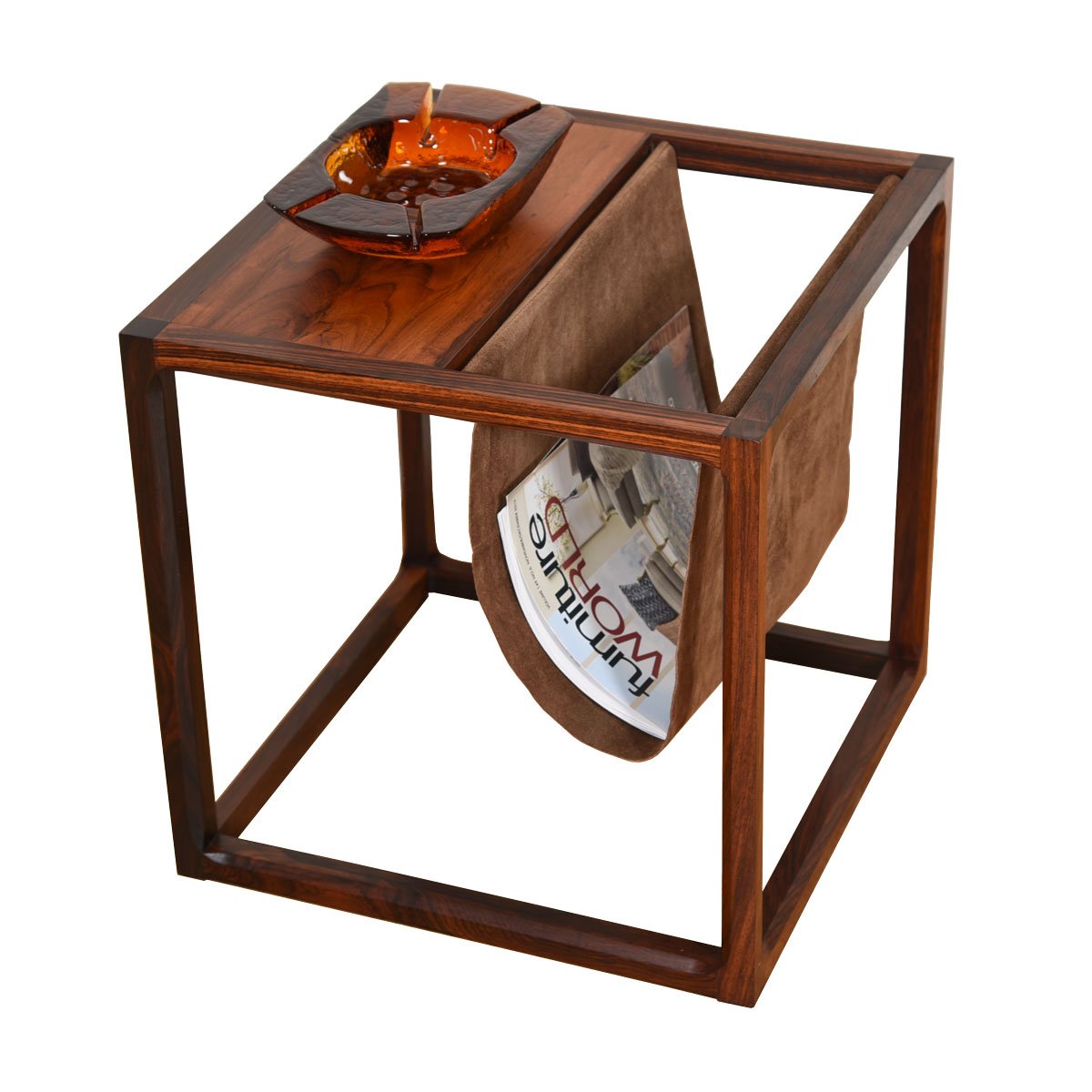 An open cube frame in luxurious rosewood features a table top with a suede sling for magazine storage, providing great functionality on this minimalist accent table. The rosewood has mellowed to a superb patina, and the mix of suede with the wood is very sexy.