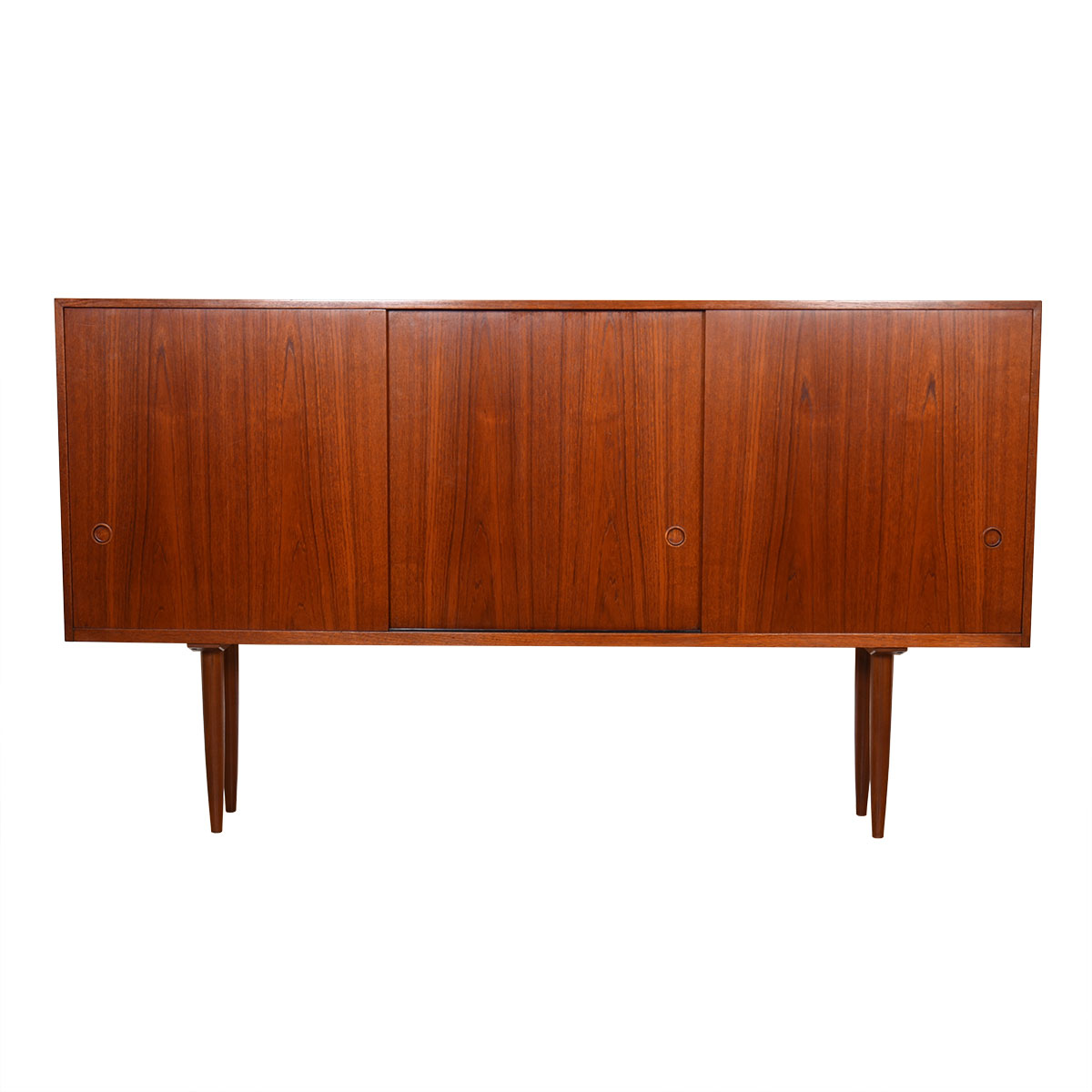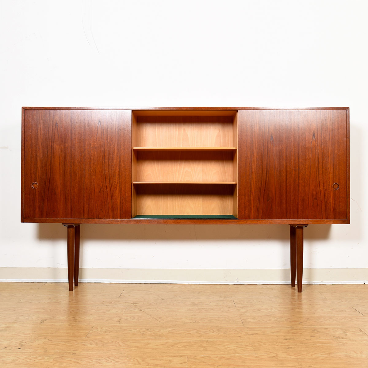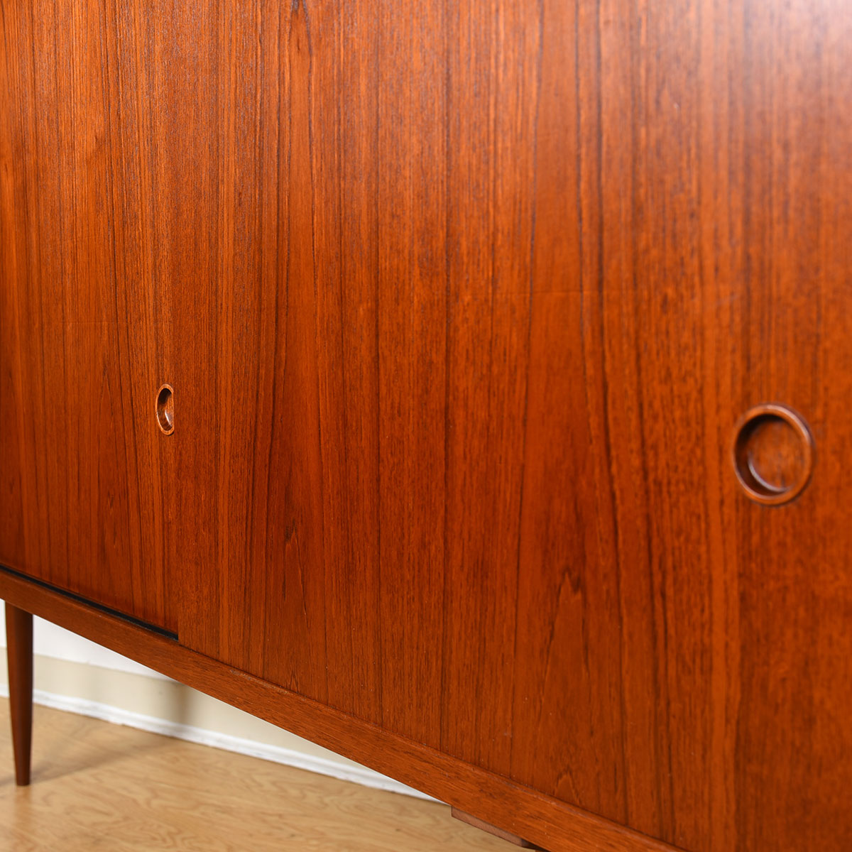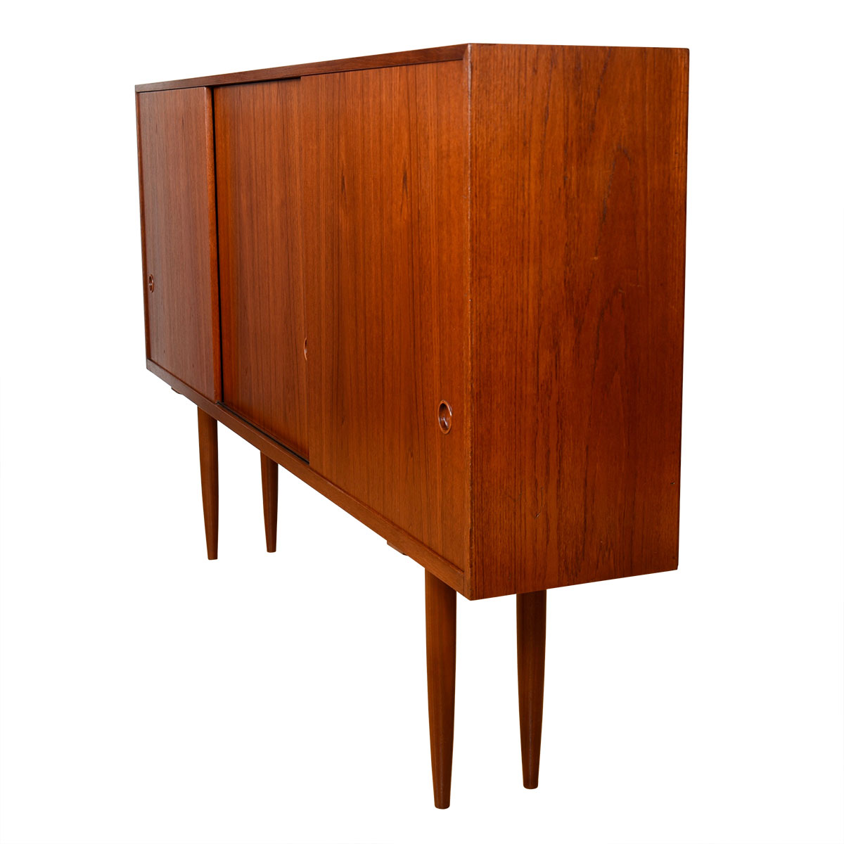 We are pleased to offer this graceful Danish Modern teak highboard with beautiful proportions. Slim in depth, the front features three sliding doors that open to adjustable shelving. The finished backside allows the piece to double as a room divider.